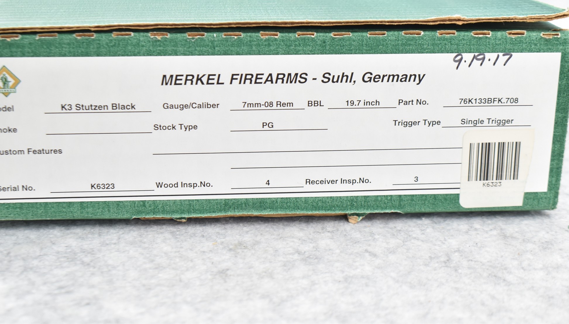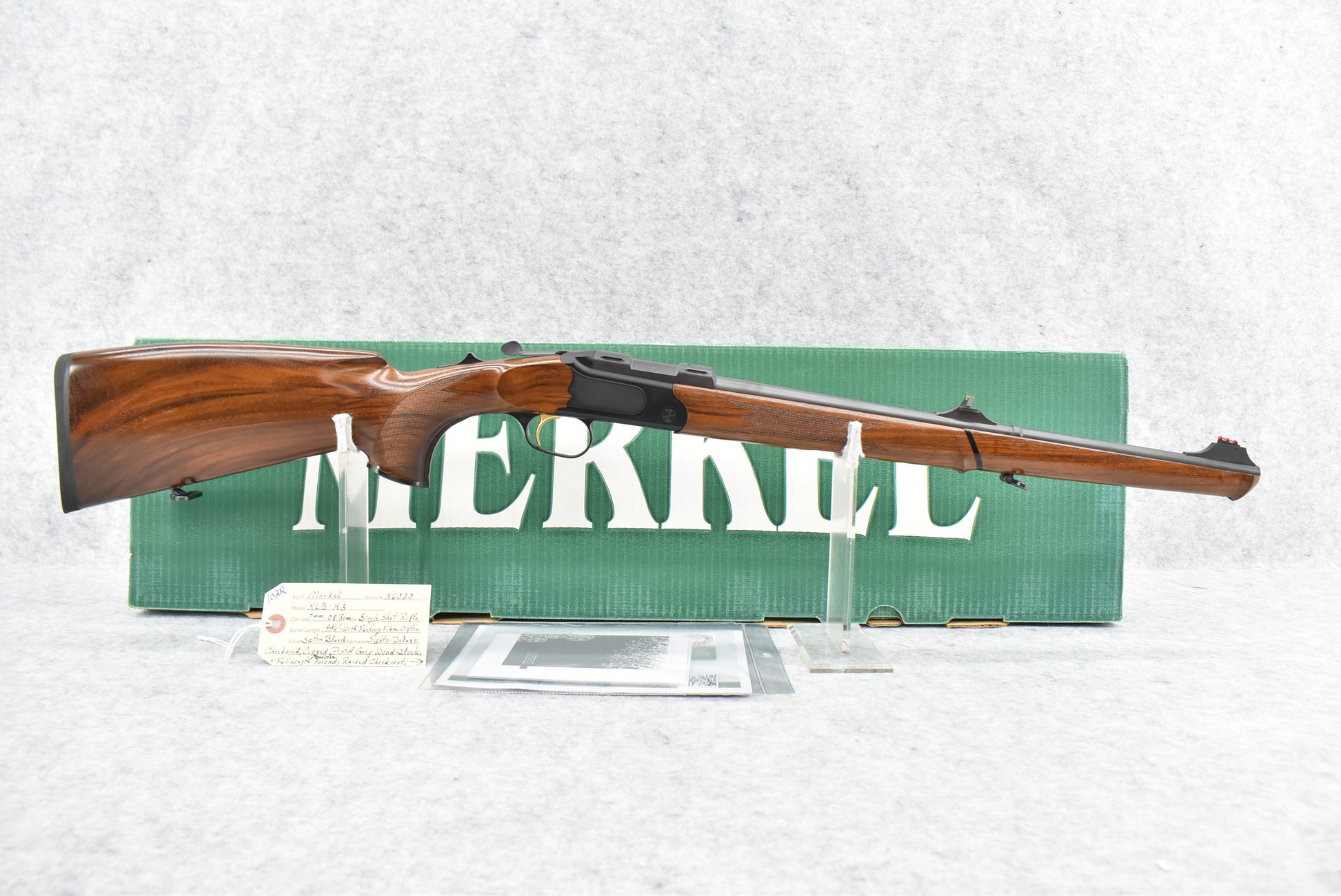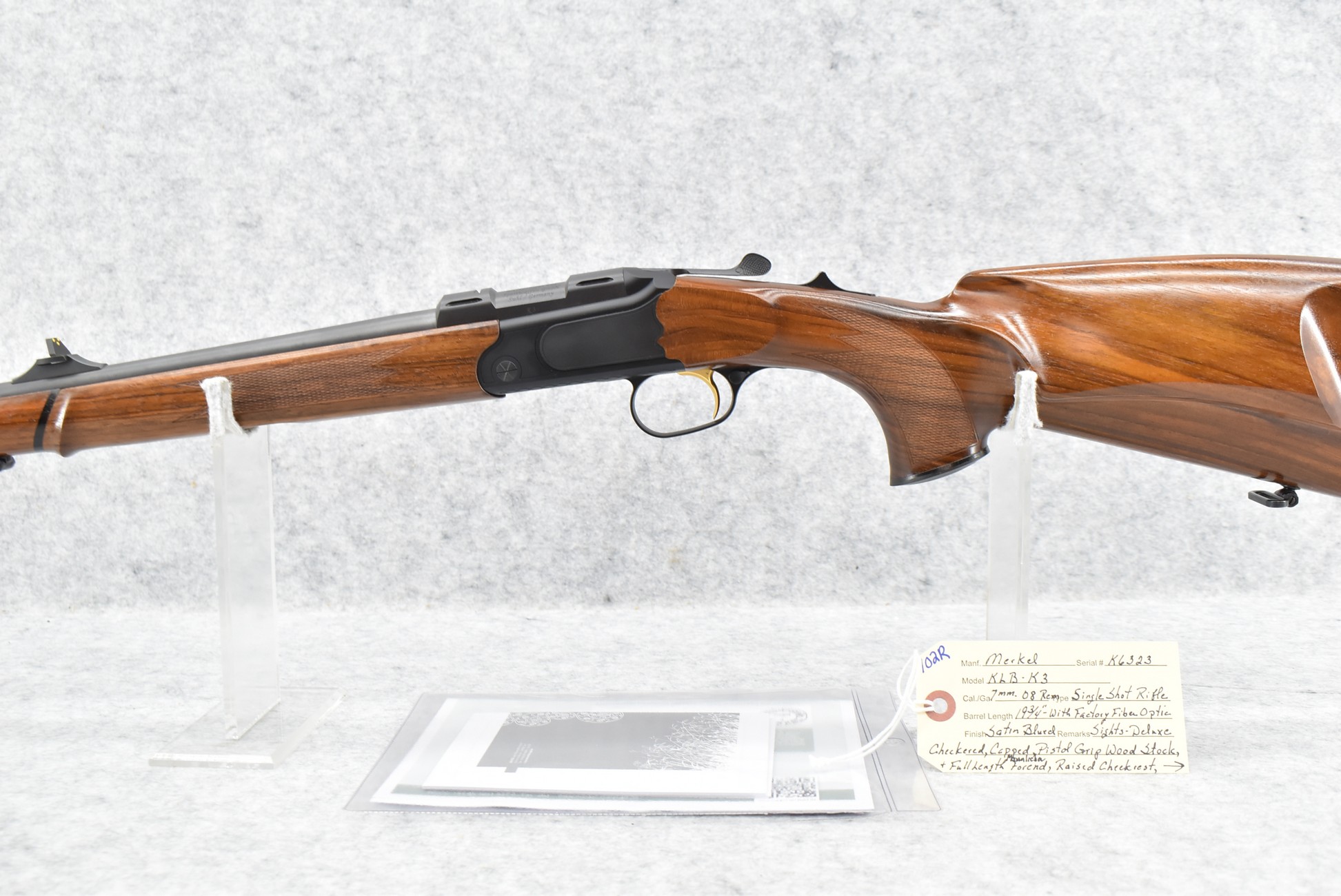 102R. Merkel – Mod. KLB-K3 – 7mm-08 Rem. Cal. Single Shot Rifle – w/19 ¾” Barrel w/Factory Fiber Optic Sights – Satin Blued Finish – w/Deluxe Checkered Capped Pistol Grip Wood Stock w/Raised Cheek Piece w/Butt Pad & Full Length Mannlicher Forend – w/Sling Loops – Unfired w/Factory Box, Manuals & Scope Rings