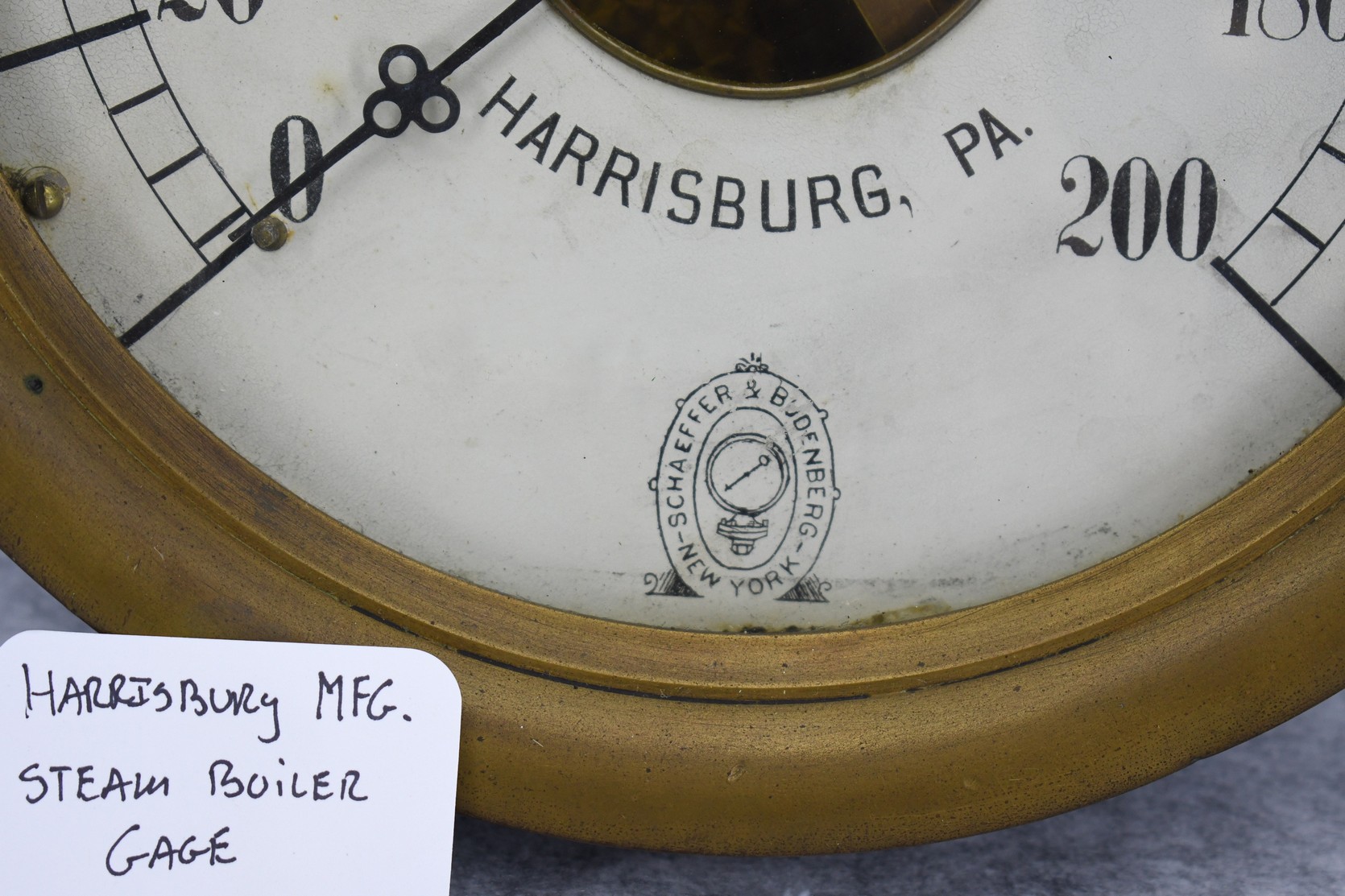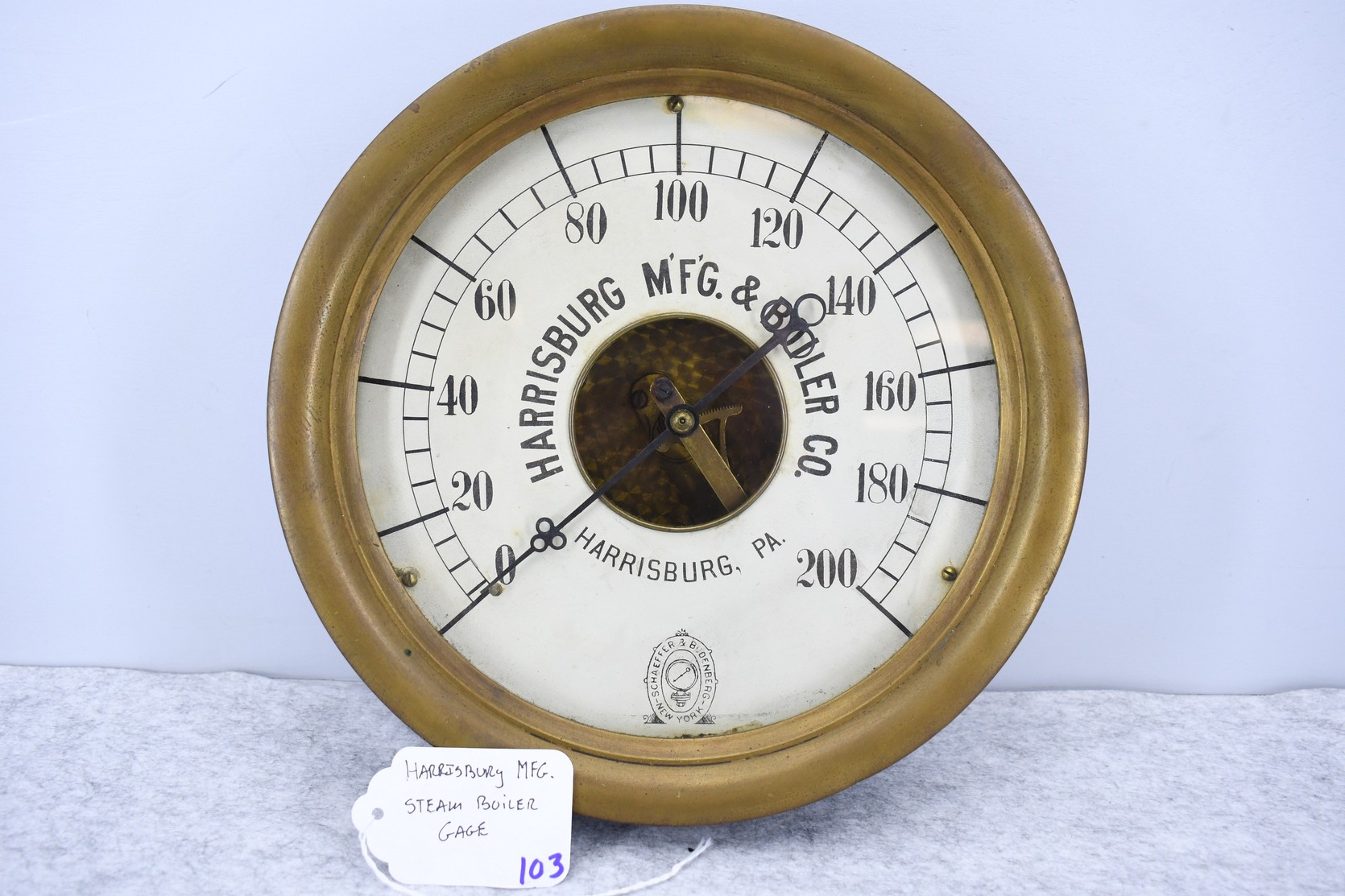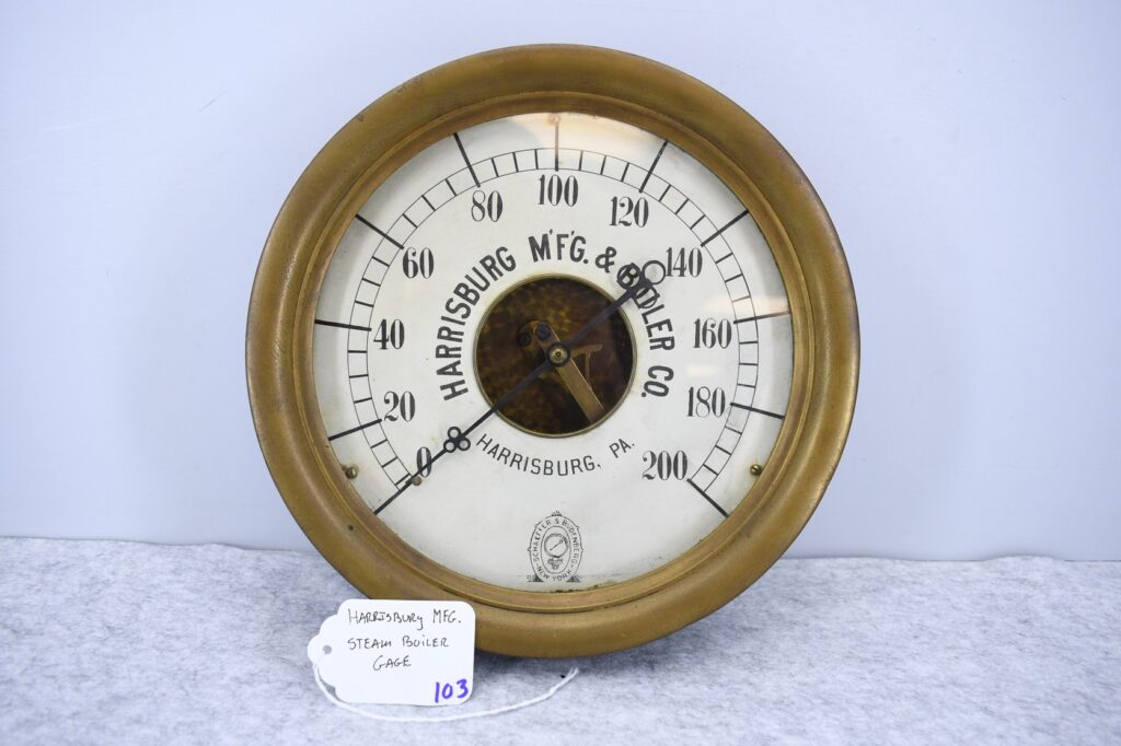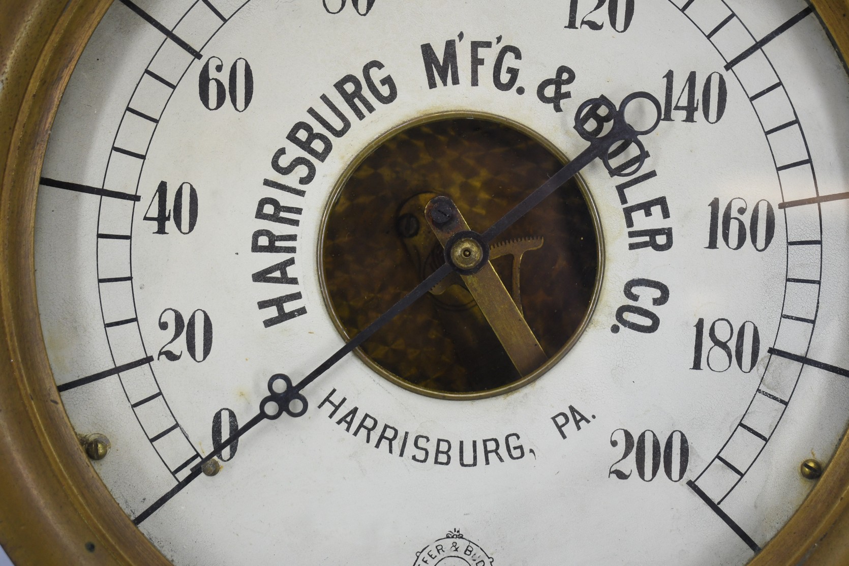 103. Harrisburg Manufacturing & Boiler Co. Harrisburg, PA Boiler Steam Pressure Gauge – Gauge has Brass Works and Brass Face – Gauge goes Up to 200LB – Gauge is Very Heavy