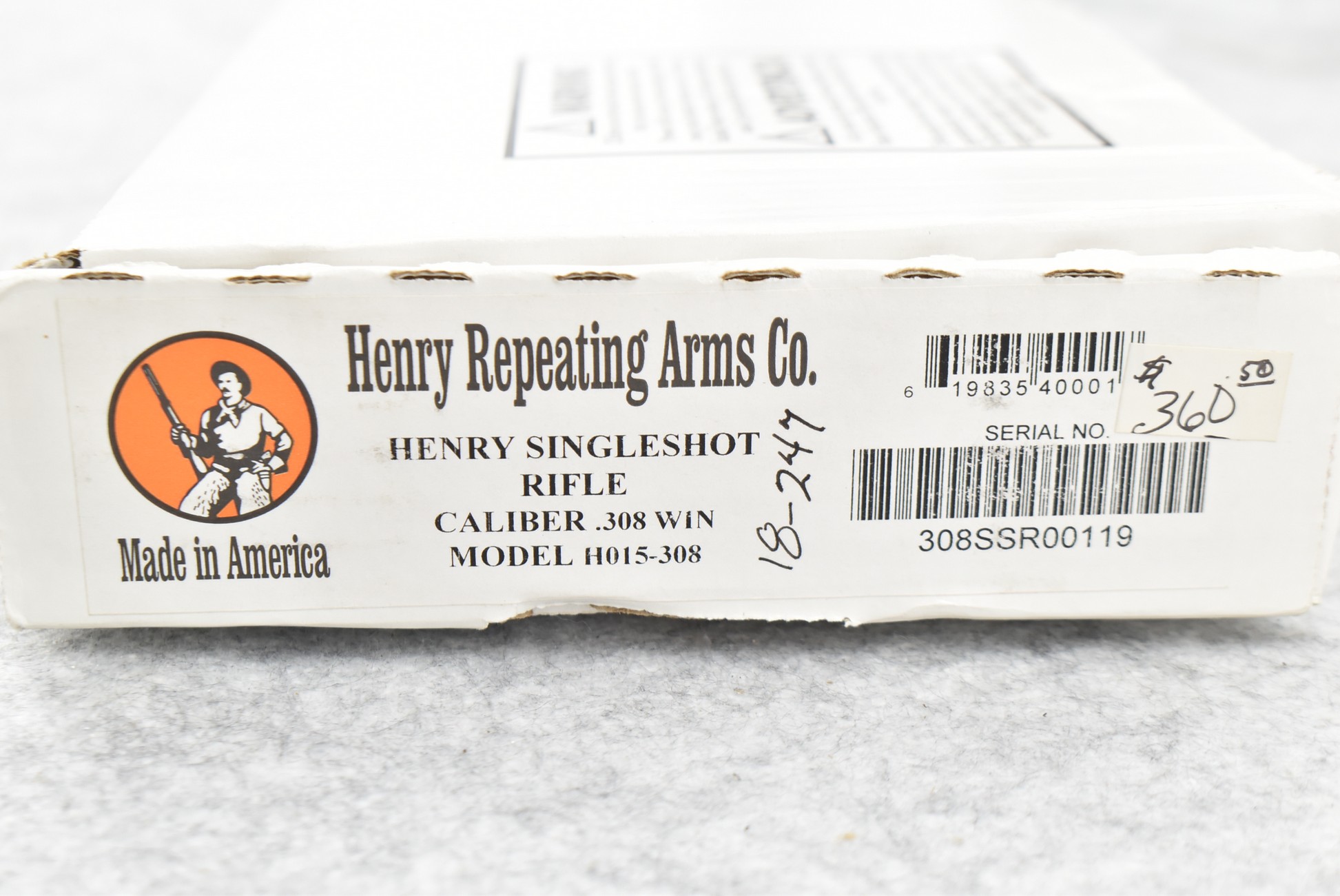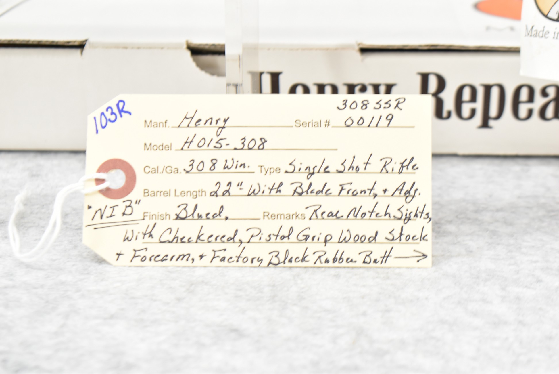 103R. Henry – Mod. H015-308 – 308 Win. Cal. Single Shot Rifle – w/22” Barrel w/Blade Front & Adj. Rear Notch Sights – Blued Finish – w/Checkered Pistol Grip Wood Stocks w/Factory Butt Pad – New w/Factory Box & Manual
