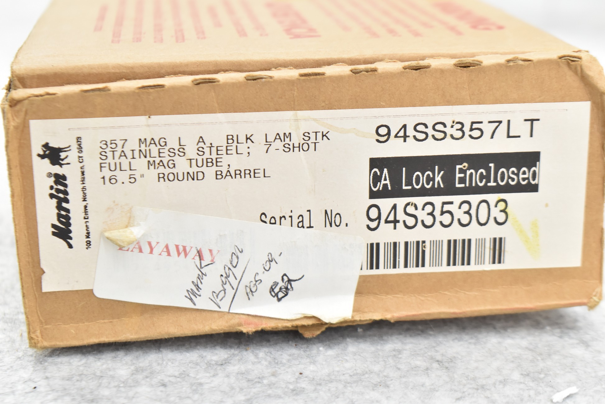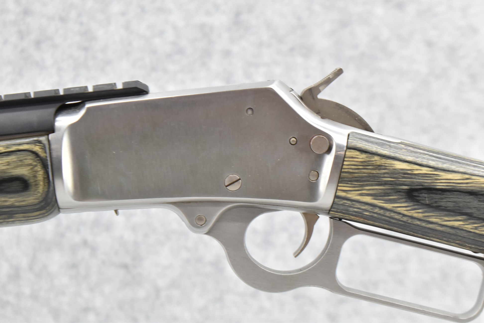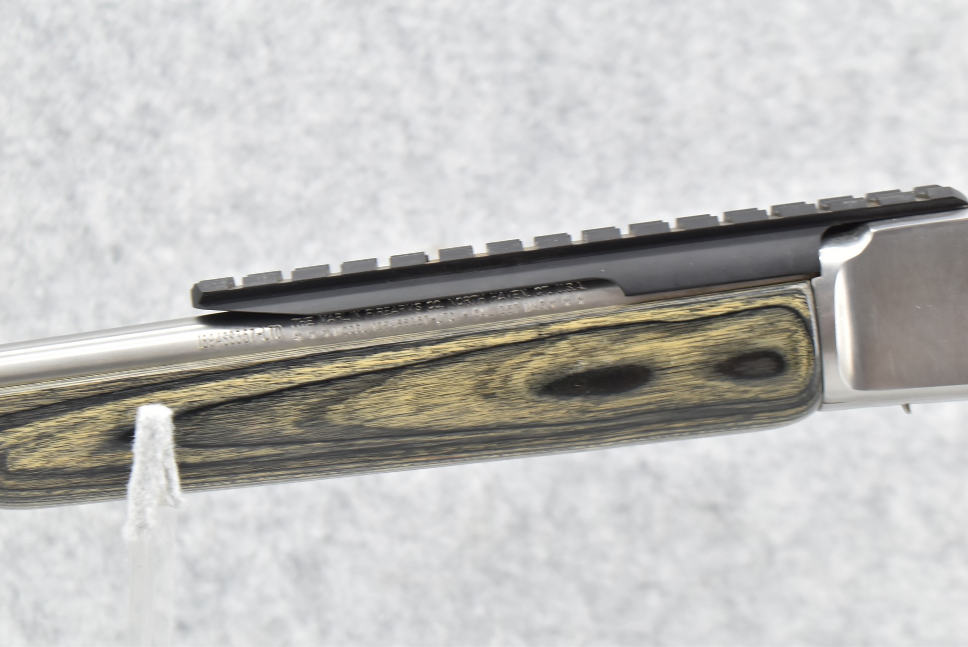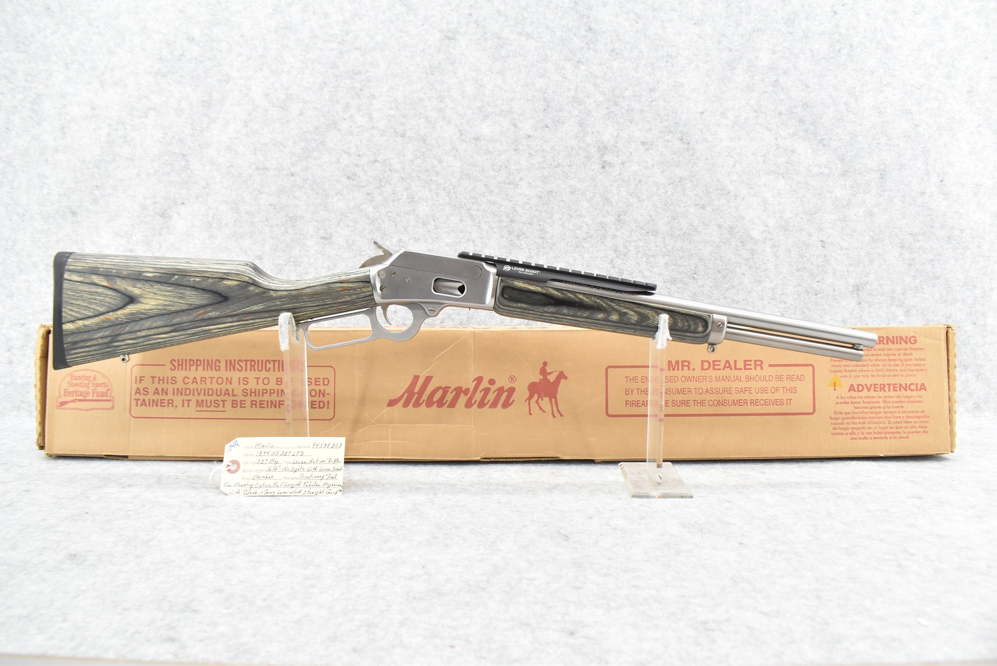 104R. Marlin – Mod. 1894 SS 357 LTD – 357 Mag. Cal. Lever Action Rifle – w/16 ½” Barrel (No Sights) w/Full Length Tubular Magazine – Stainless Finish – w/Black & Gray Laminated Straight Grip Wood Stocks w/Factory Butt Pad – w/Lever Scout Picatinny Rail for Mounting Optics – w/Factory Box, Manuals, Original Sights & Accessories – Very Limited Production, Rare Gun! – Mfg. Between 2002-2011 – As New!