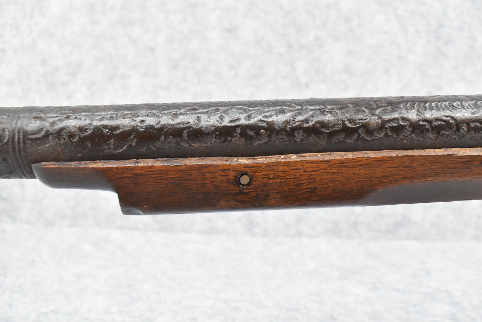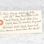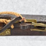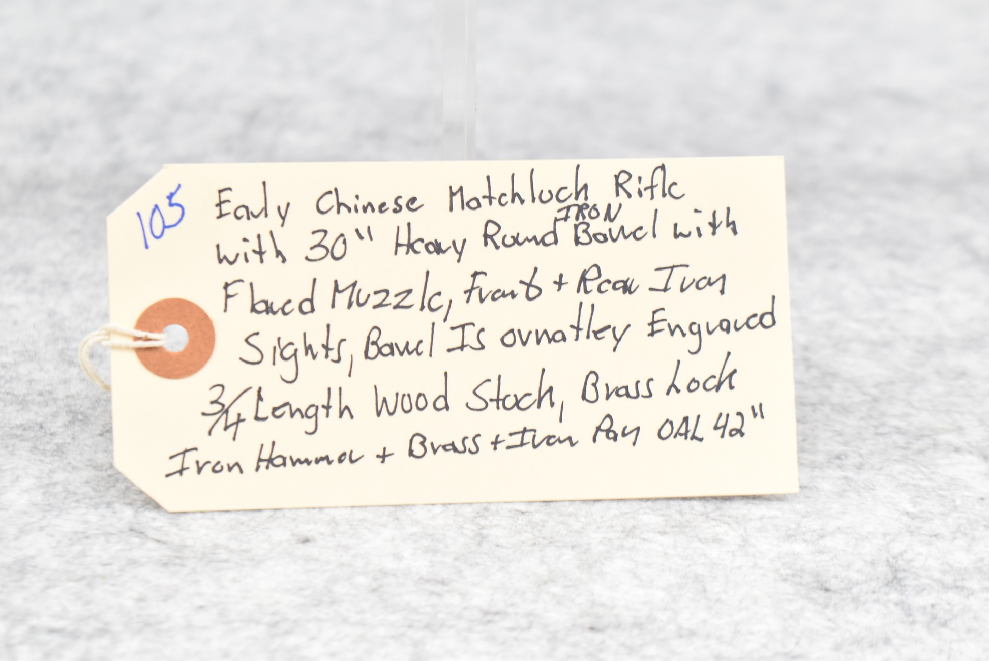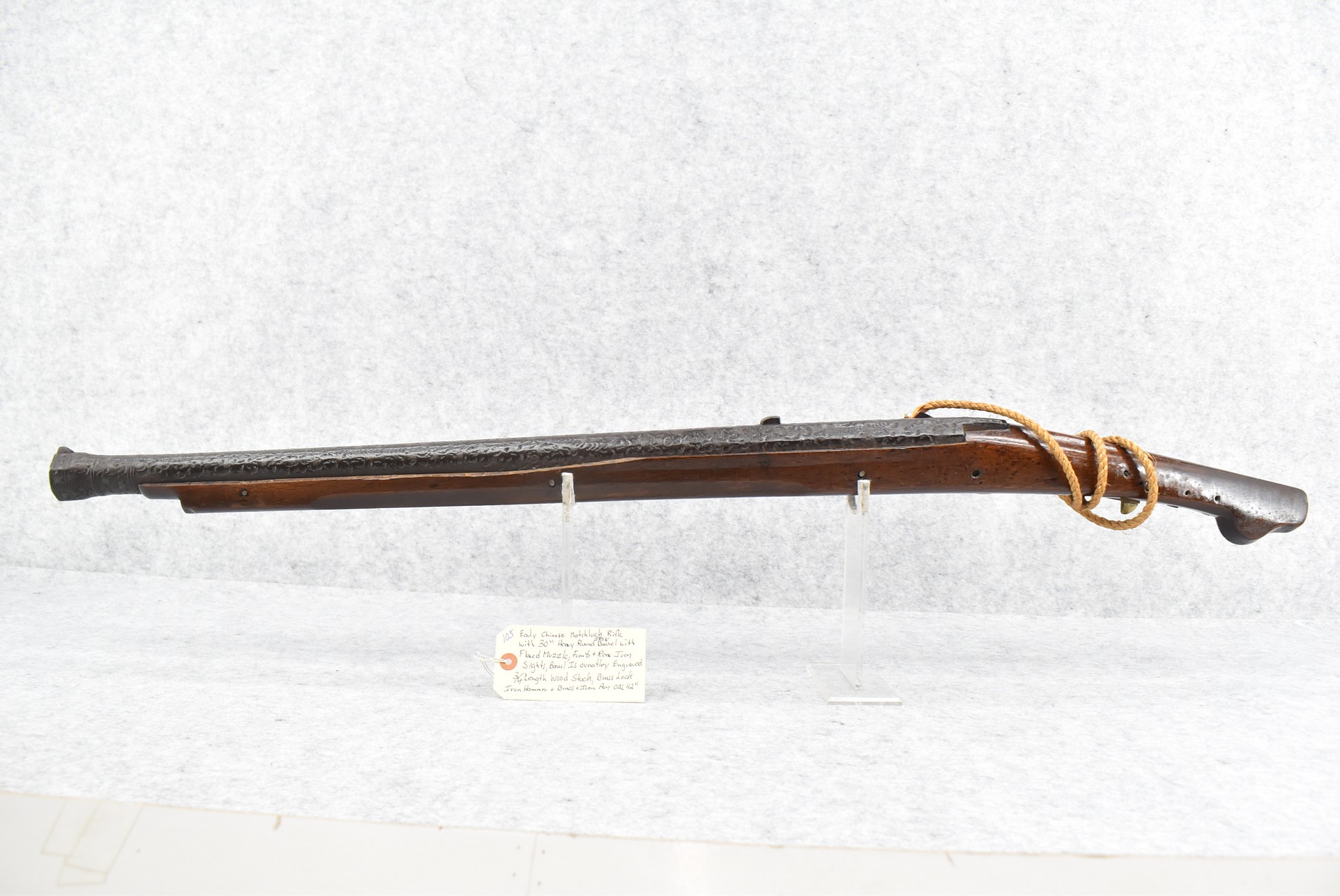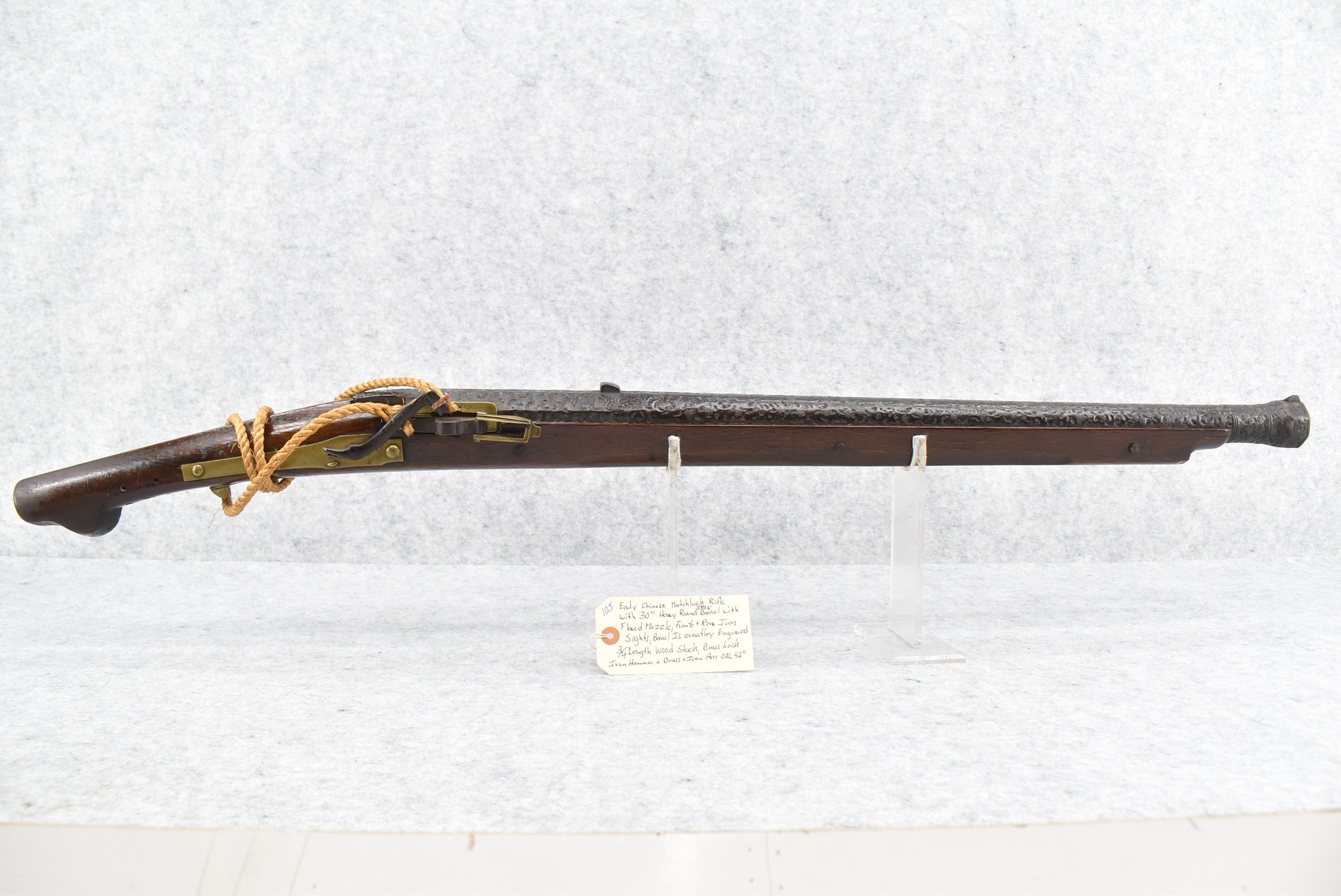 105. Early Chinese Matchlock Rifle – w/30” Heavy Round Iron Barrel w/Flared Muzzle w/Front & Rear Iron Sights – Barrel is Ornately Engraved – w/3/4 Length Wood Stock – w/Brass Lock, Iron Hammer & Brass & Iron Pan – Overall Length of 42″