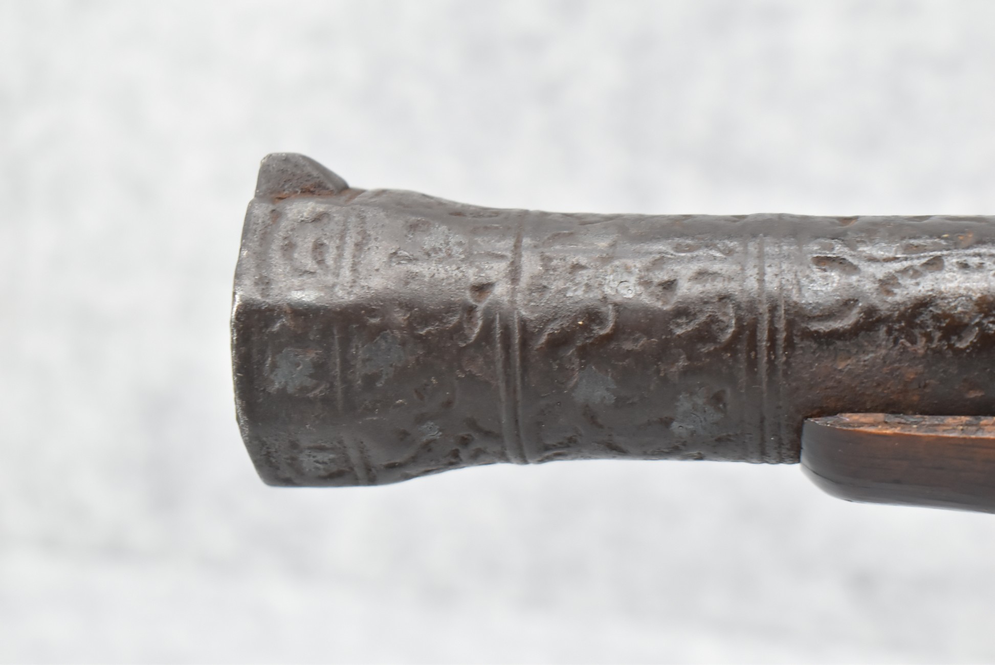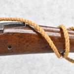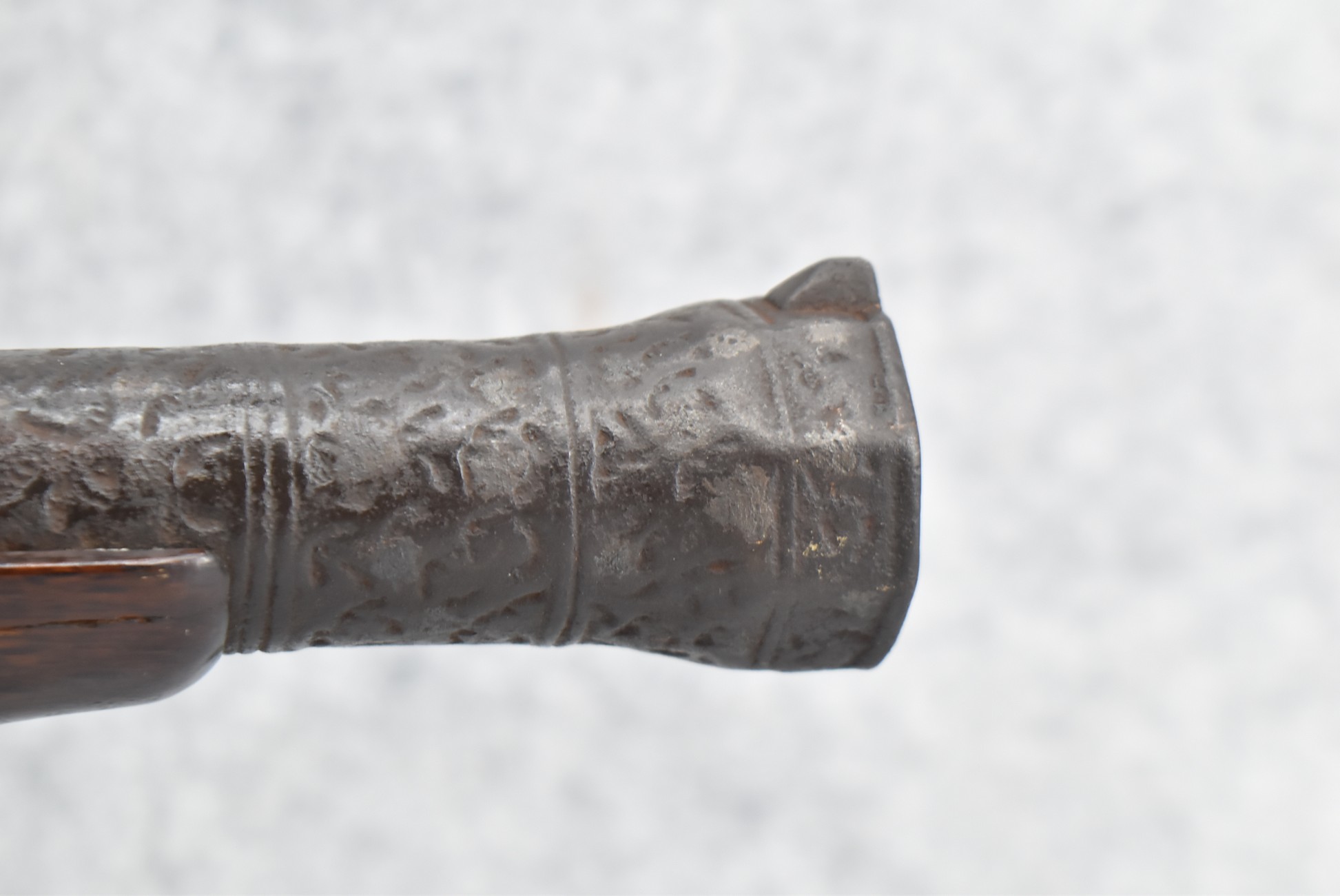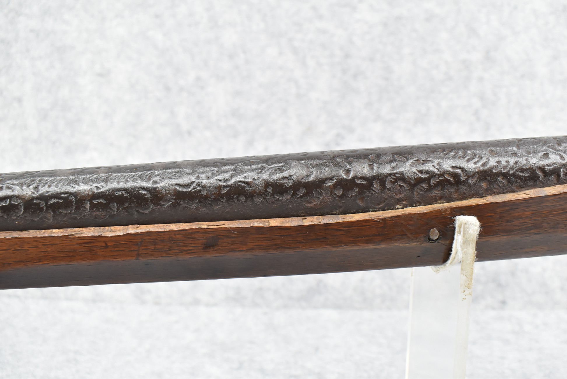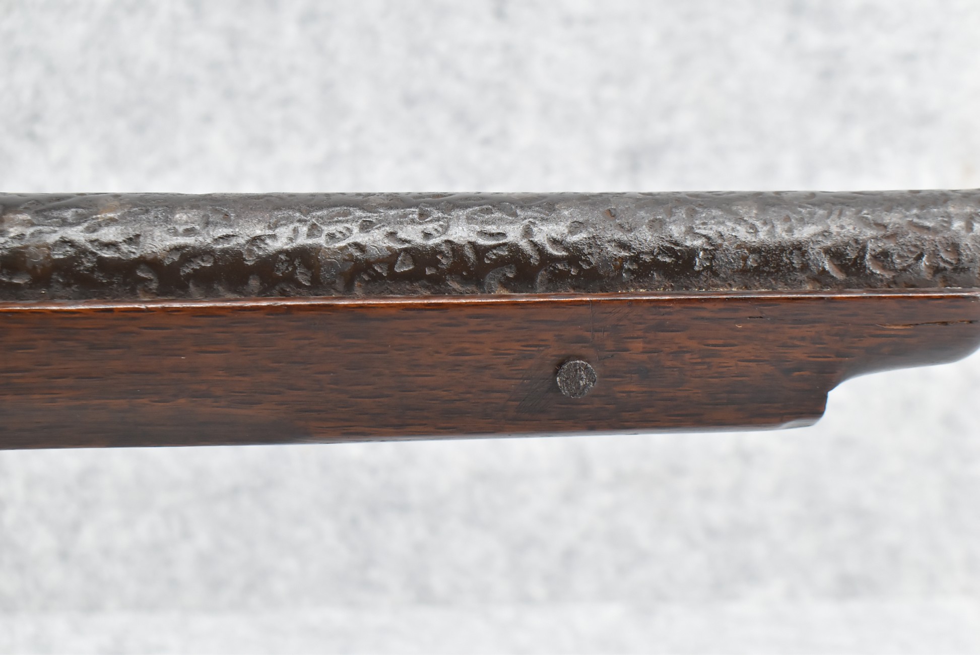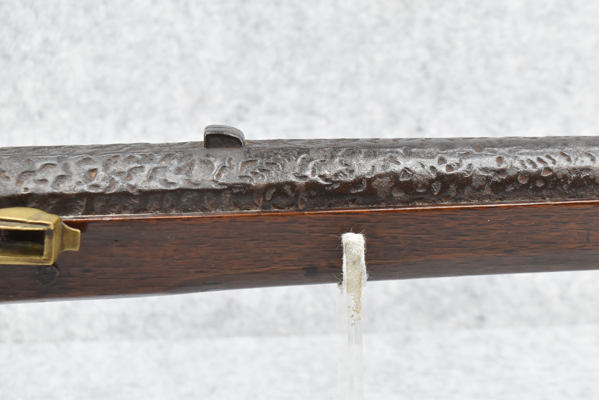 105. Early Chinese Matchlock Rifle – w/30” Heavy Round Iron Barrel w/Flared Muzzle w/Front & Rear Iron Sights – Barrel is Ornately Engraved – w/3/4 Length Wood Stock – w/Brass Lock, Iron Hammer & Brass & Iron Pan – Overall Length of 42″