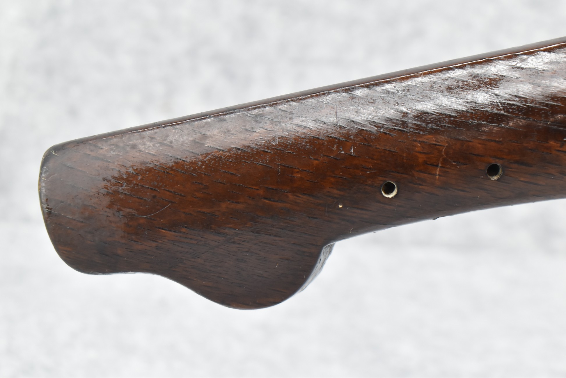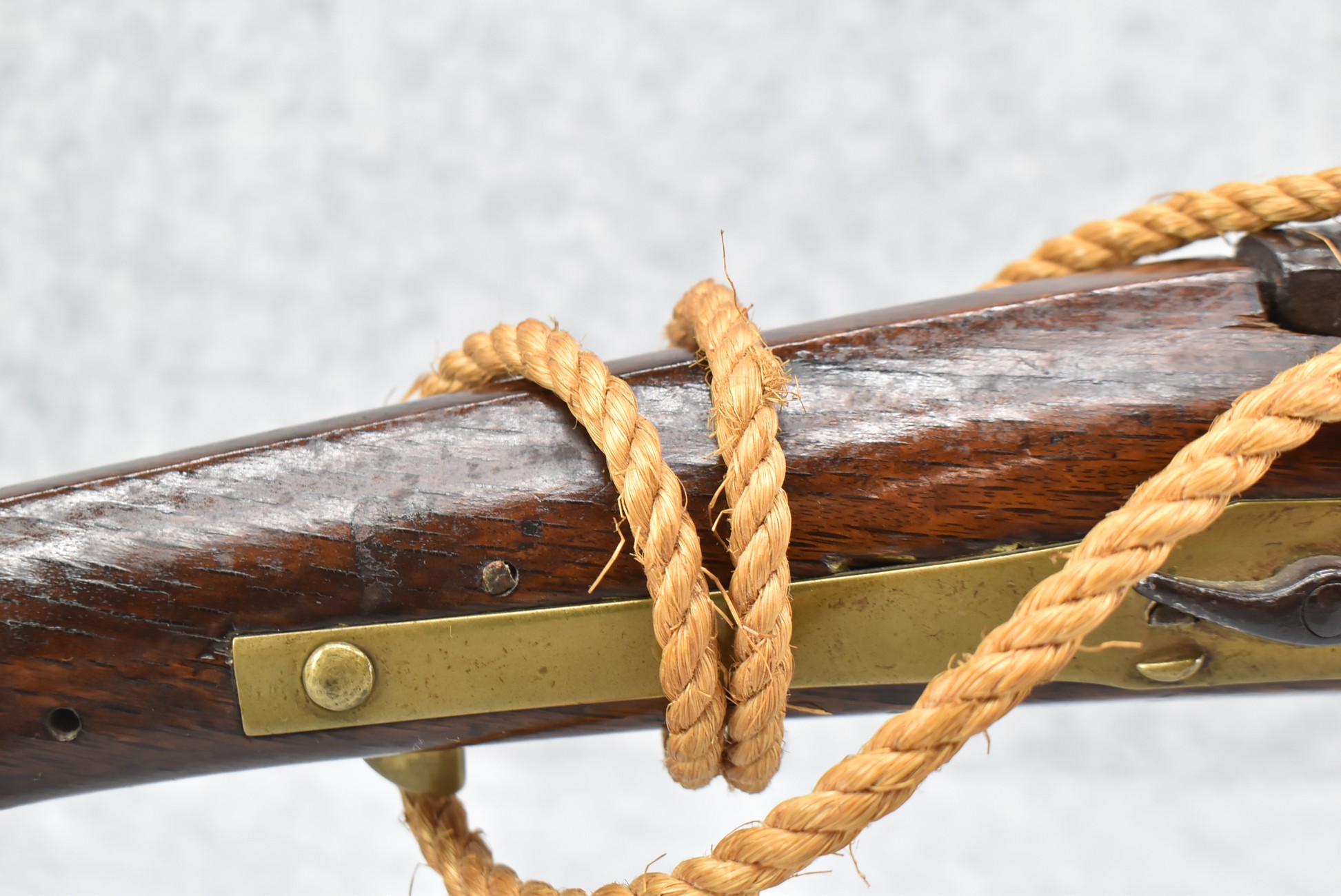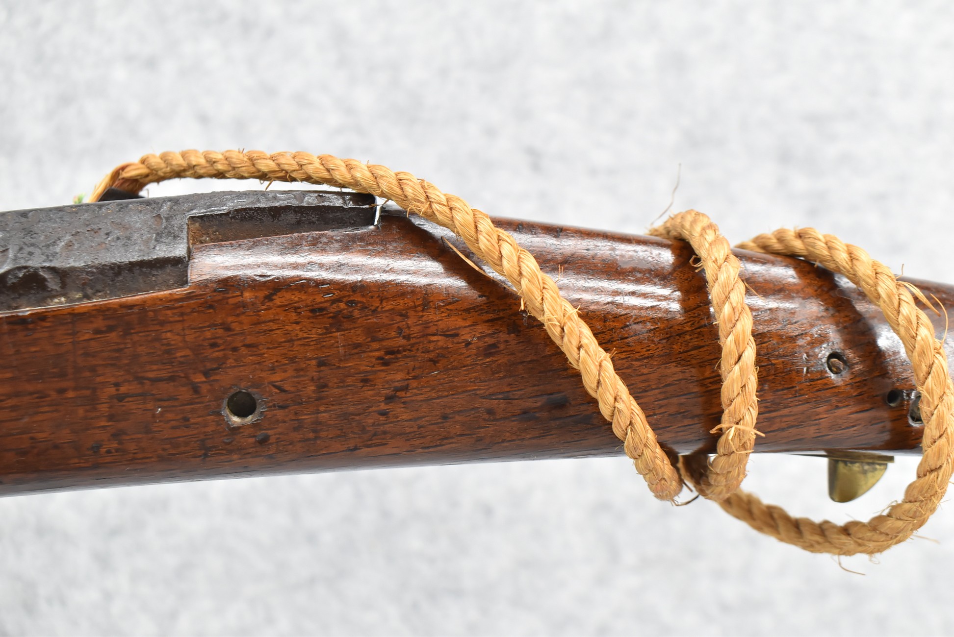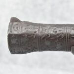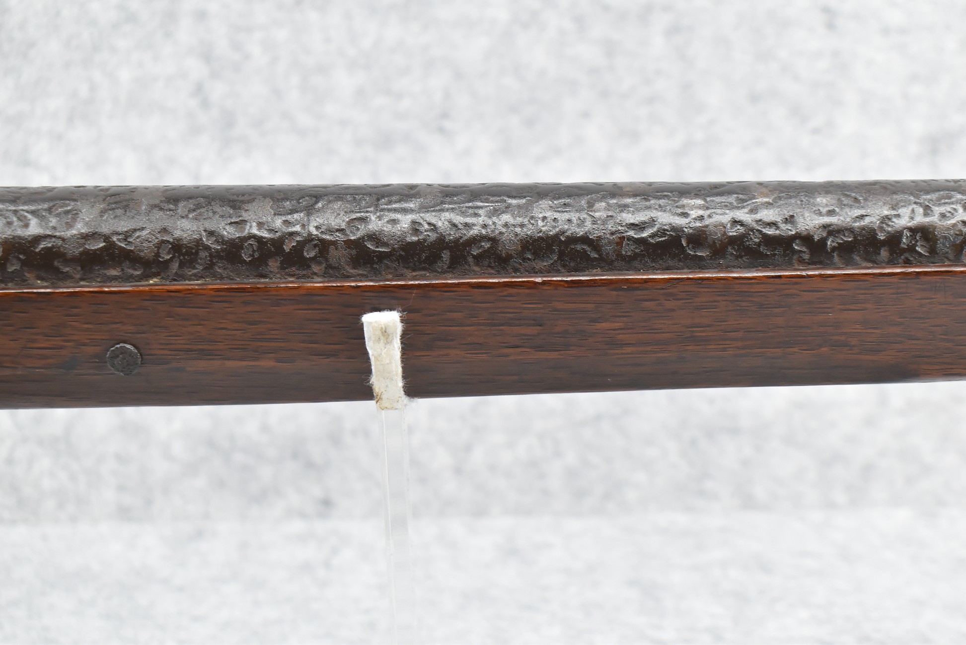 105. Early Chinese Matchlock Rifle – w/30” Heavy Round Iron Barrel w/Flared Muzzle w/Front & Rear Iron Sights – Barrel is Ornately Engraved – w/3/4 Length Wood Stock – w/Brass Lock, Iron Hammer & Brass & Iron Pan – Overall Length of 42″