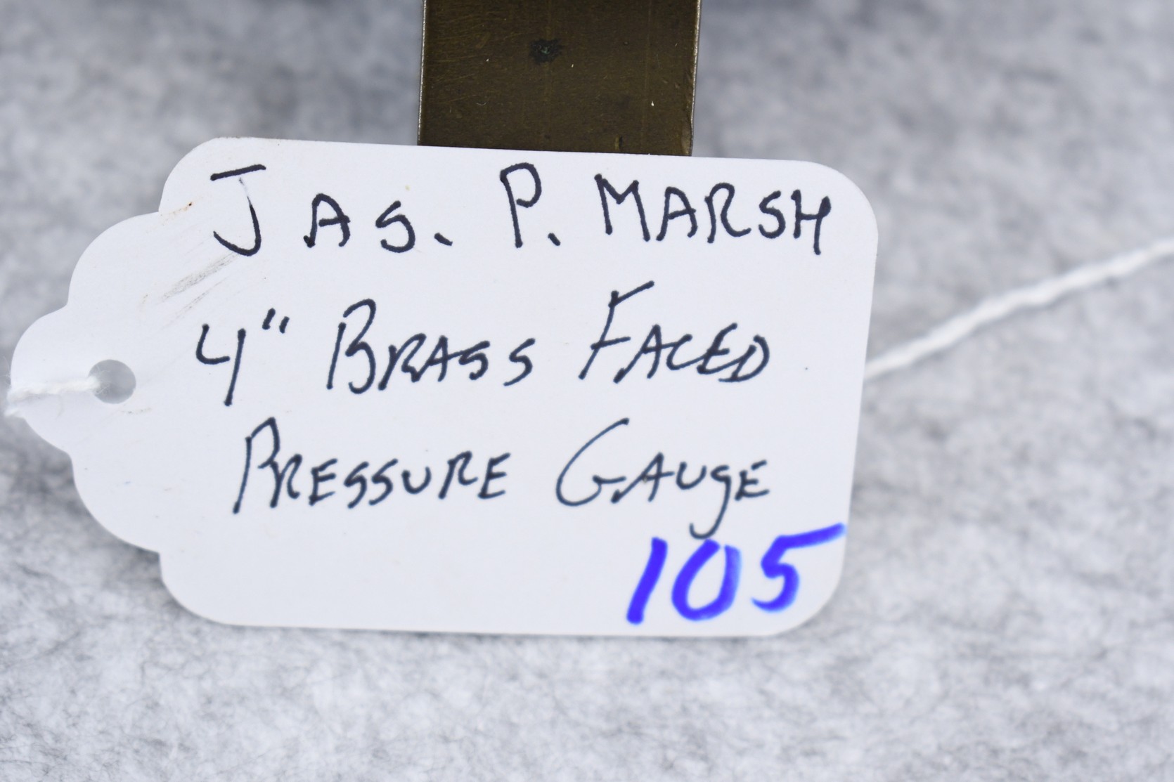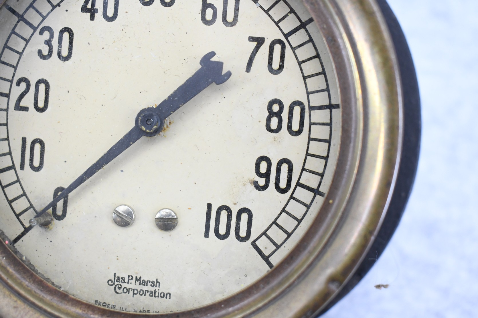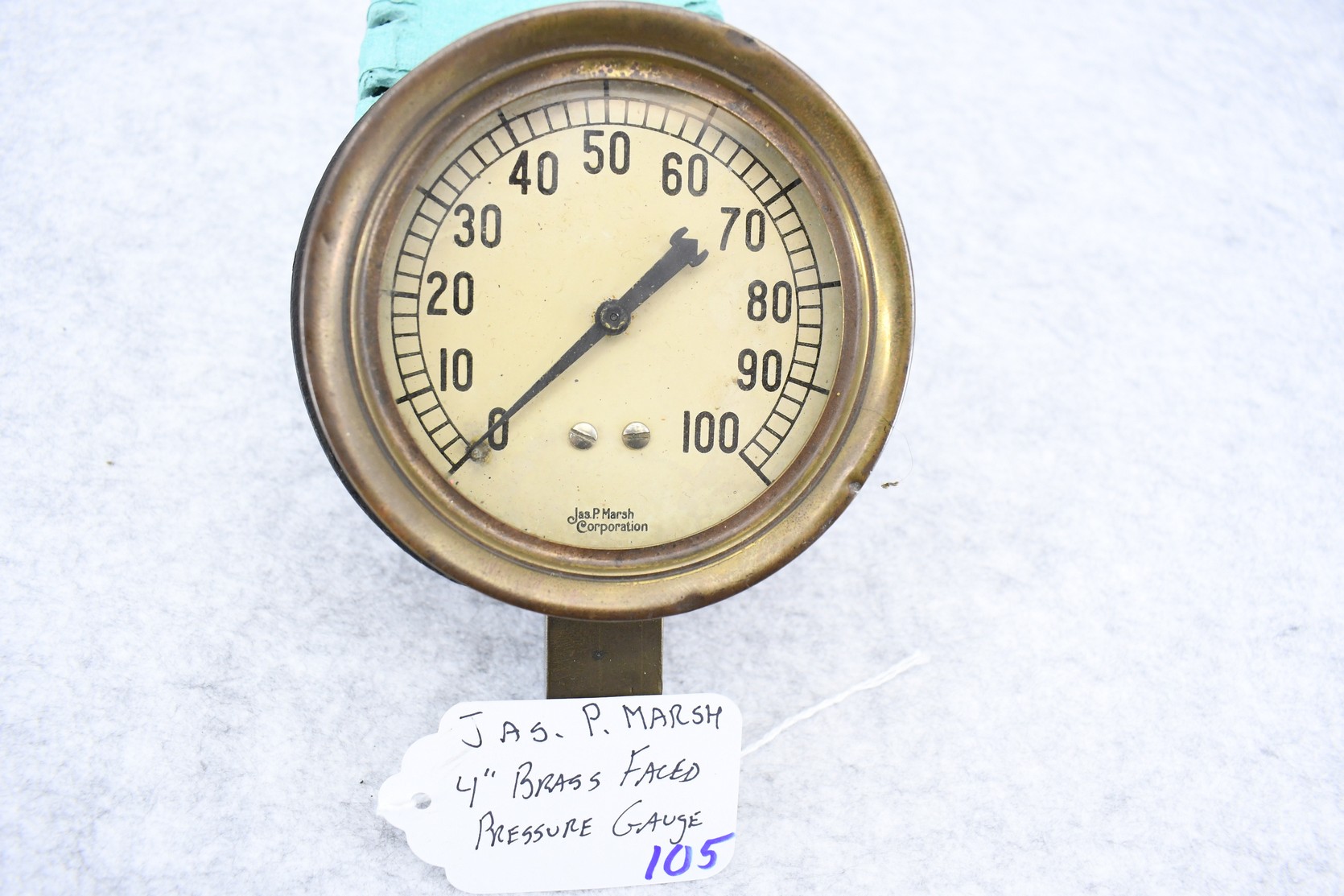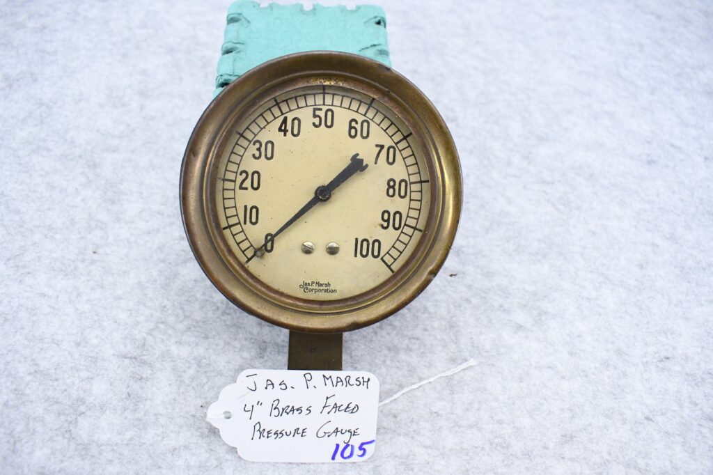 105. Jas. P. Marsh Corp. Brass Faced Pressure Gauge Pp to 100LB – Gauge is 4” Across the Brass Face