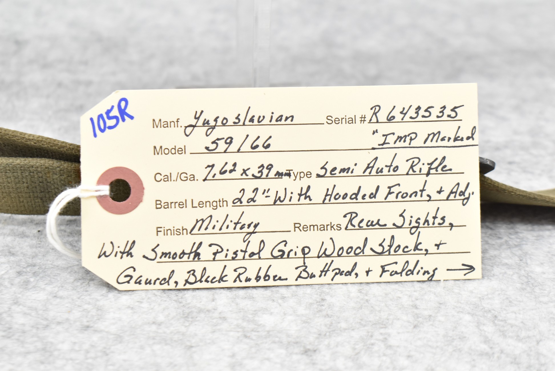 105R. Yugoslavian – Mod. 59/66 – 7.62x39mm Cal. Semi-Auto Rifle – w/22” Barrel w/Hooded Front & Adj. Rear Sights – Military Finish – w/Smooth Pistol Grip Wood Stocks w/Butt Pad – w/Folding Knife Bayonet – w/Military Style Sling – Import Marked