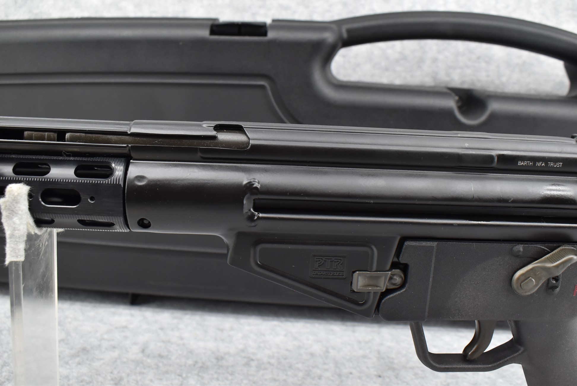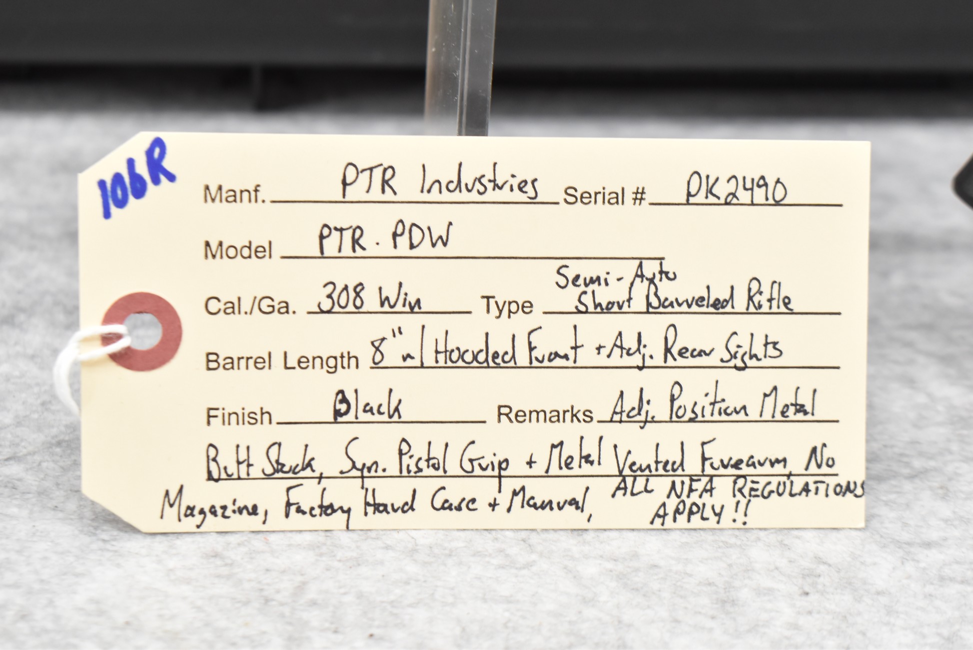 106R. PTR Industries – Mod. PTR-PDW – 308 Win. Cal. Semi-Auto Short Barreled Rifle (SBR) – w/8” Barrel w/Hooded Front & Adj. Rear Sights – Black Finish – w/Adj. Position Metal Butt Stock, Synthetic Pistol Grip & Metal Vented Forearm – No Magazine – w/Factory Hard Case & Manual – Gun is on RAS Inc. NFA Book E-File Form 3 & Form 4 – Fully Transferable (CANNOT GO TO MARYLAND!) Please Check Your State & Local Laws For Legality Before Attempting to Purchase This Firearm!
