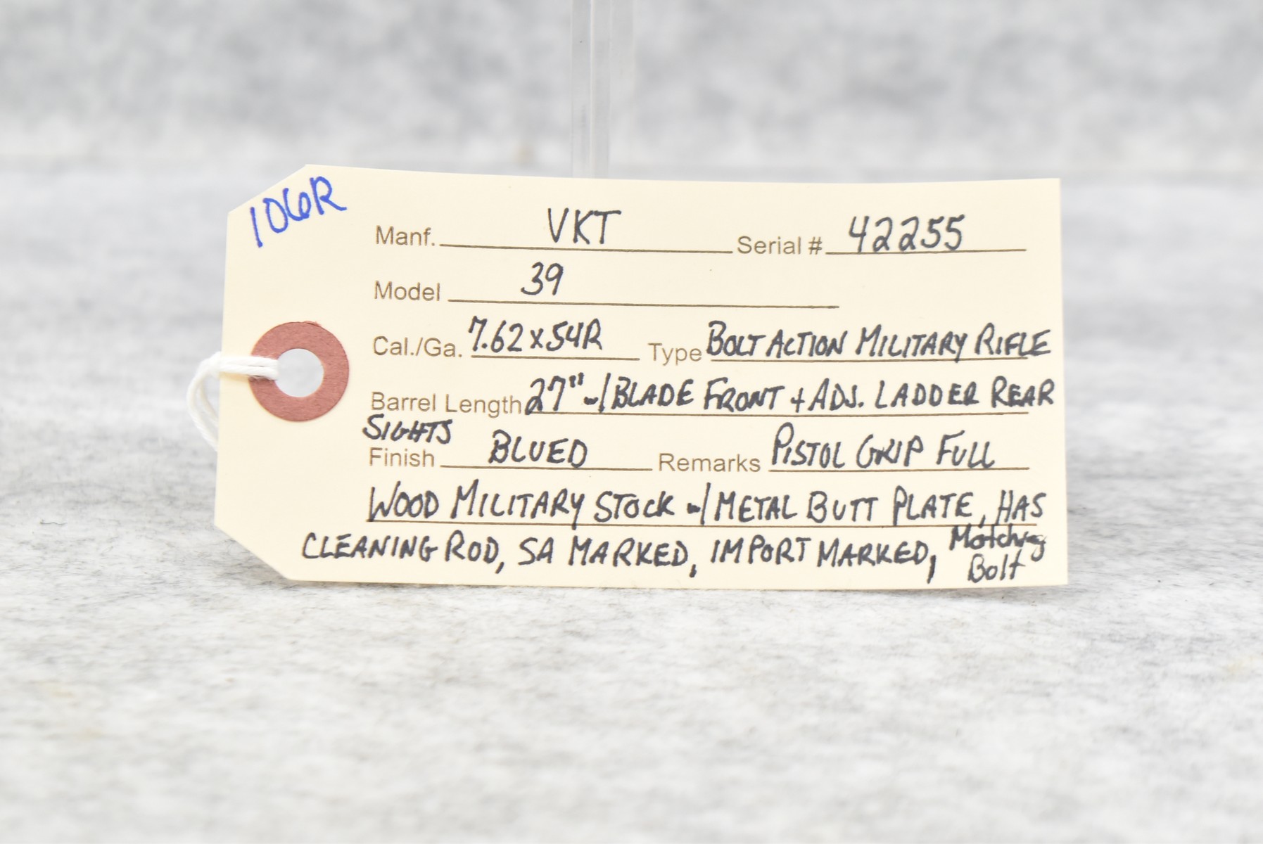 106R. VKT – Mod. 39 – 7.62x54R Cal. Bolt Action Military Rifle – w/27” Barrel w/Blade Front & Adj. Ladder Rear Sights – Blued Finish – w/Pistol Grip Full Wood Military Stock w/Metal Butt Plate – w/Cleaning Rod – w/Matching Bolt – SA Marked – Import Marked
