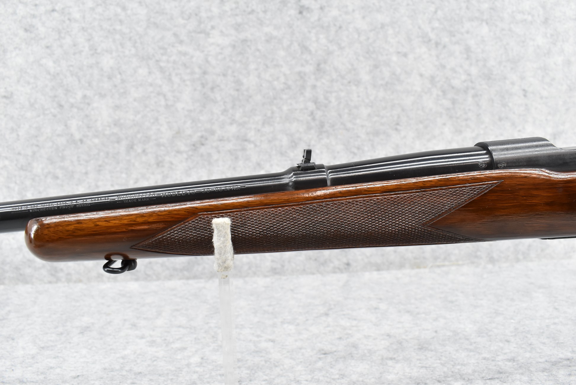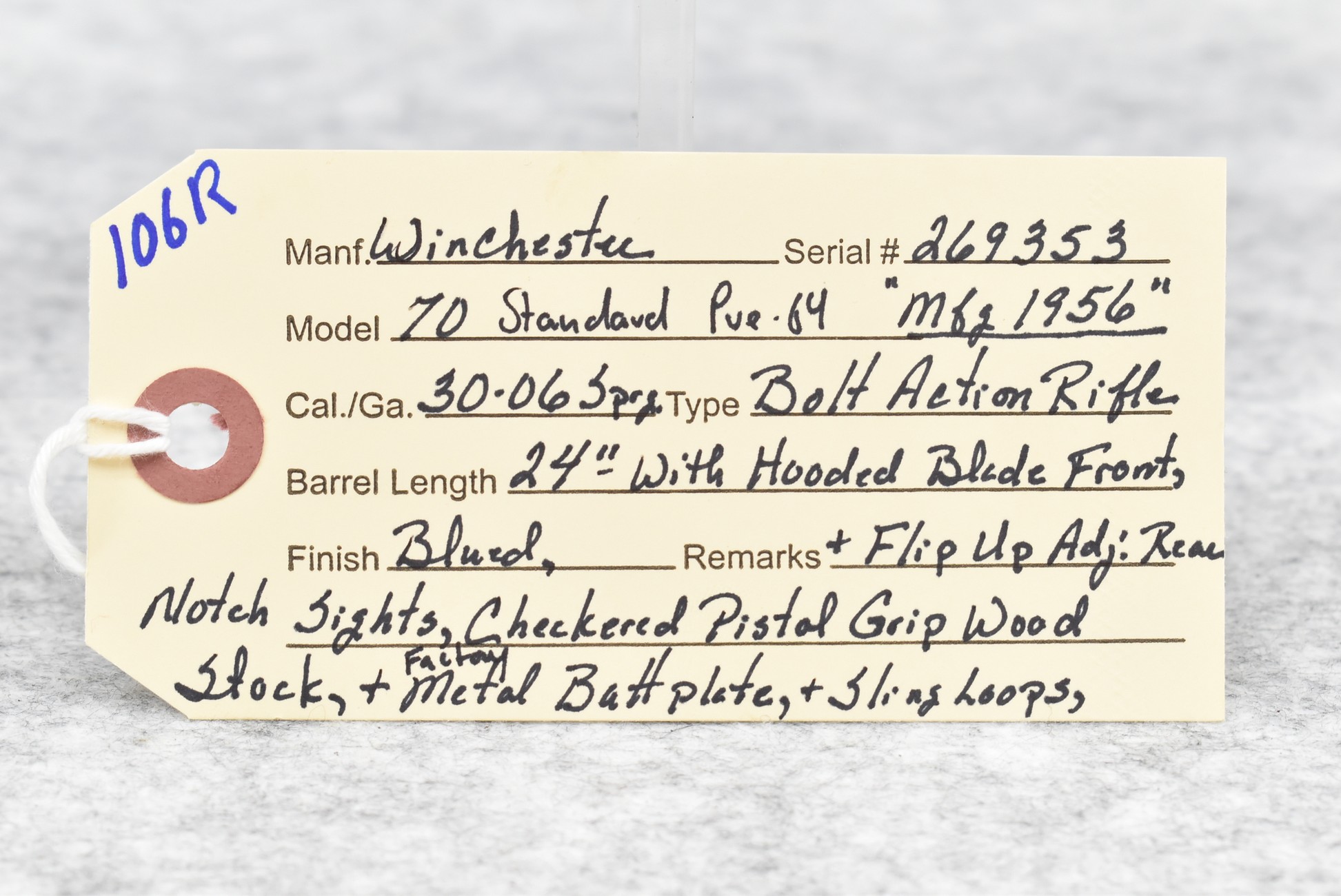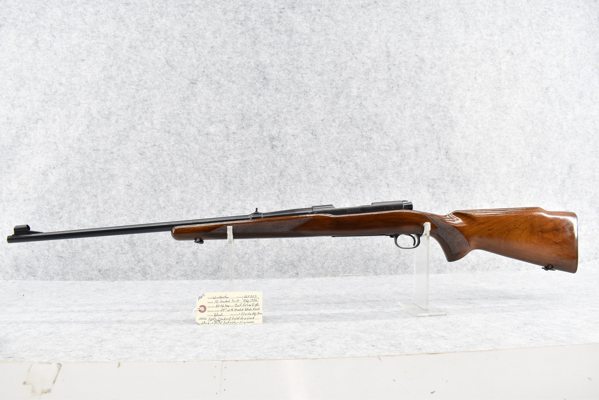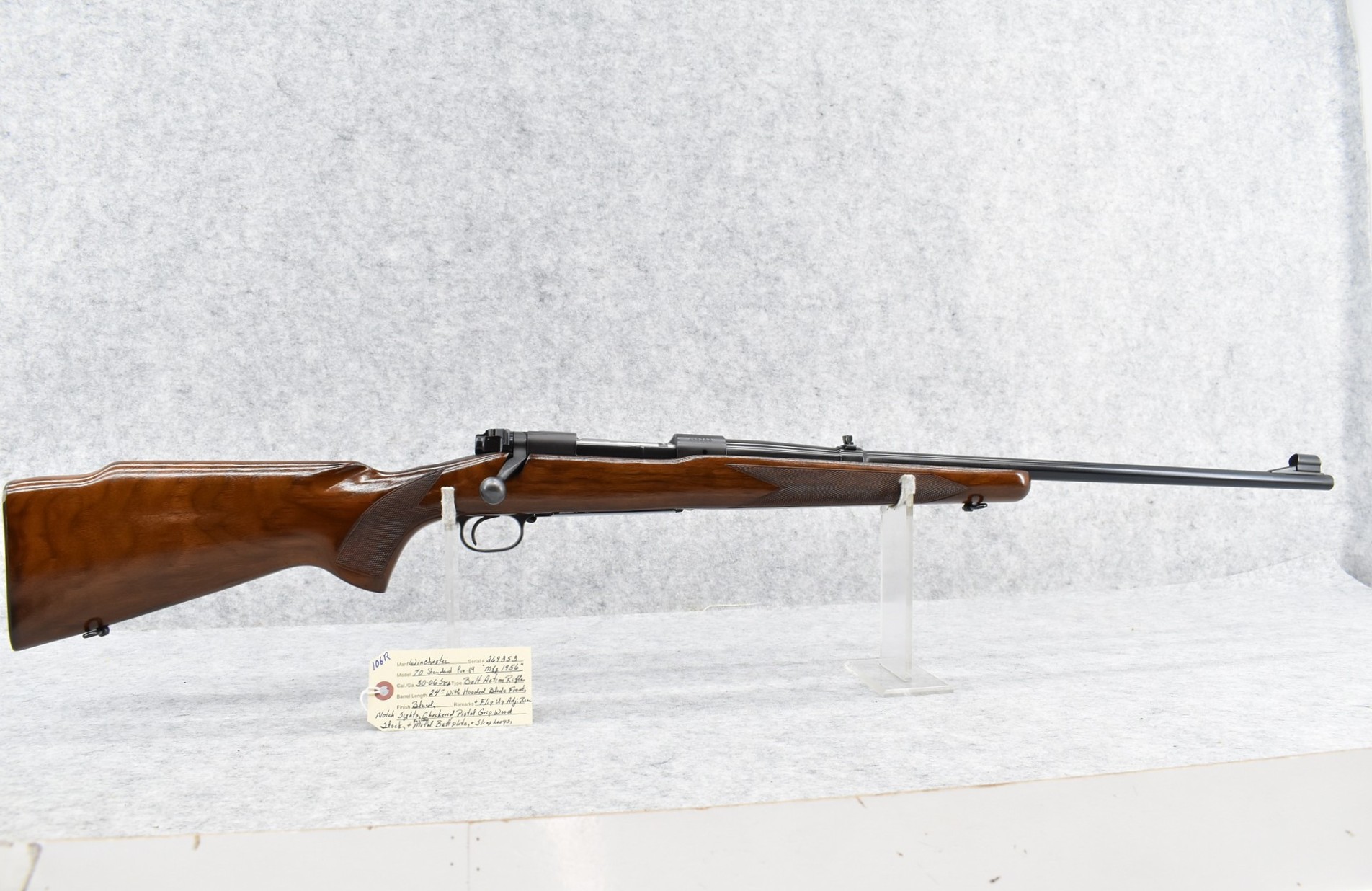 106R. Winchester – Mod. 70 Standard (Pre-64) – 30-06 Sprg. Cal. Bolt Action Rifle – w/24” Barrel w/Hooded Blade Front & Flip Up Adj. Rear Notch Sights – Blued Finish – w/Checkered Pistol Grip Wood Stock w/Factory Metal Butt Plate – w/Sling Loops – Mfg. 1956