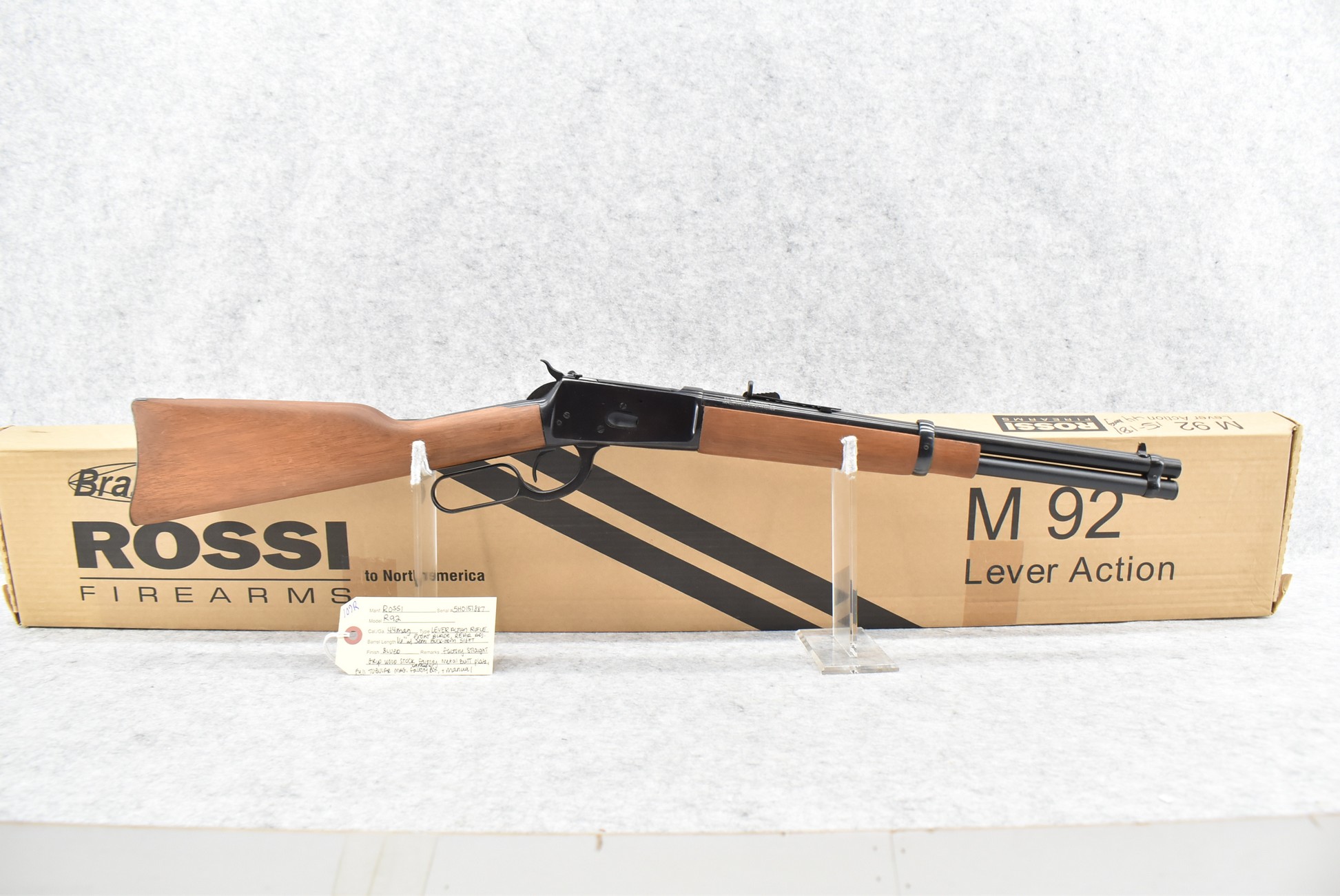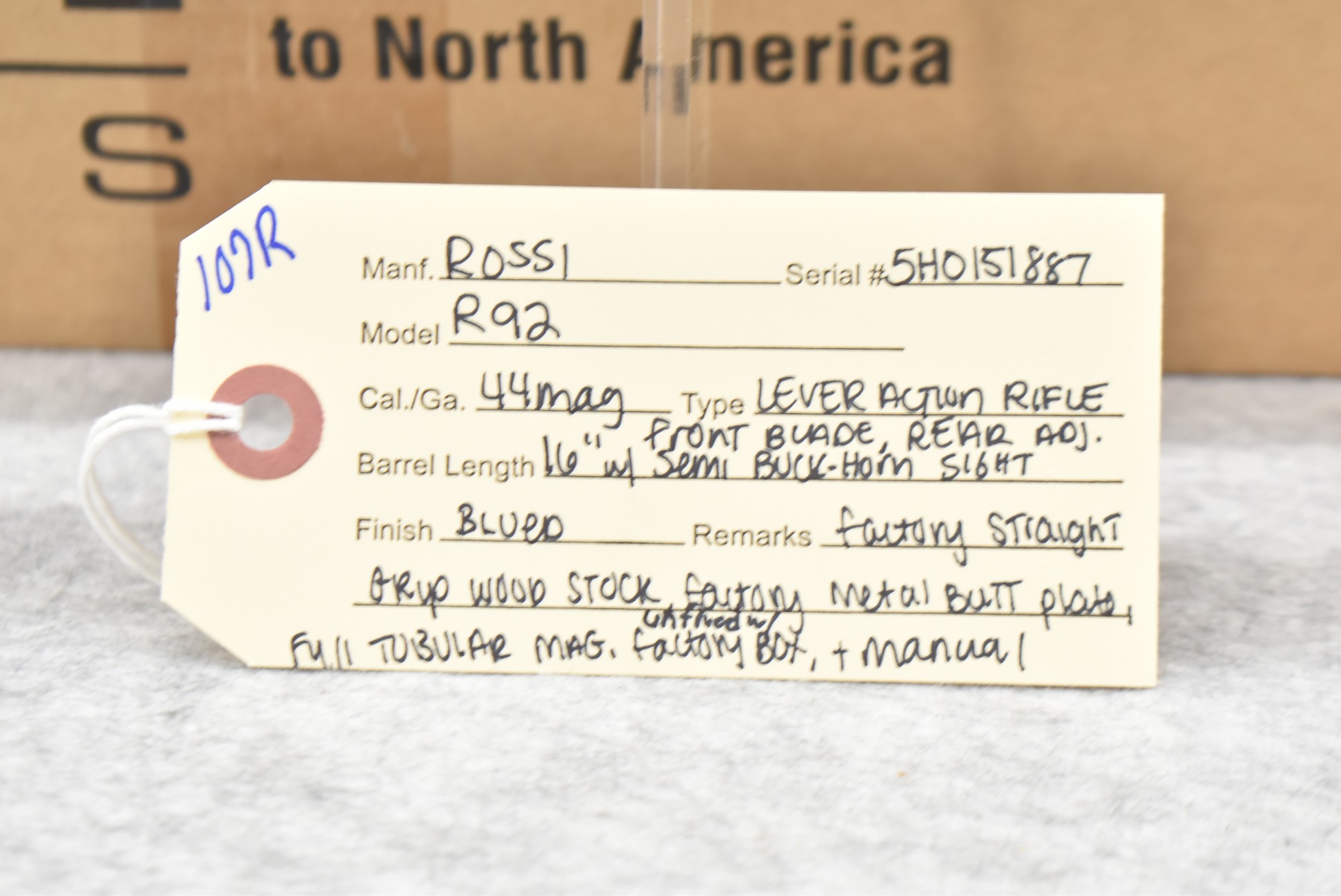 107R. Rossi – Mod. R92 – 44 Mag. Cal. Lever Action Rifle – w/16” Barrel w/Front Blade & Rear Adj. Semi-Buckhorn Sights w/Full Tubular Magazine – Blued Finish – w/Factory Straight Grip Wood Stock w/Factory Metal Butt Plate – Unfired w/Factory Box & Manual