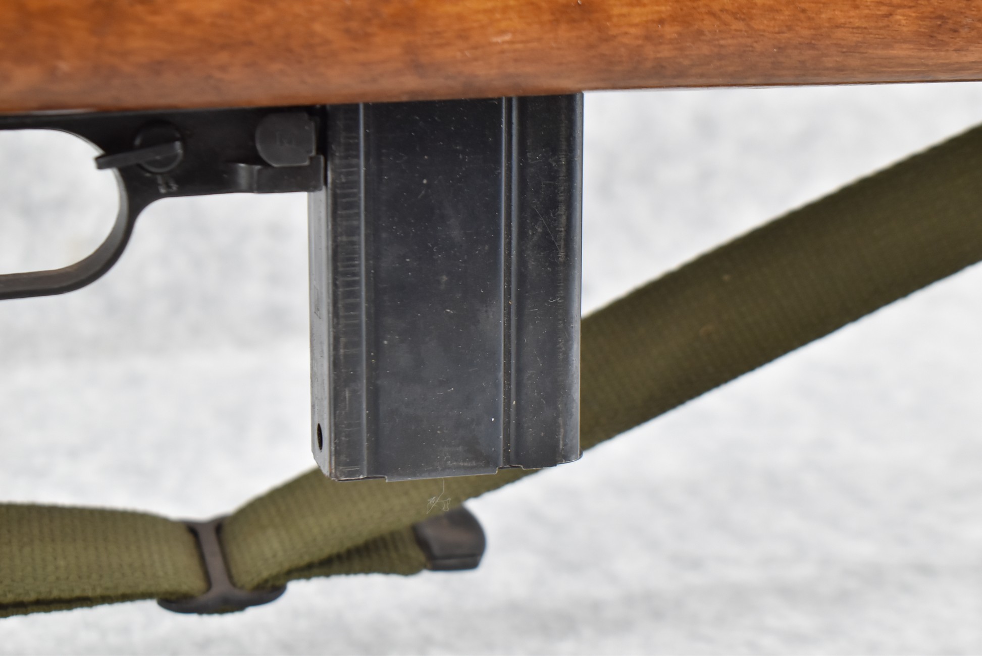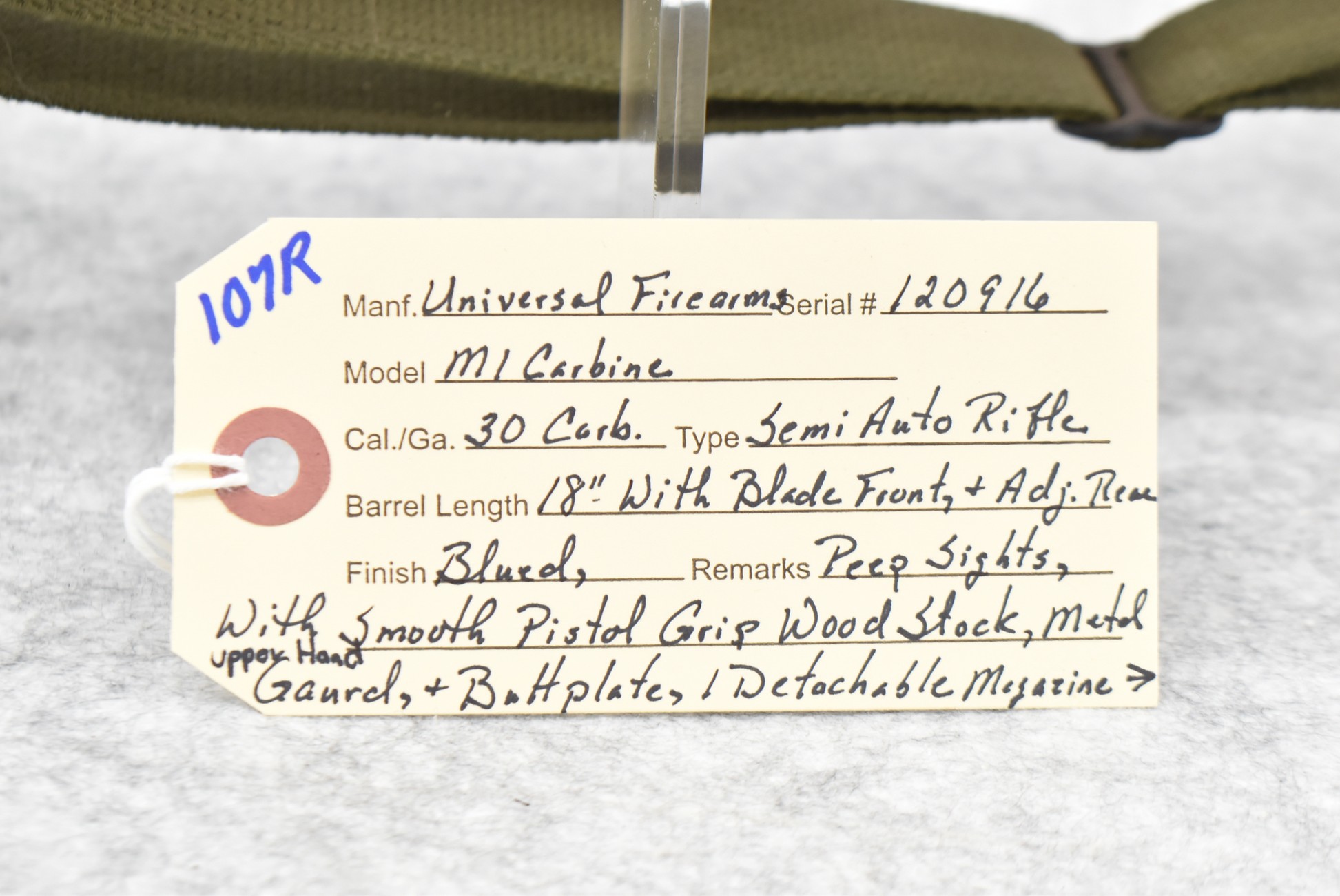 107R. Universal Firearms – Mod. M1 Carbine – 30 Carbine Cal. Semi-Auto Rifle – w/18” Barrel w/Blade Front & Adj. Rear Peep Sights – Blued Finish – w/Smooth Pistol Grip Wood Stock, Metal Upper Hand Guard & Butt Plate – w/Detachable Magazine – w/Military Style Sling