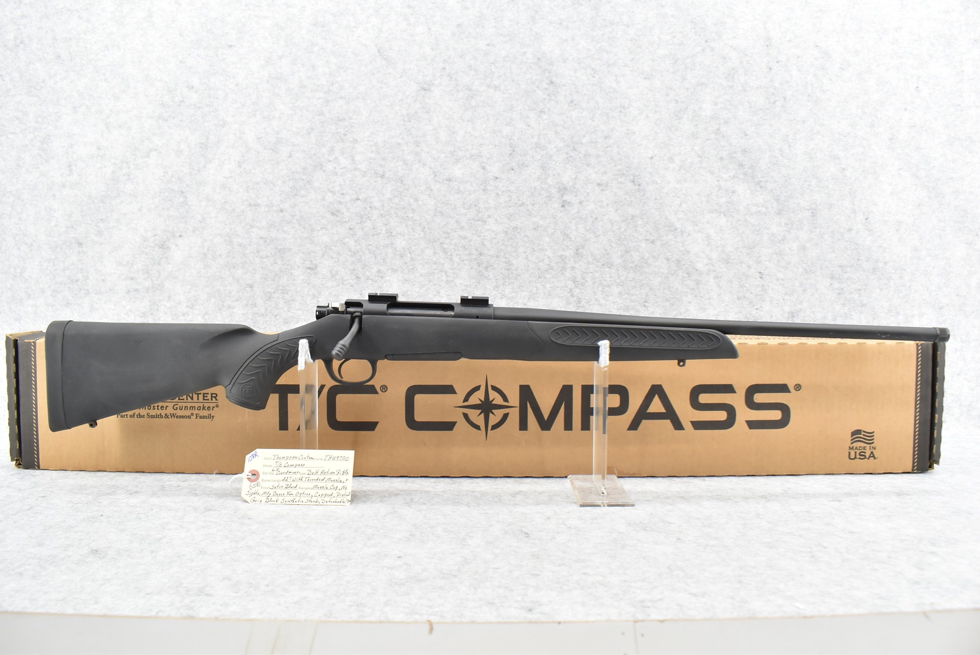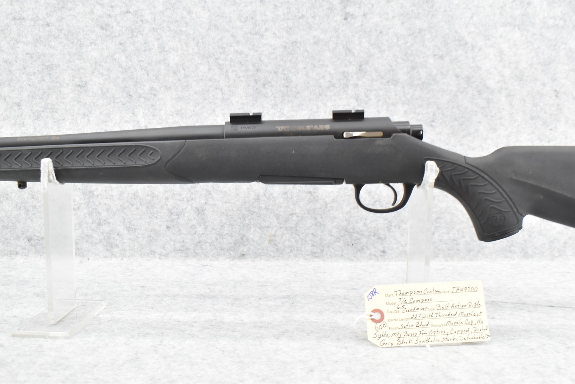 108R. Thompson Center – Mod. T/C Compass – 6.5 Creedmoor Cal. Bolt Action Rifle – w/22” Barrel w/Threaded Muzzle & Muzzle Cap (No Sights) – Satin Blued Finish – w/Capped Pistol Grip Black Synthetic Stock w/Butt Pad – w/Detachable Magazine – w/Mounting Bases for Optics – New w/Factory Box, Manuals & Accessories