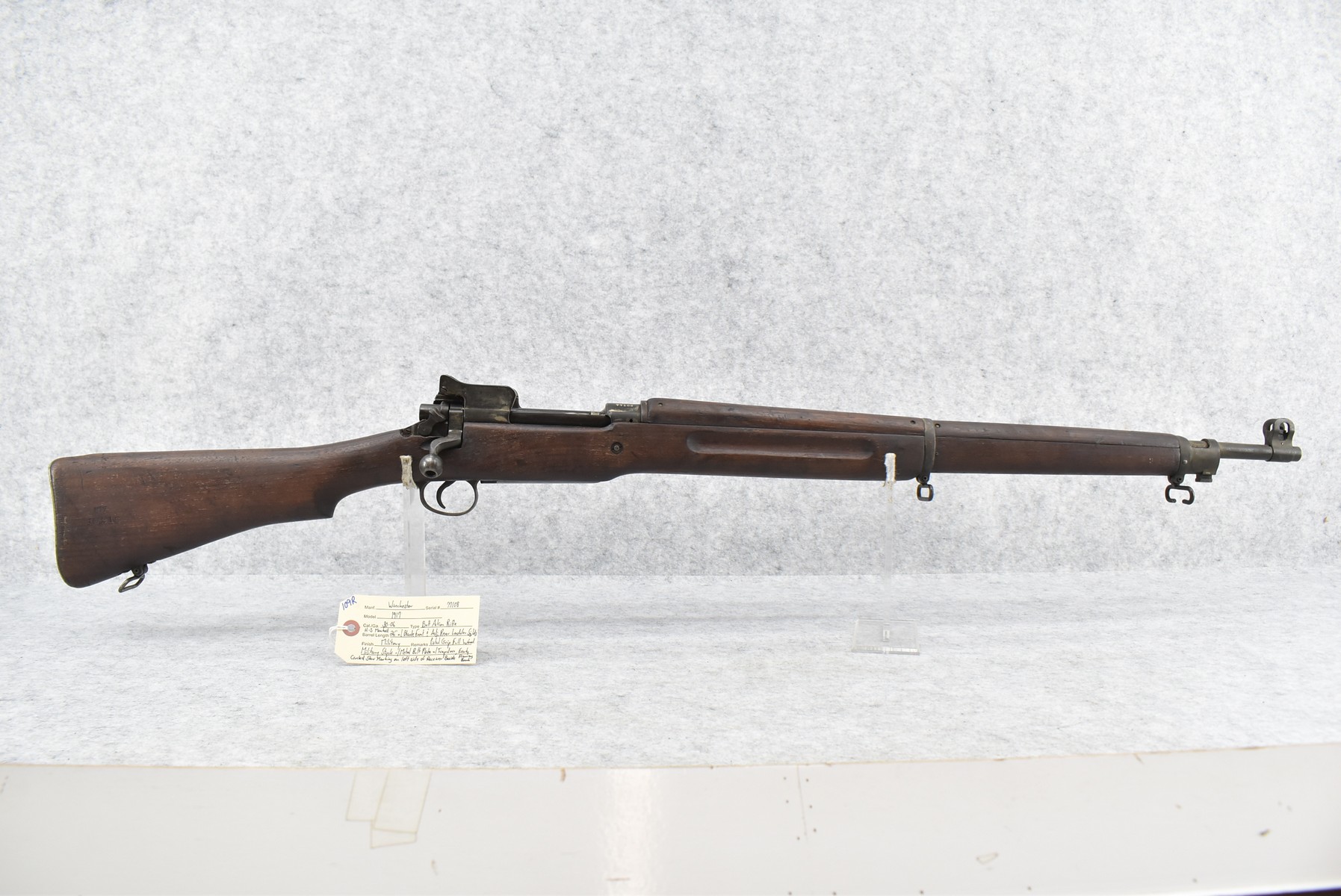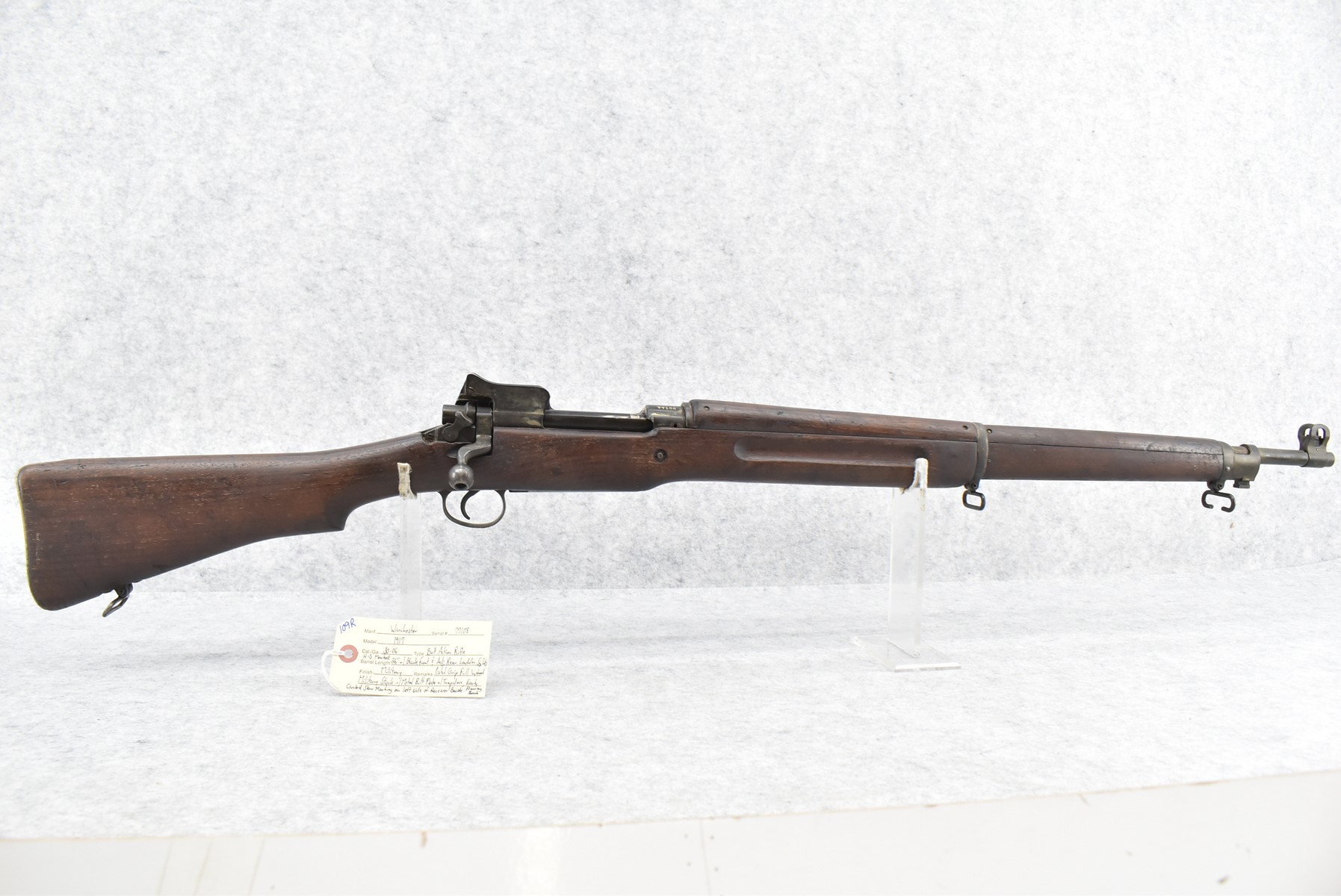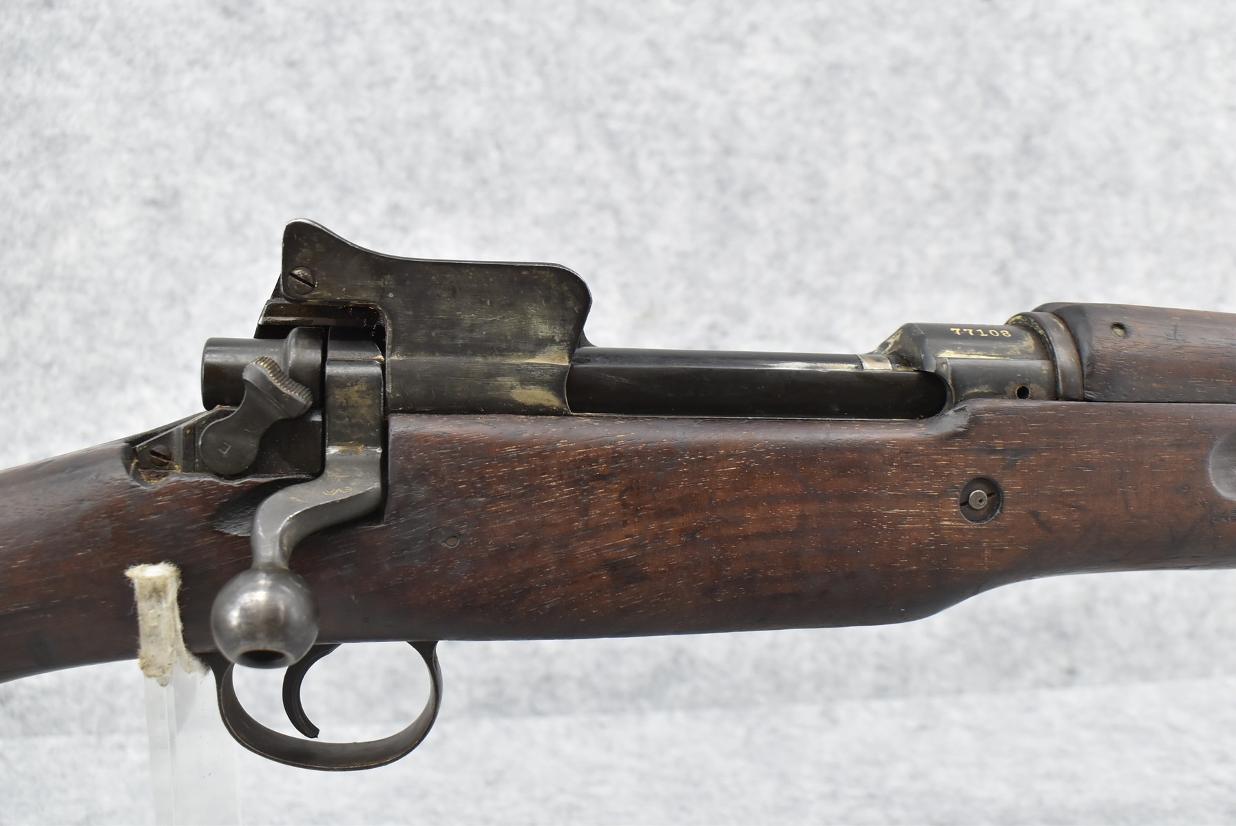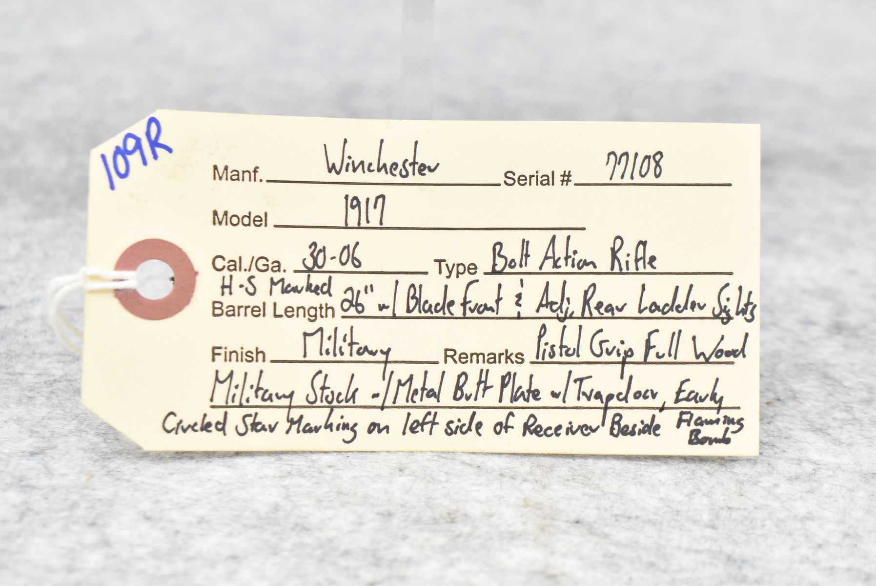 109R. Winchester – Mod. 1917 – 30-06 Cal. Bolt Action Rifle – w/26” H-S Marked Barrel w/Blade Front & Adj. Rear Ladder Sights – Military Finish – w/Pistol Grip Full Wood Military Stock w/Metal Butt Plate – w/Trap Door – Note Early Circled Star Marking on Left Side of Receiver Beside Flaming Bomb