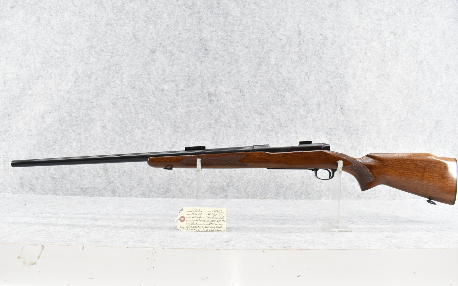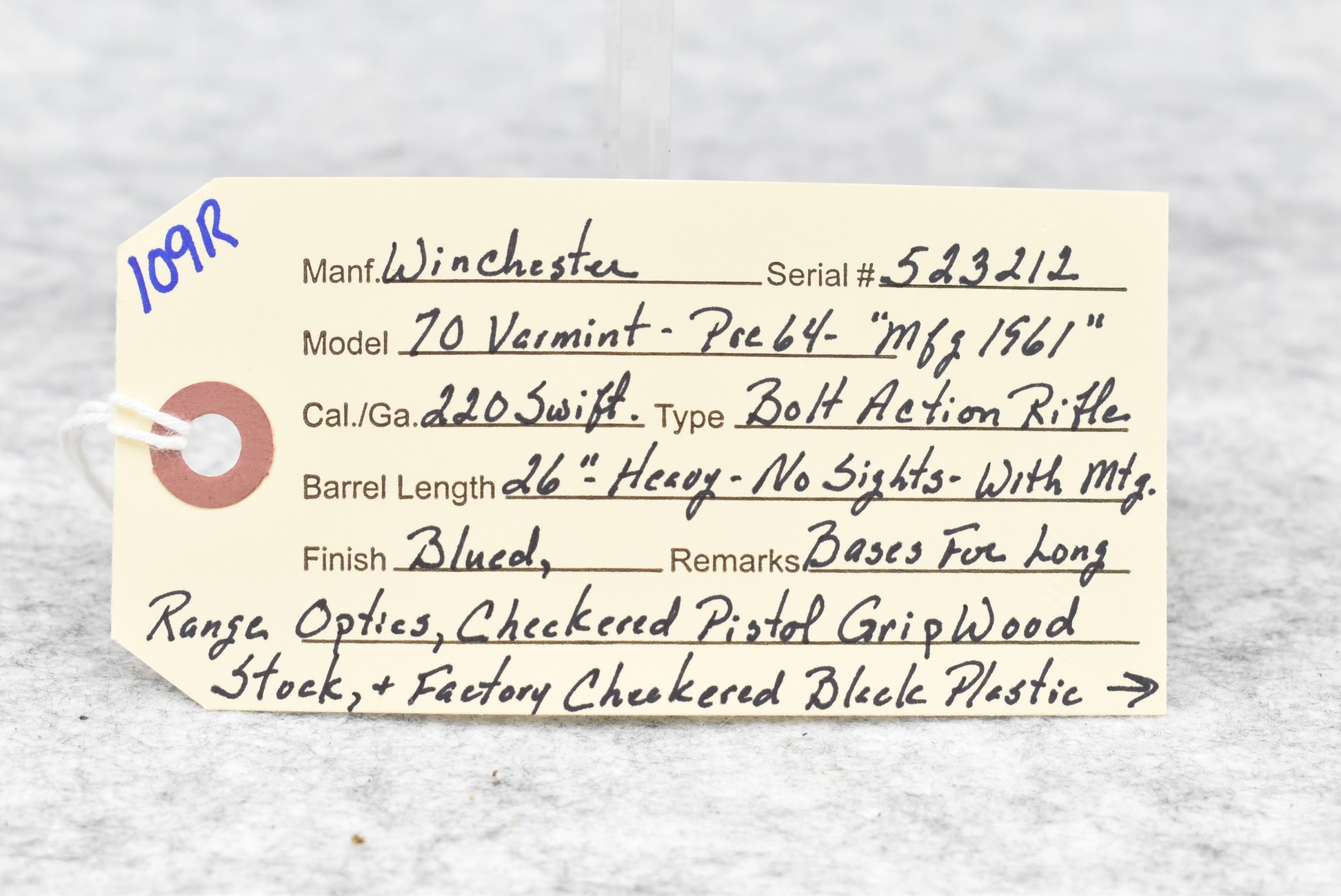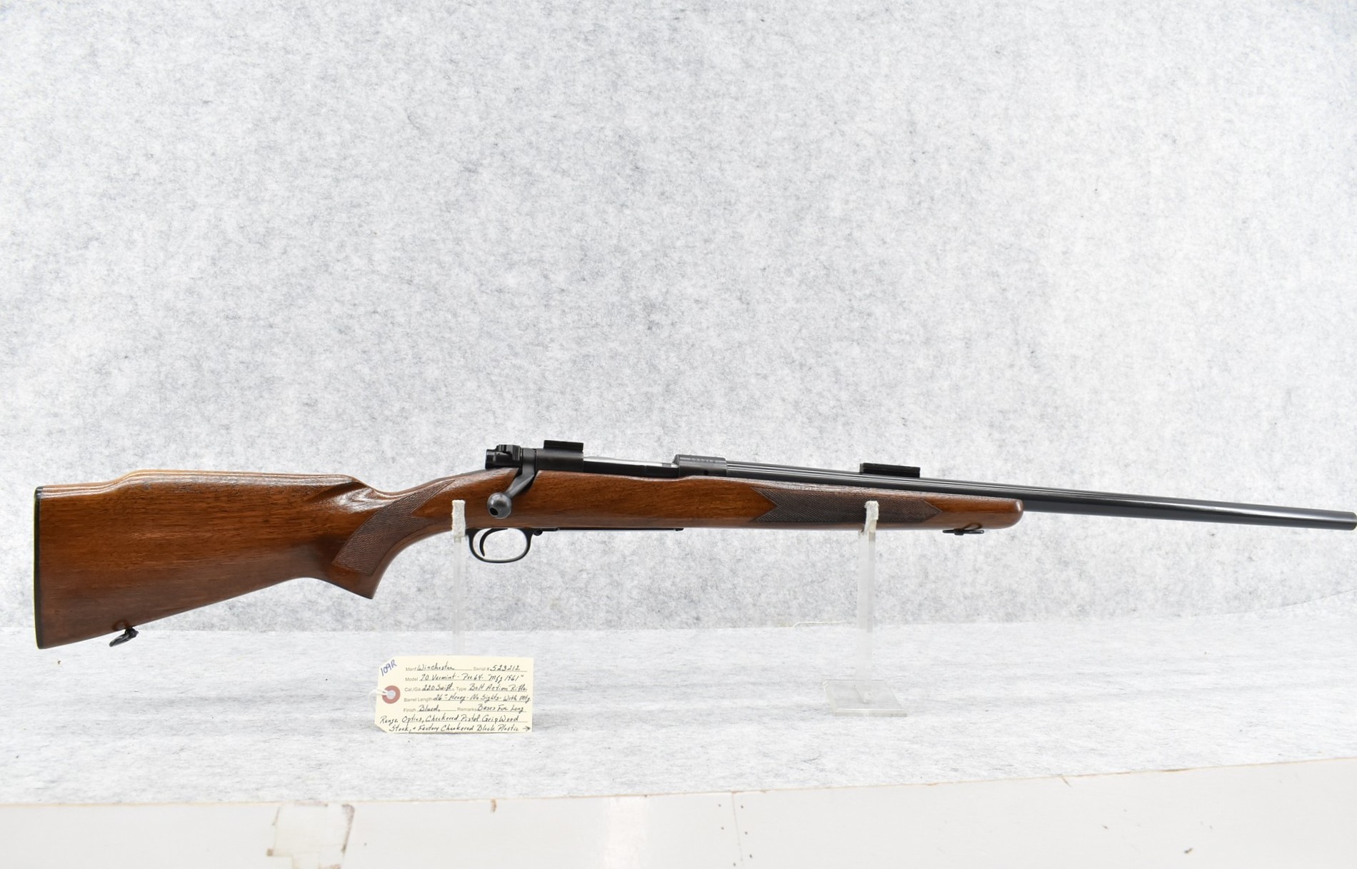 109R. Winchester – Mod. 70 Varmint (Pre-64) – 220 Swift Cal. Bolt Action Rifle – w/26” Heavy Barrel – Blued Finish – w/Checkered Pistol Grip Wood Stock w/Factory Checkered Butt Plate – w/Sling Loops – w/Scope Block Bases – Mfg. 1961