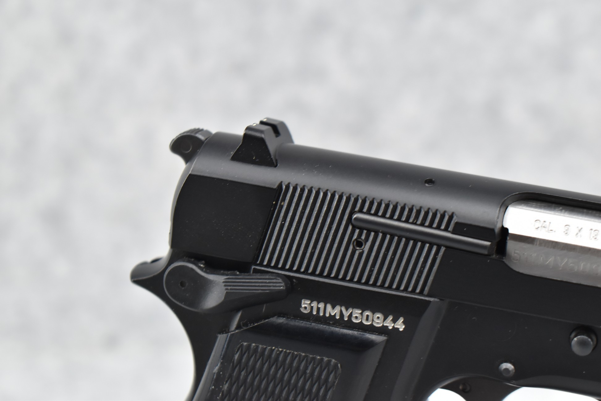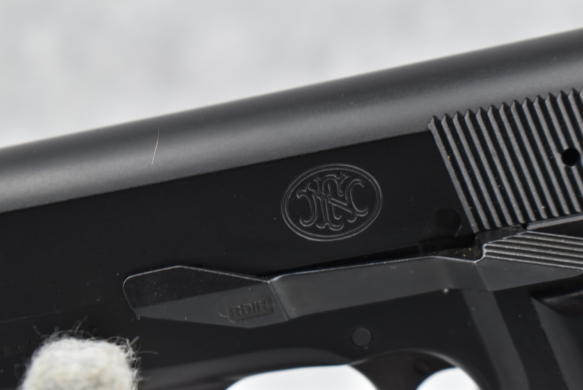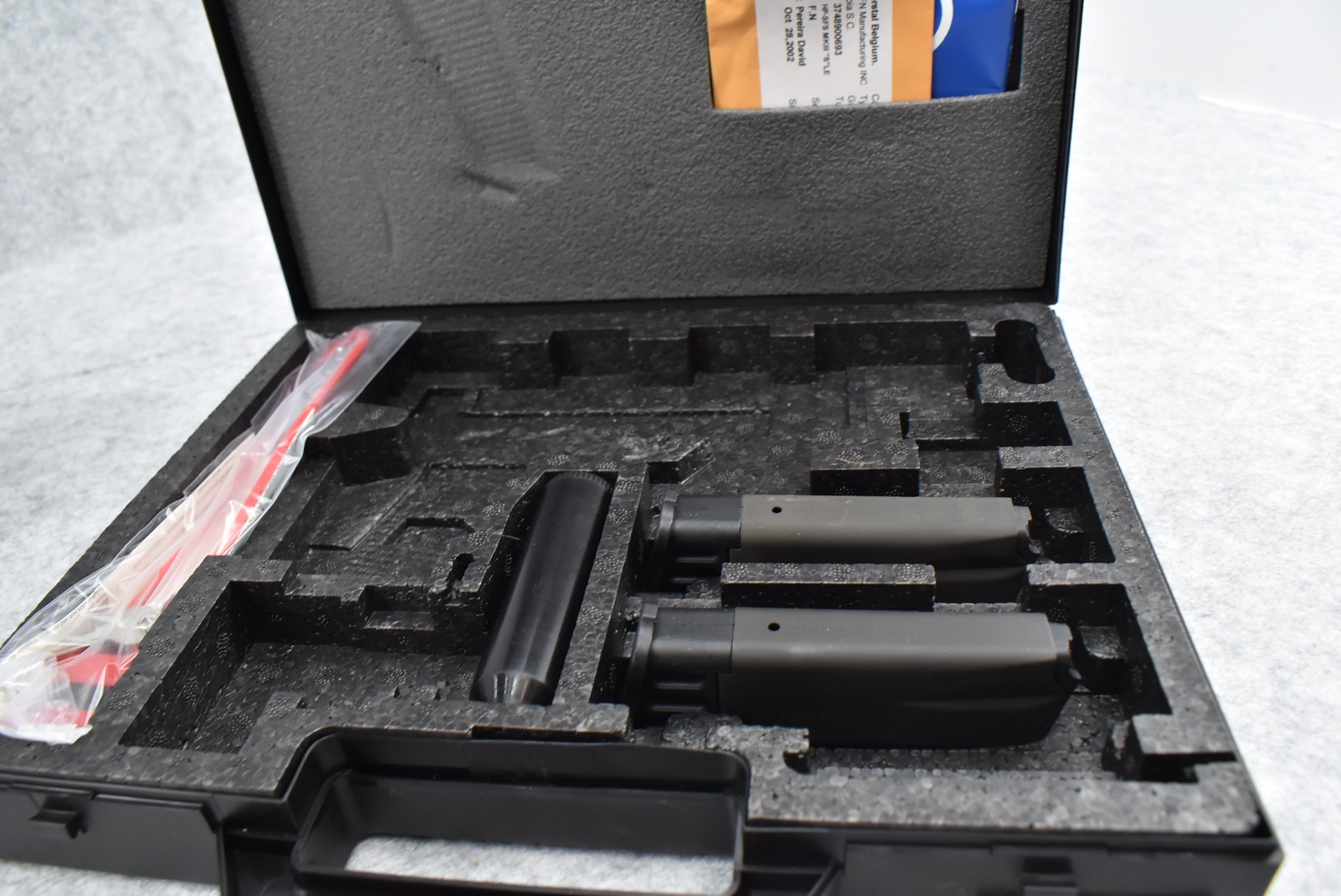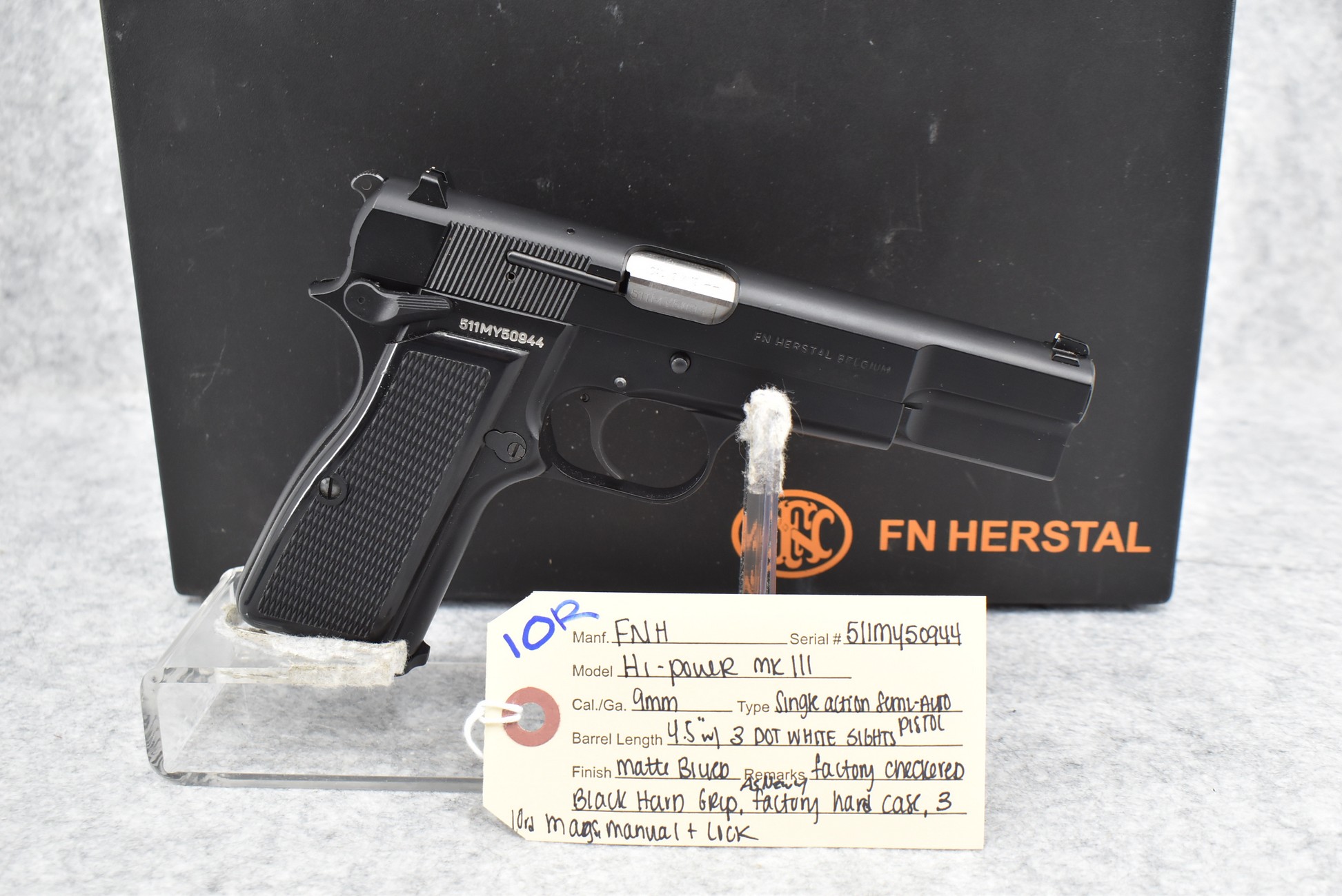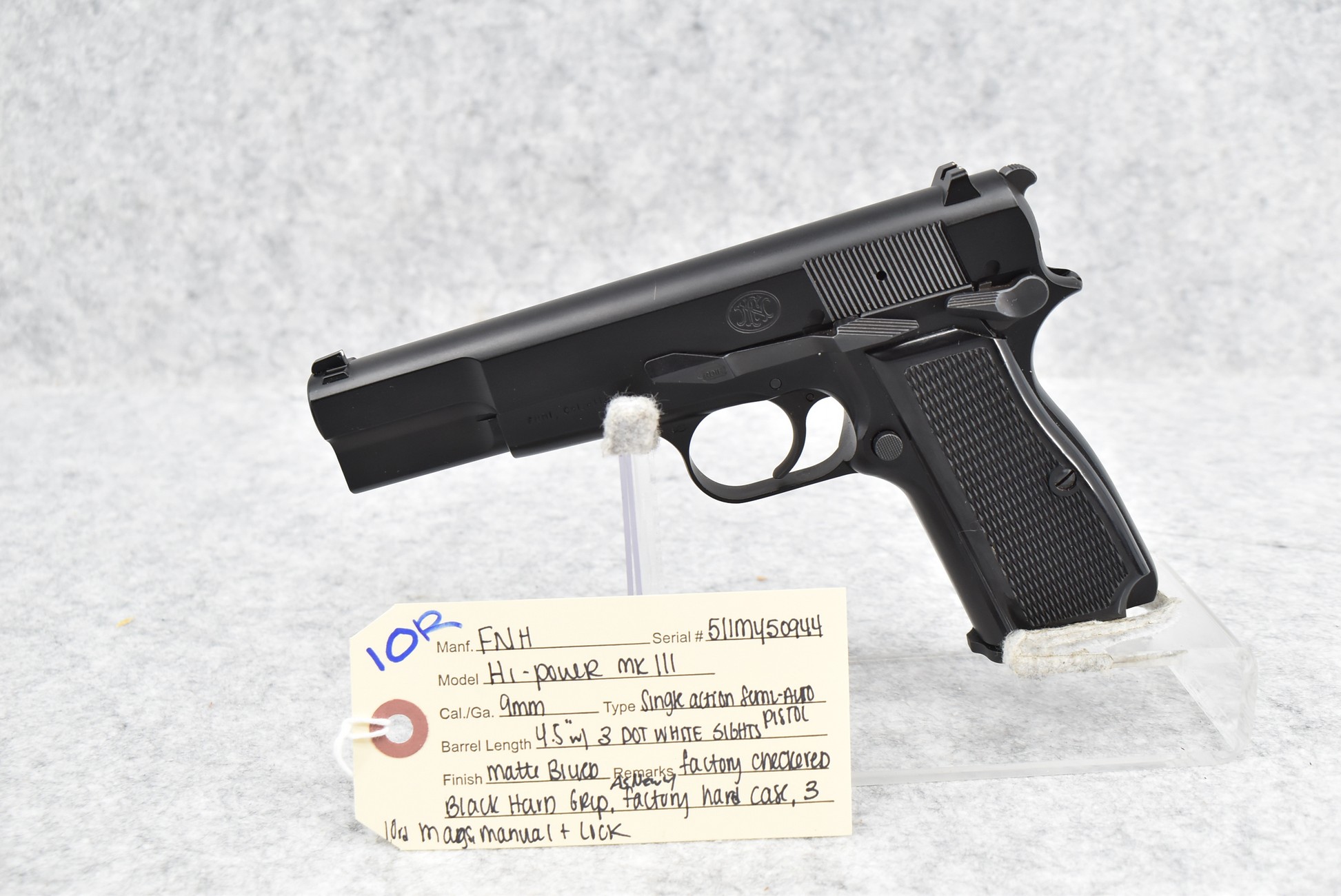 10R. FNH – Mod. Hi-Power MK III – 9mm Cal. Semi-Auto Pistol – w/4.5” Barrel w/3-Dot White Sights – Matte Blued Finish – w/Factory Checkered Grips – As New w/Factory Hard Case, Three 10Rd Mags & Manual
