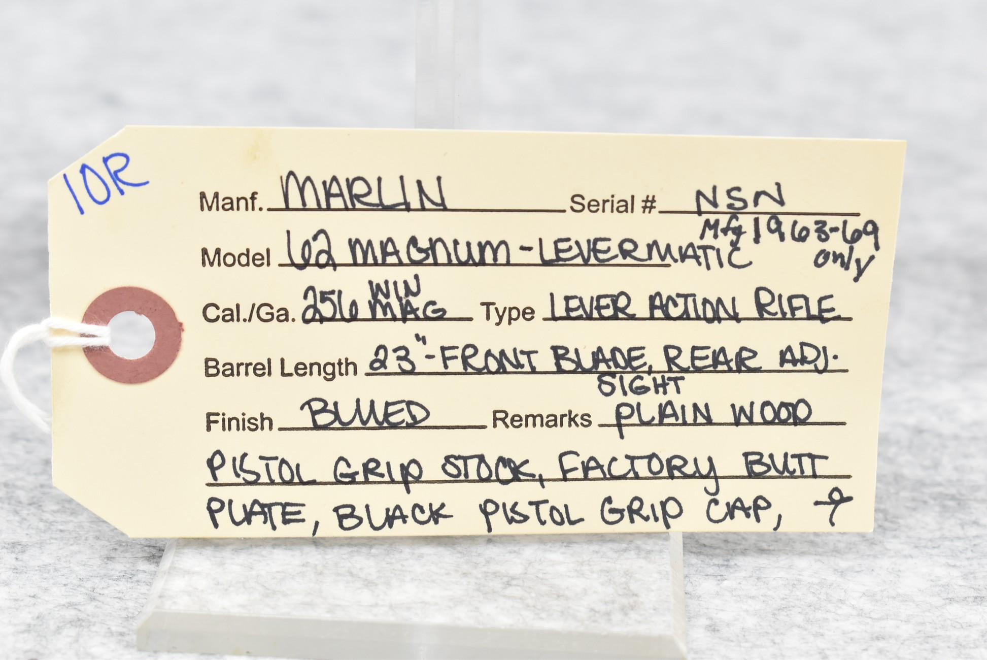 10R. Marlin – Mod. 62 Magnum Levermatic – 256 Win. Mag. Cal. Lever Action Rifle – w/23” Barrel w/Blade Front and Adjustable Rear Sights – Blued Finish – w/Plain Wood Pistol Grip Stock w/Factory Butt Plate and Black Pistol Grip Cap – w/Detachable Magazine – w/Sling Swivel – Manufactured from 1963-69 Only