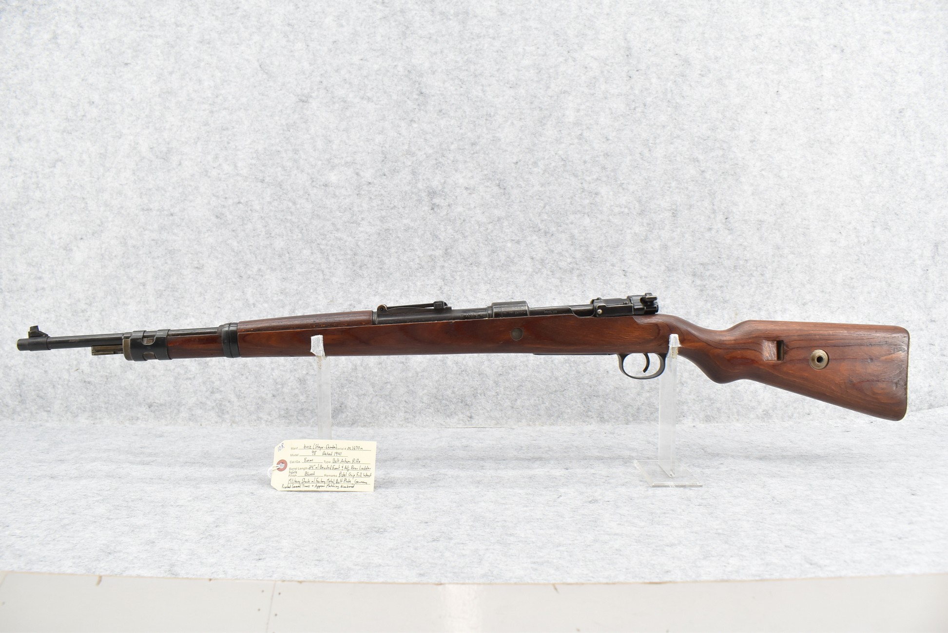 10R. Steyr-Daimler-Puch AG – Mod. 98 – 8mm Cal. Bolt Action Rifle – w/24” Barrel w/Beaded Front & Adj. Rear Ladder Sights – Blued Finish – w/Pistol Grip Full Wood Military Stock w/Factory Metal Butt Plate – German Proofed Several Times – Appears Matching Numbered – Mfg. Code: bnz – Dated 1941