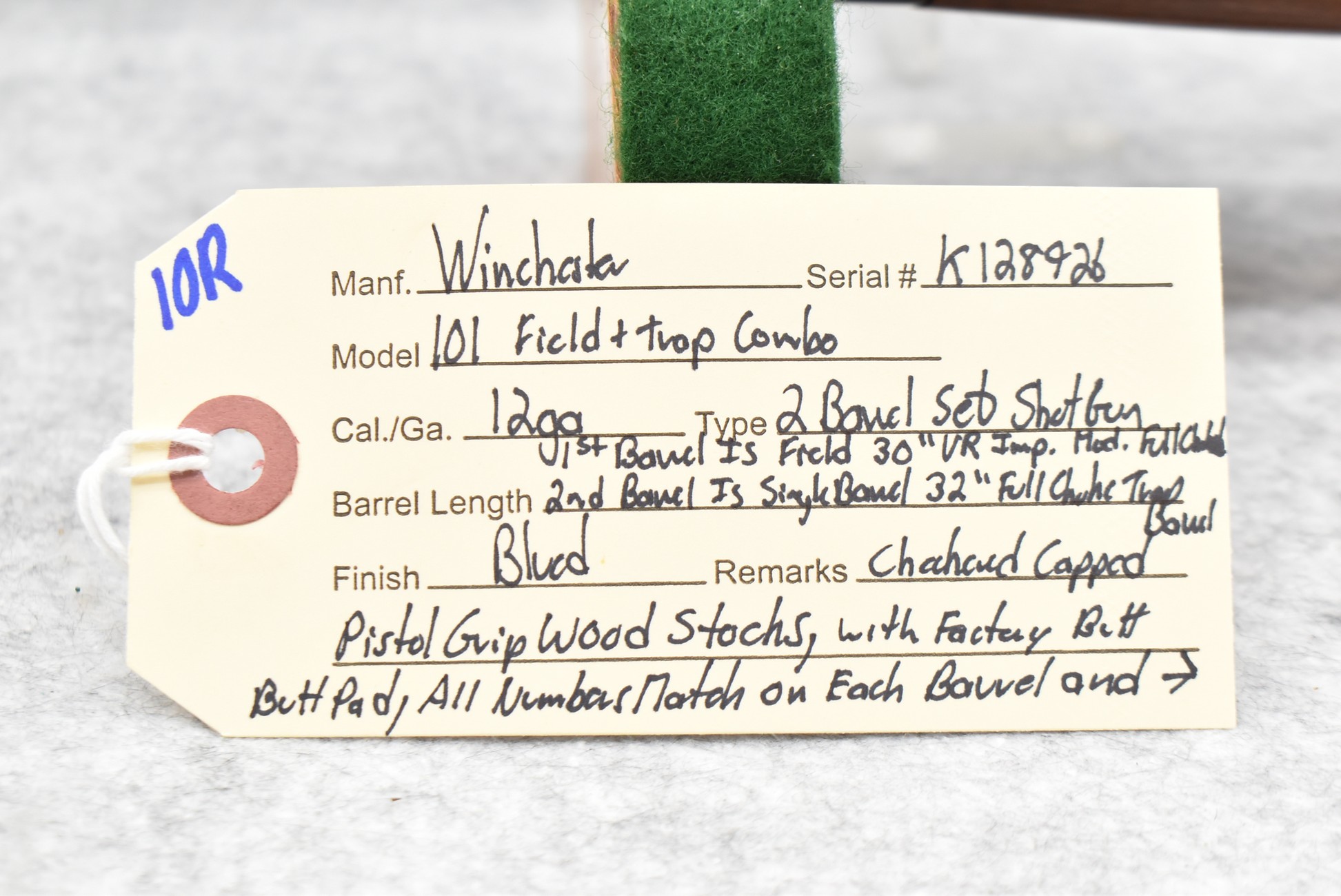 10R. Winchester – Mod. 101 Field/Trap Combo – 12ga. 2-Barrel Set Shotgun – 1st Barrel is a 30” Imp. Mod. & Full Choked Vent Rib Field Barrel – 2nd Barrel is a 32” Full Choke Trap Single Barrel – Blued Finish – w/Checkered Capped Pistol Grip Wood Stocks w/Factory Butt Pad – All Numbers Match on Each Barrel and Both Forearms – w/Single Select Trigger