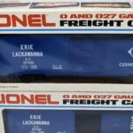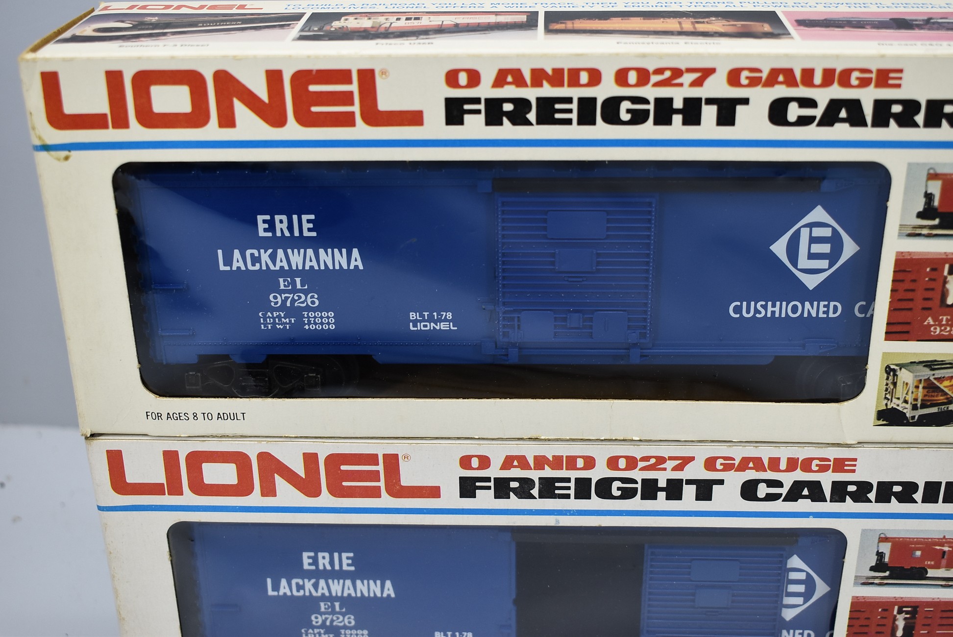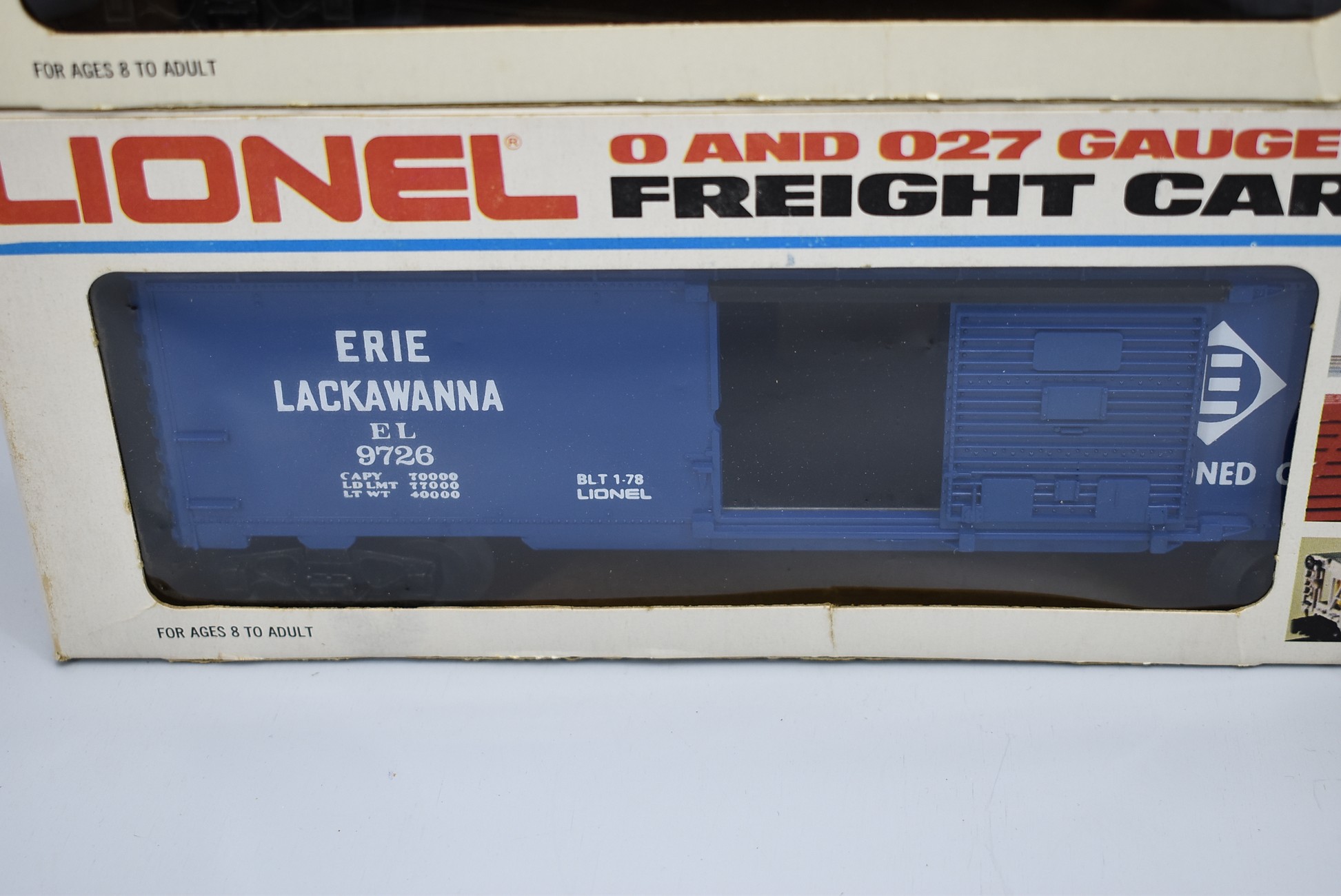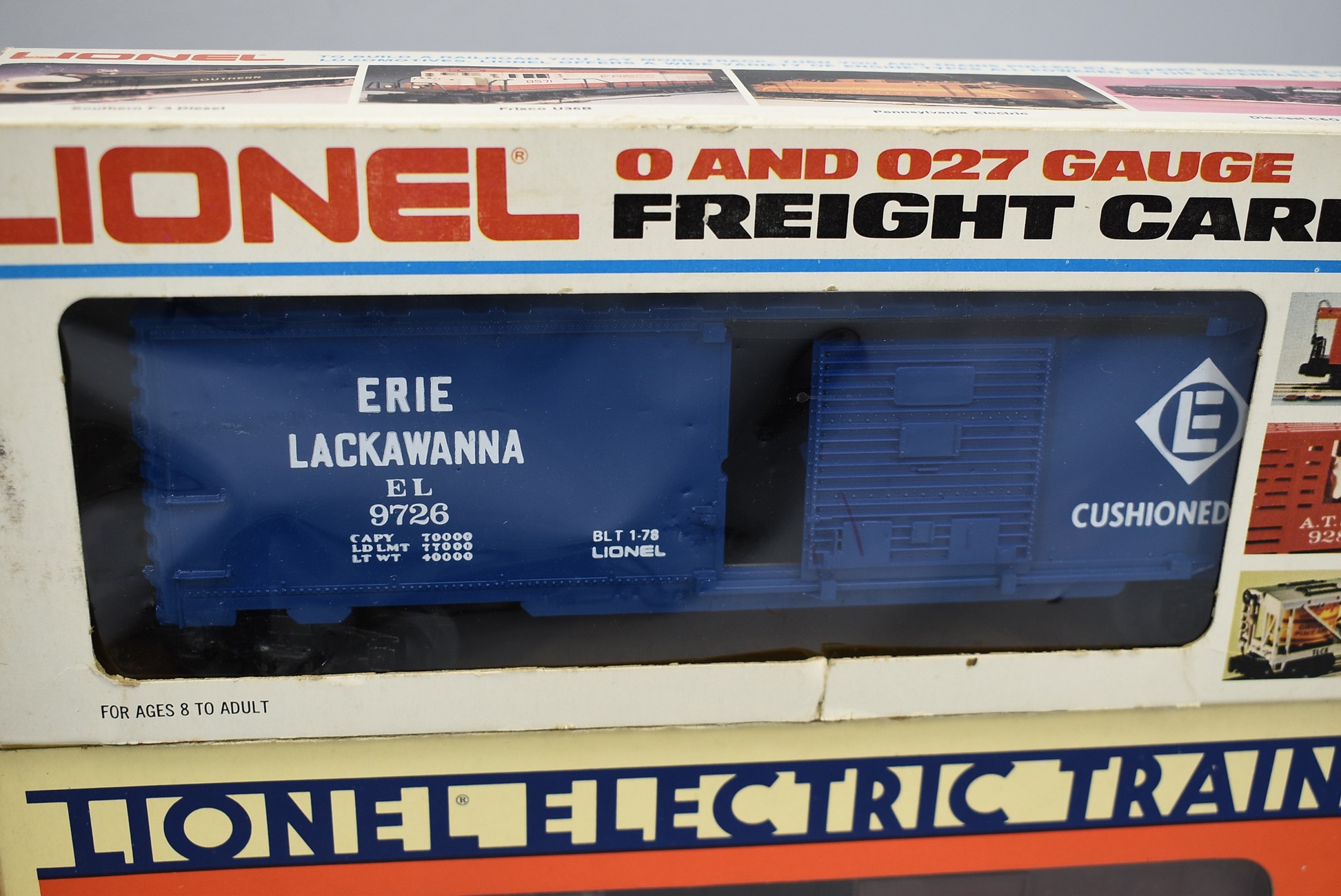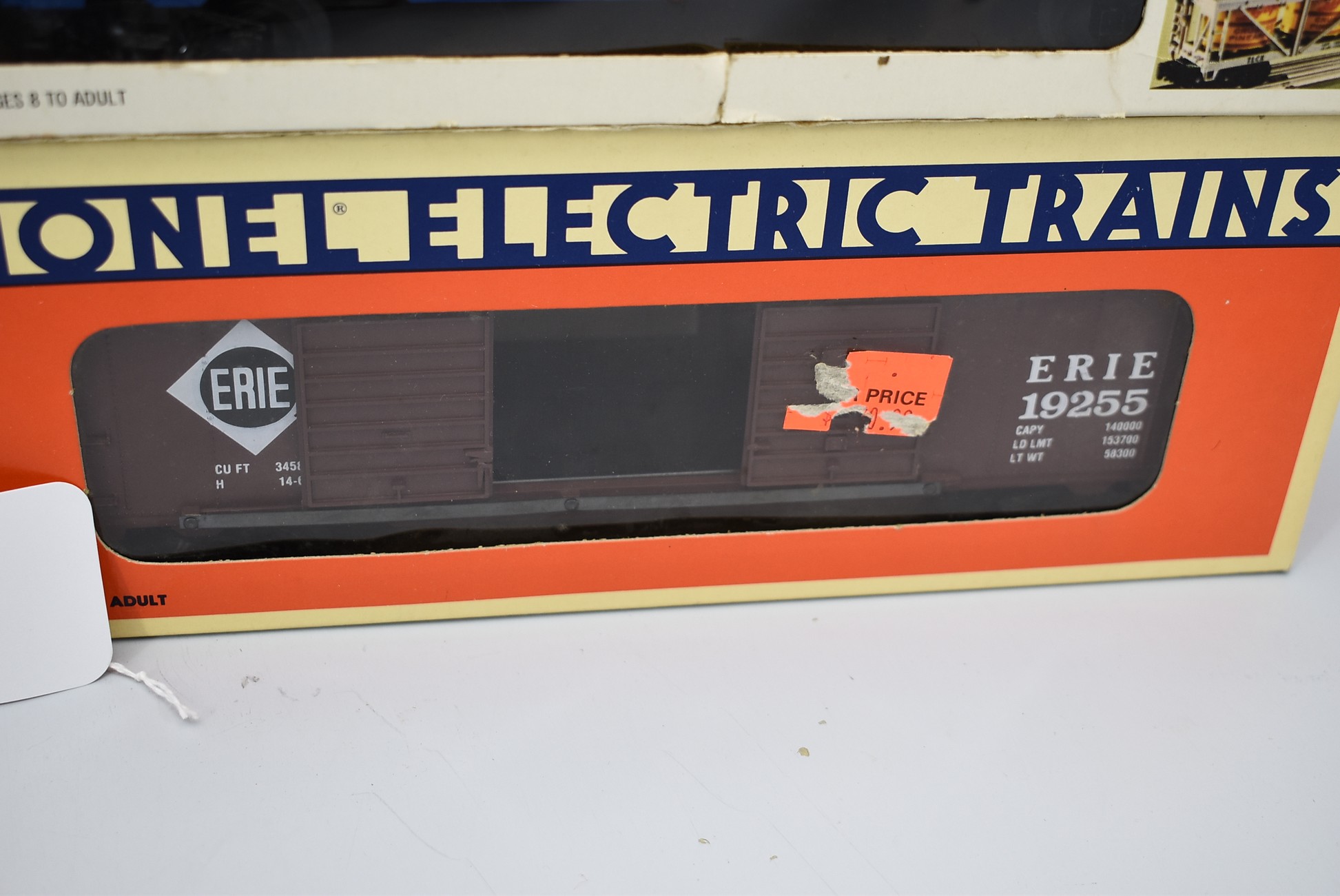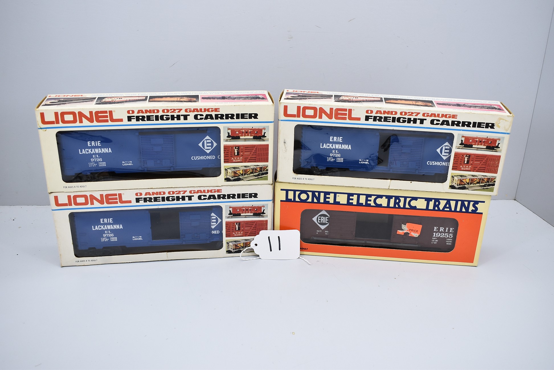 11. Lot of 4 Lionel O-Gauge Box Cars – Including Erie Double Door Box Car 6-19255 and (3) Erie Lackawanna Box Cars 6-9726 – All w/Boxes