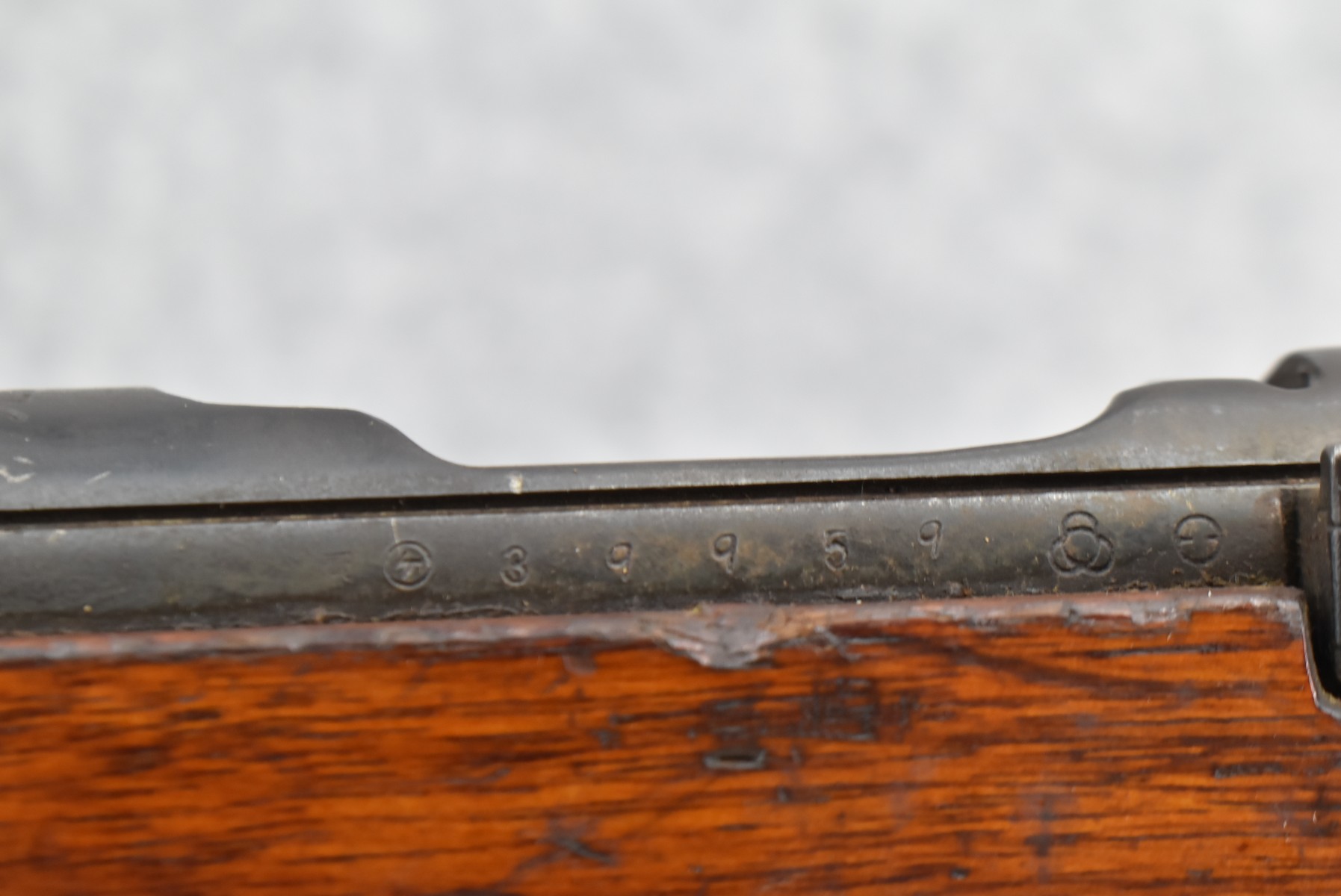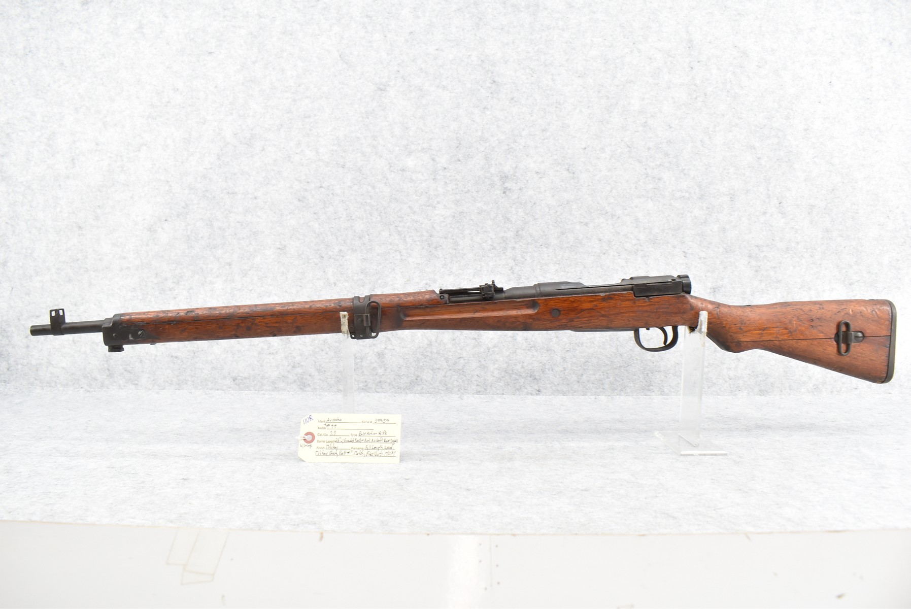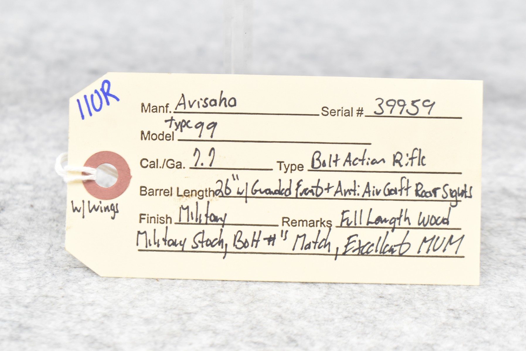 110R. Arisaka – Type 99 – 7.7 Cal. Bolt Action Rifle – w/26” Barrel w/Guarded Front Sight & Anti-Aircraft Rear w/Wings Sight – Military Finish – w/Full Length Wood Military Stock – w/Matching # Bolt – Excellent Mum