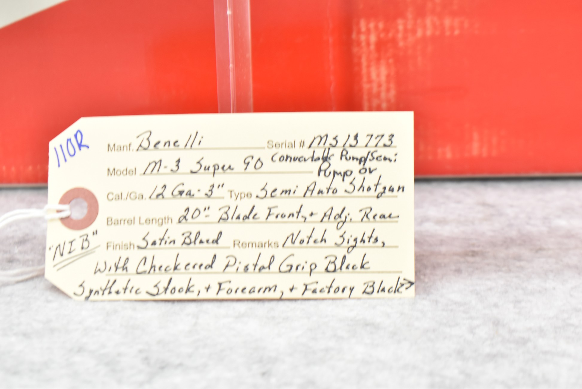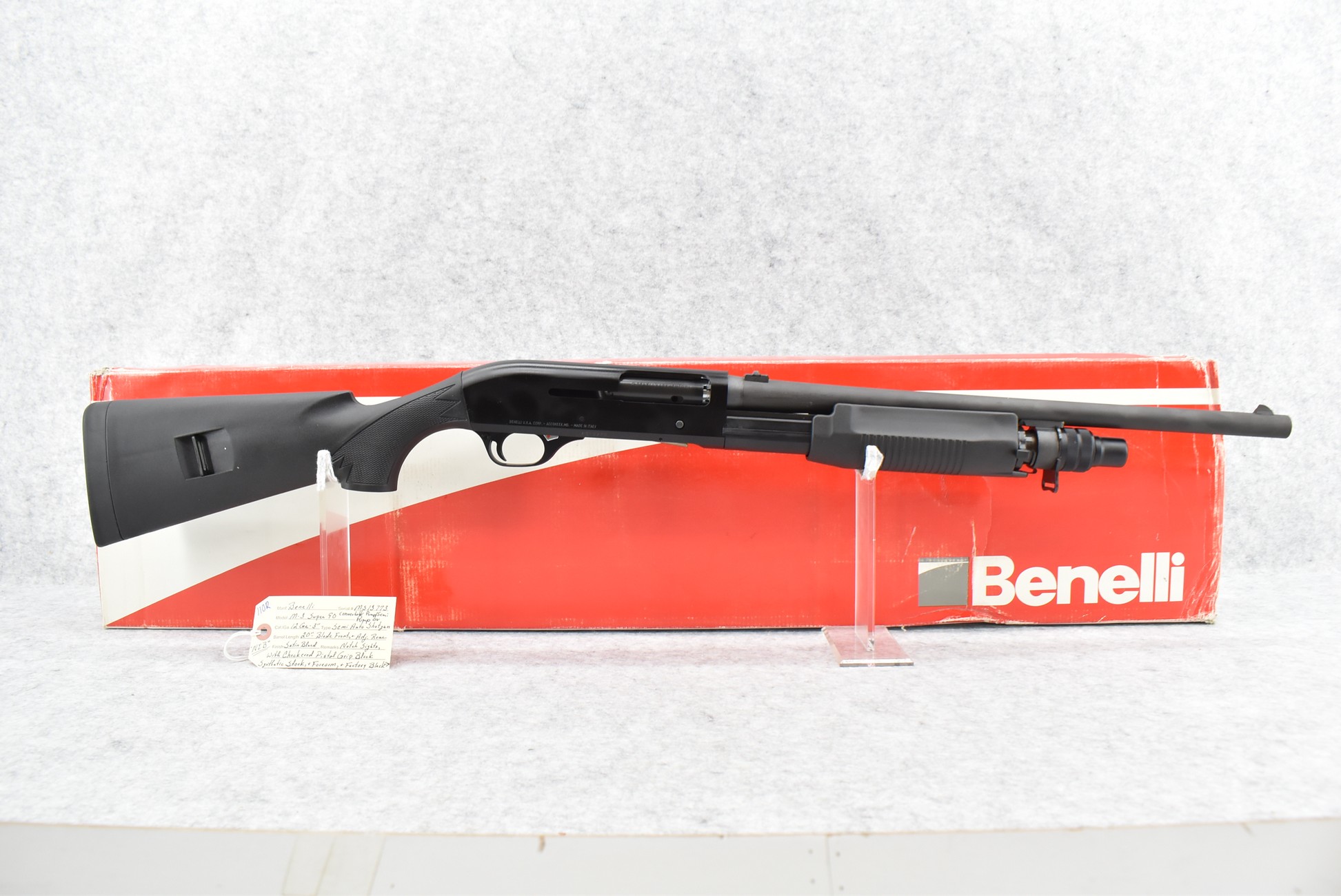 110R. Benelli – Mod. M-3 Super 90 Convertible Pump/Semi – 12ga. Pump or Semi Auto Shotgun – w/20” Barrel w/Blade Front & Adj. Rear Notch Sights – Satin Blued Finish – w/Checkered Pistol Grip Black Synthetic Stocks w/Factory Butt Pad – New w/Factory Box, Manual & Accessories