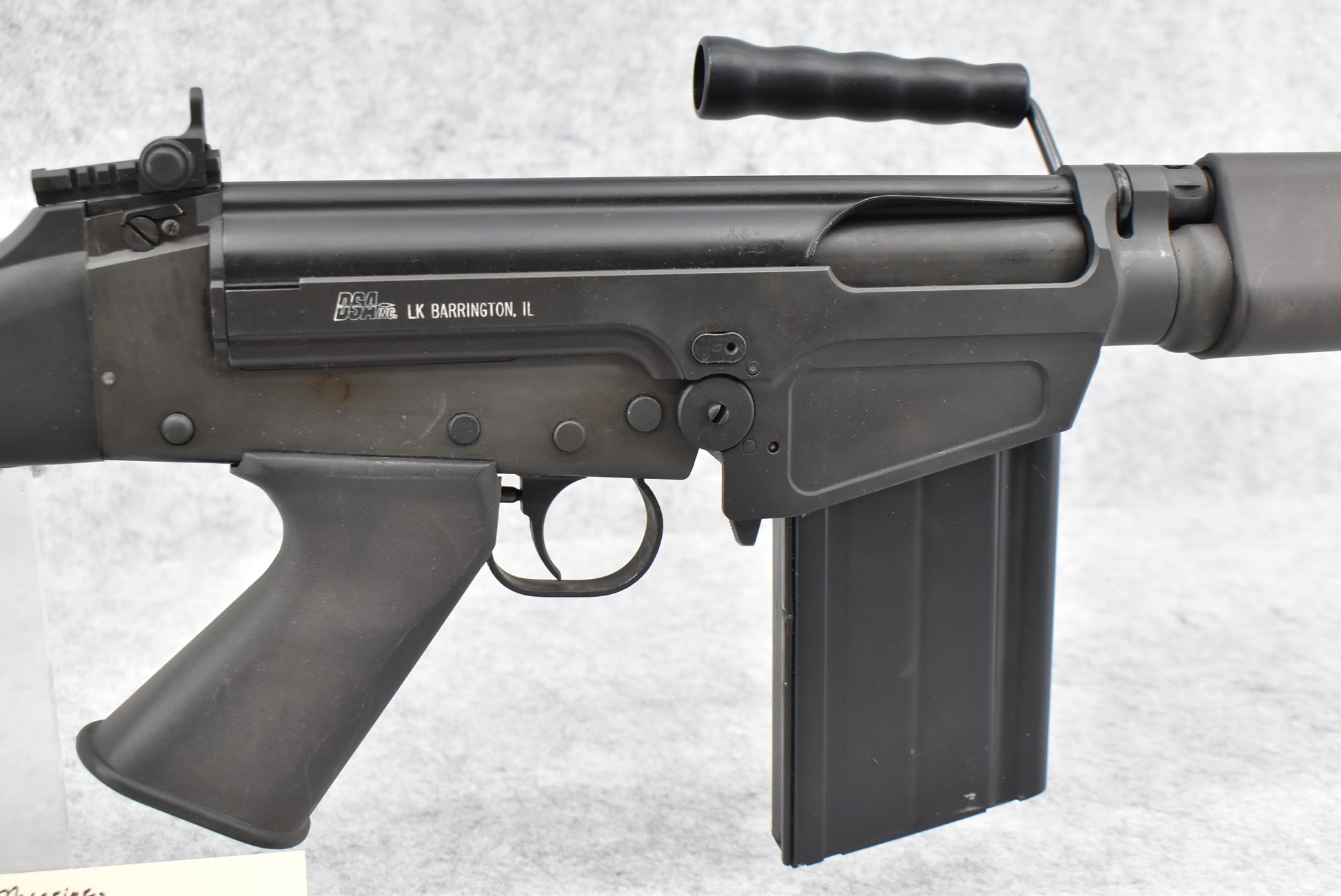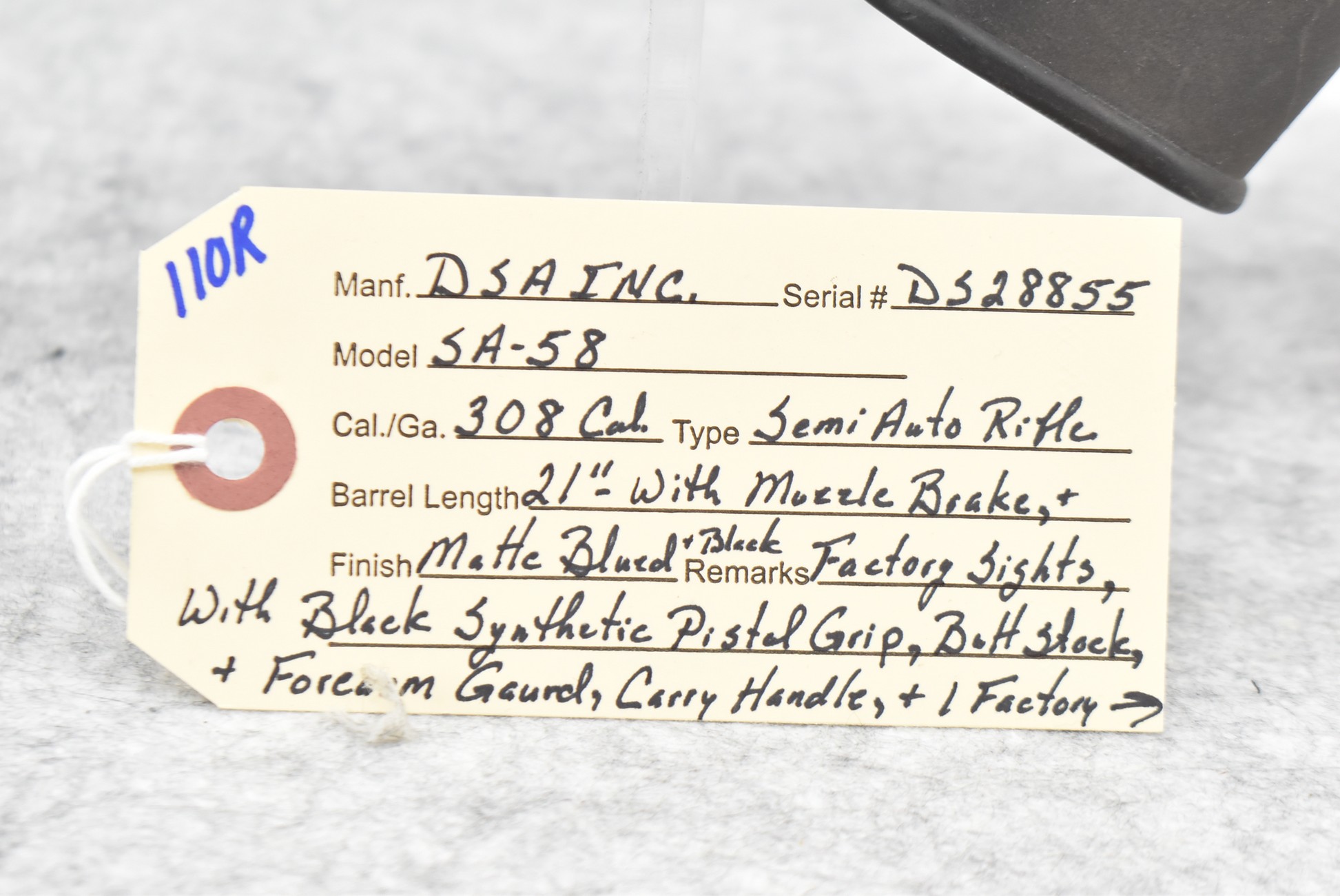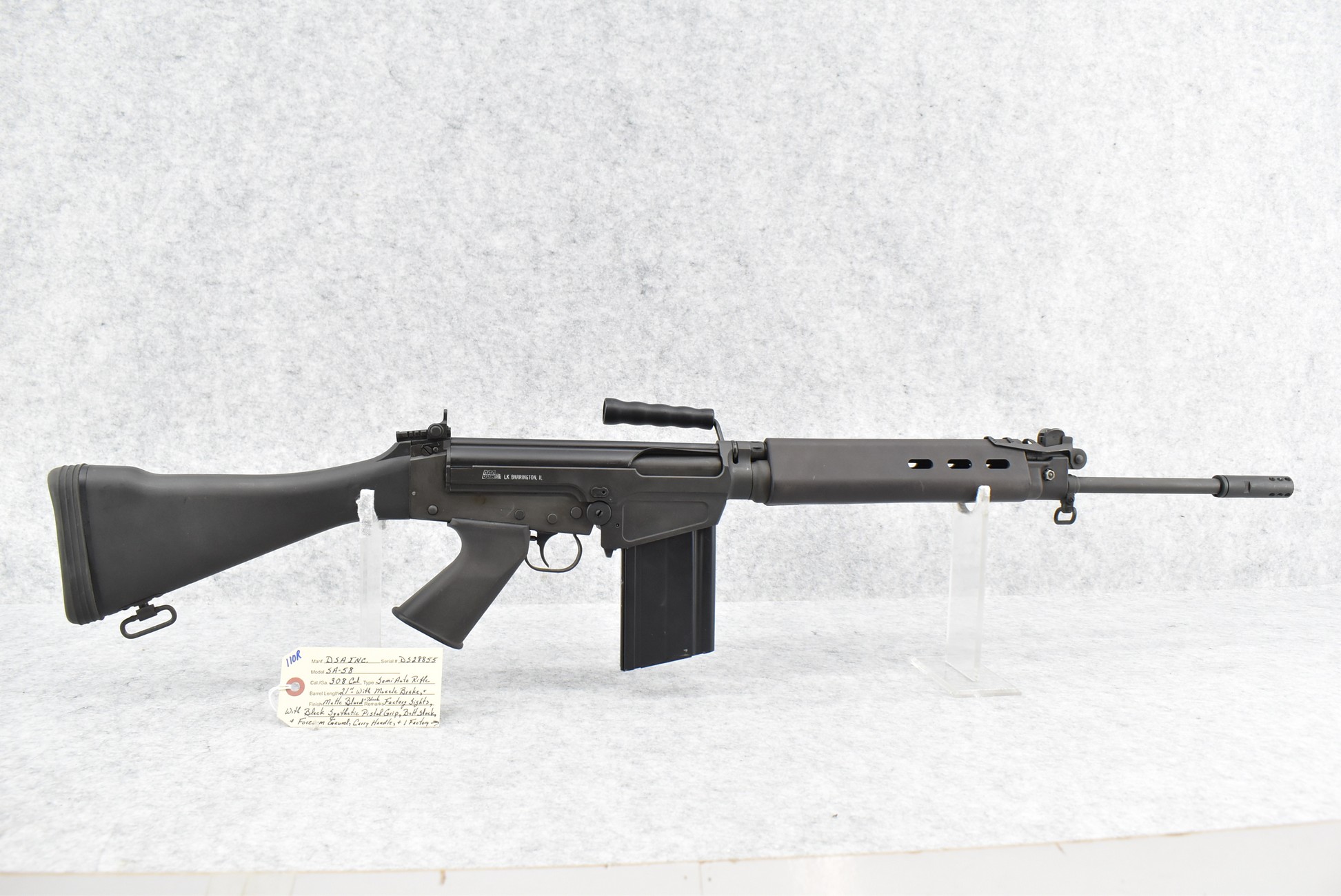 110R. DSA Inc. – Mod. SA-58 – 308 Cal. Semi-Auto Rifle – w/21” Barrel w/Factory Sights & Muzzle Brake – Matte Blued Finish – w/Black Synthetic Pistol Grip, Butt Stock & Forearm Guard – w/Carry Handle – w/Factory Detachable Magazine (CANNOT GO TO MARYLAND!)
