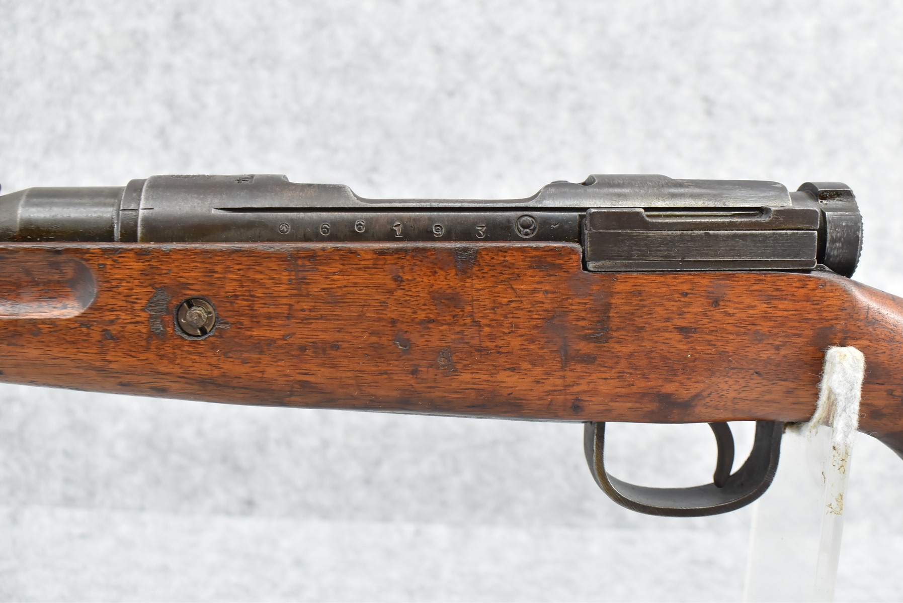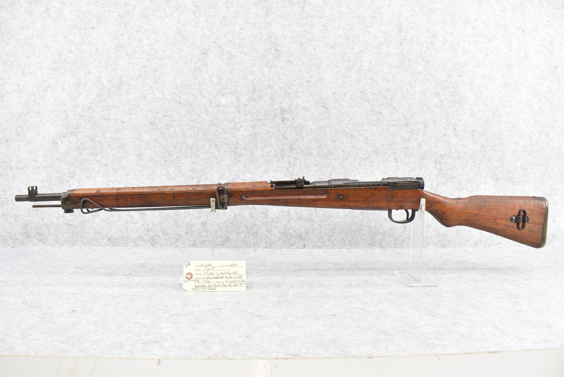 111R.     Arisaka – Type 99 – 7.7 Jap Cal. Bolt Action Rifle – w/26” Barrel w/Guarded Front & Adj. Rear Aircraft Sights w/Wings – Military Finish – w/Full Length Military Wood Stocks w/Front Mounted Mono-Pod – w/Matching # Bolt – Mum Defaced