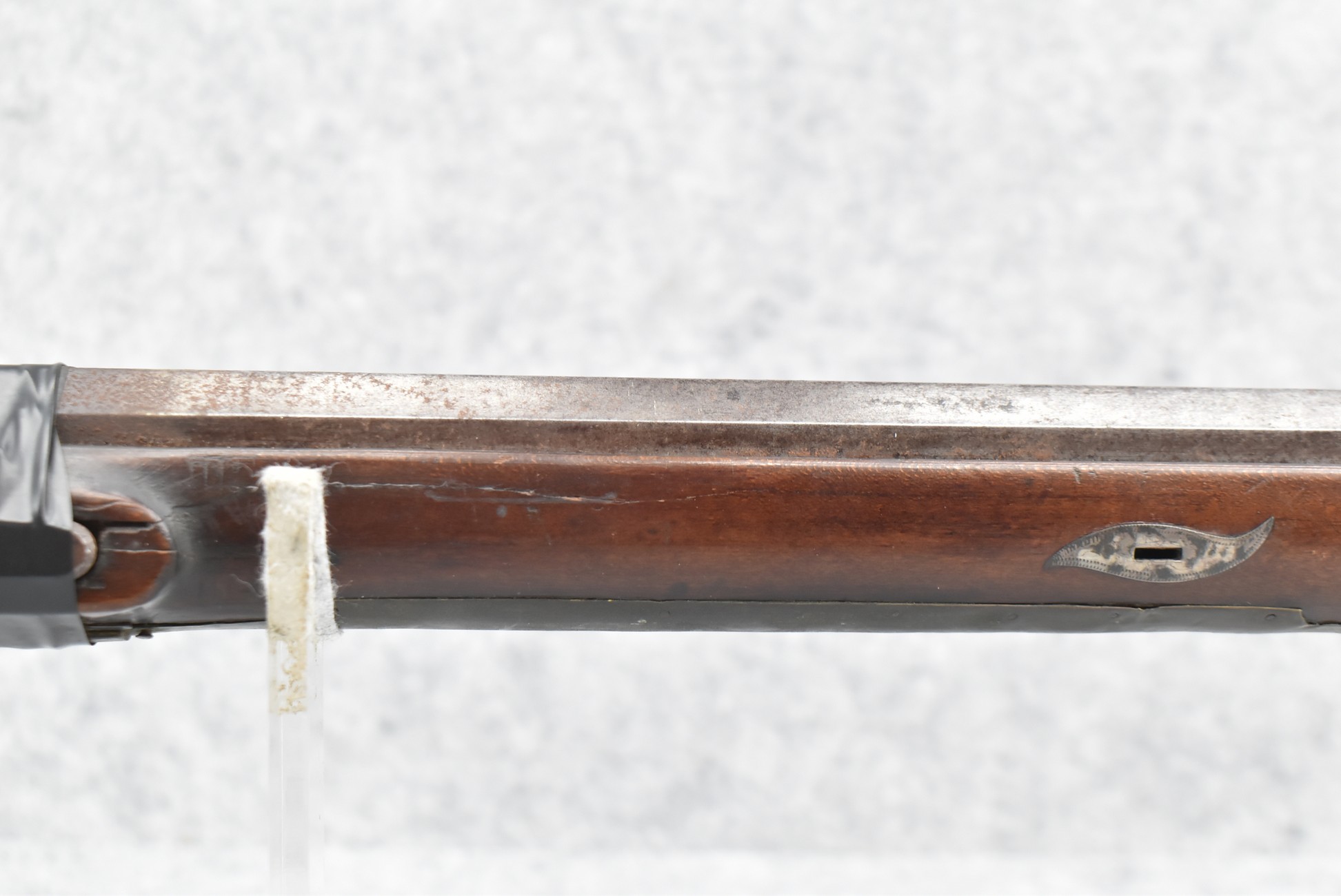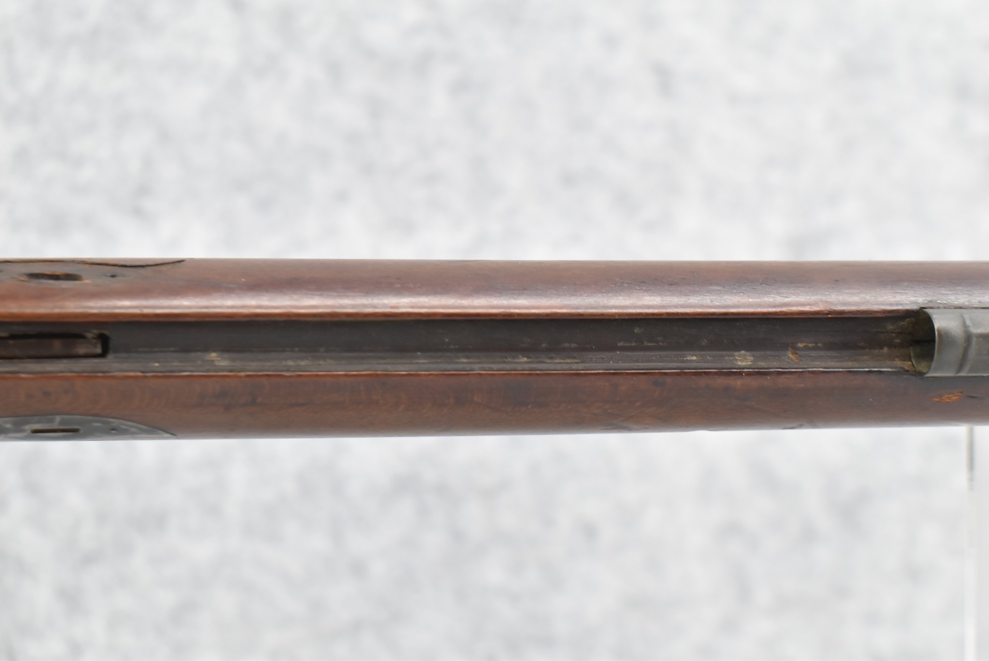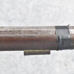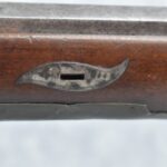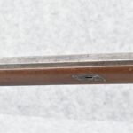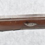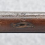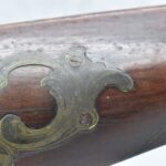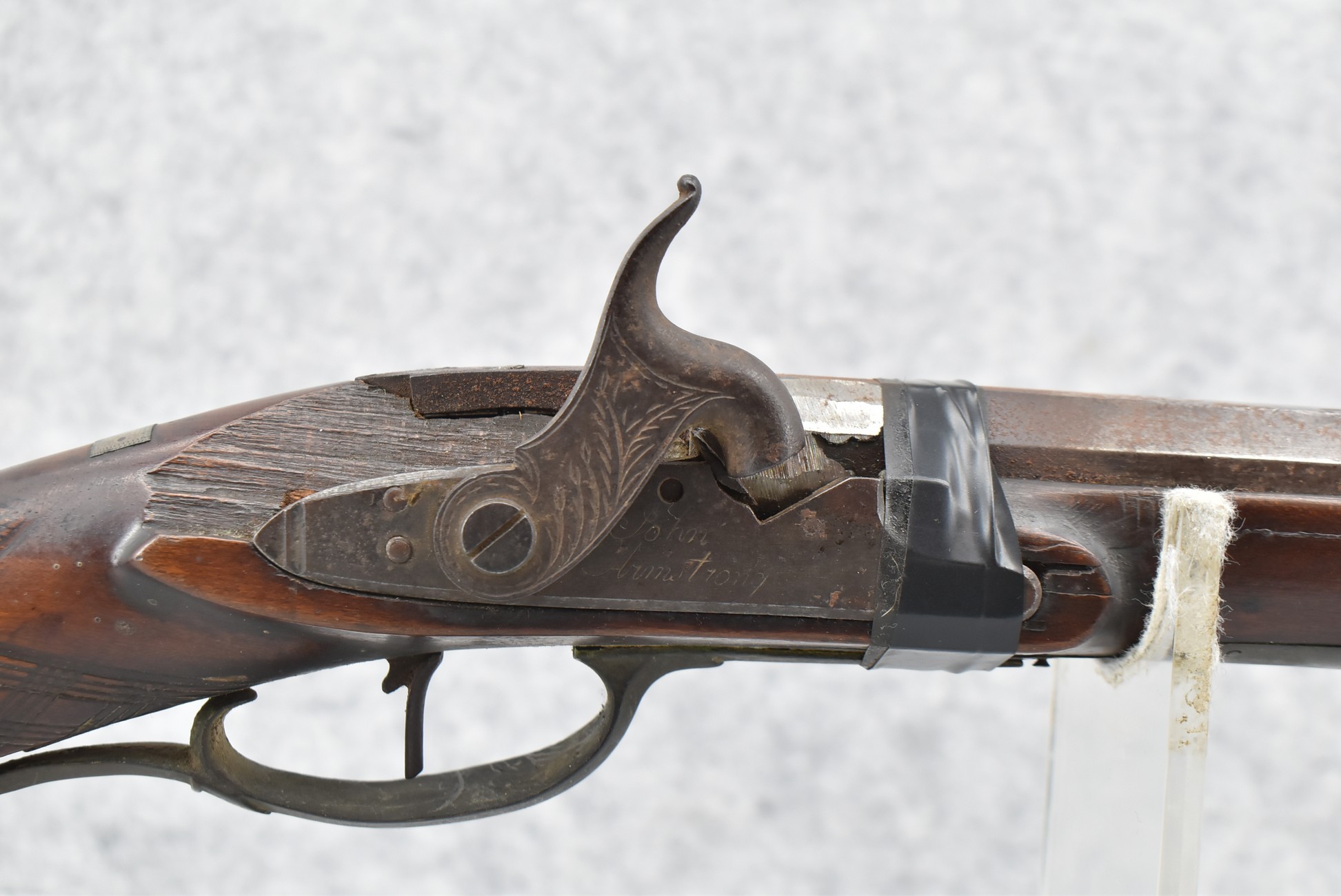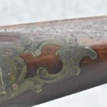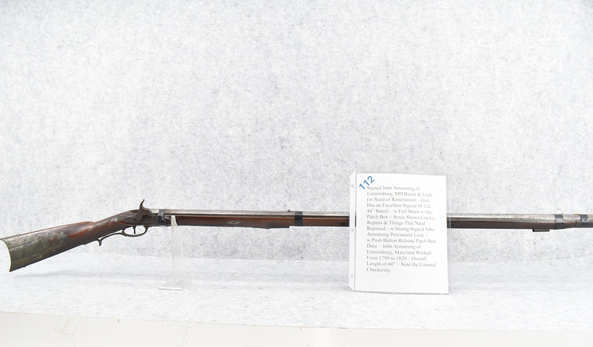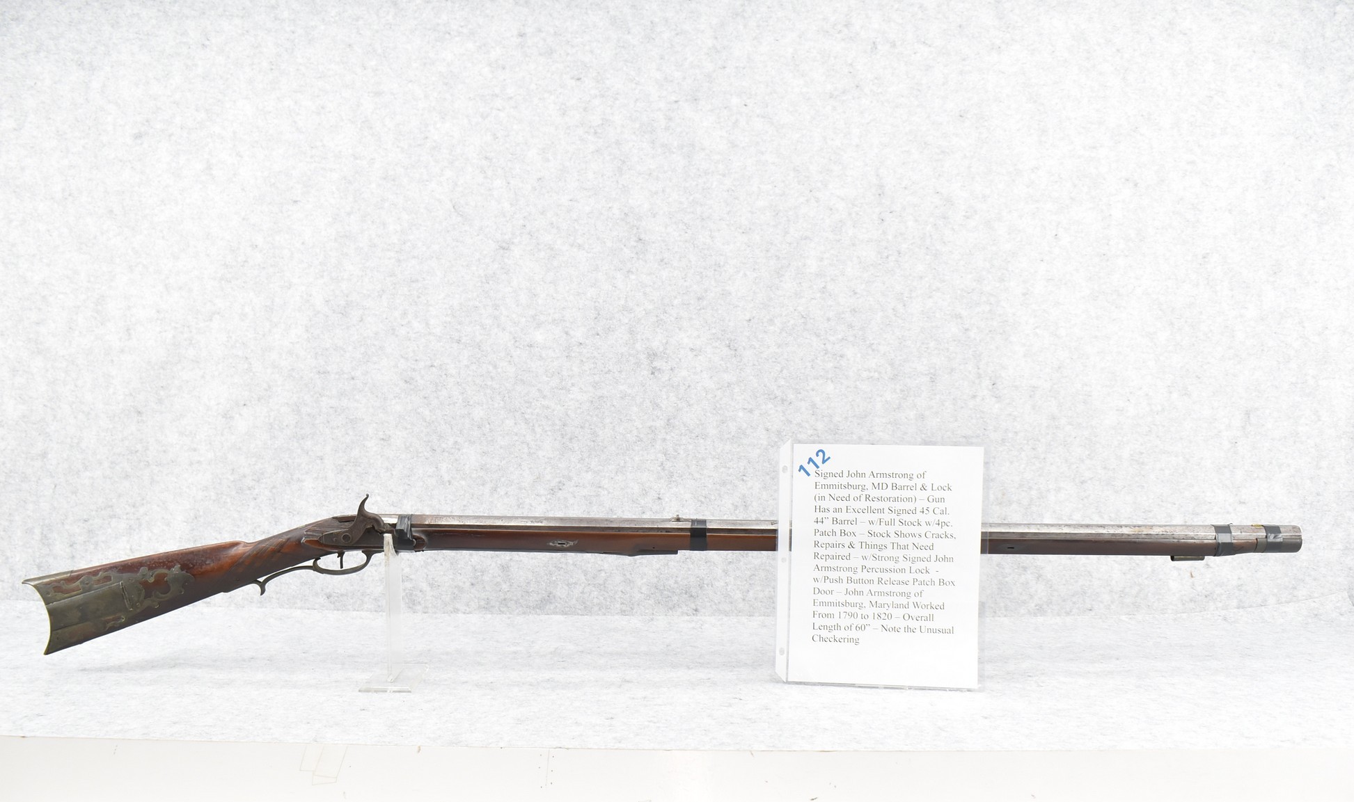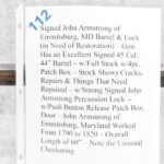 112. Signed John Armstrong of Emmitsburg, MD Barrel & Lock (in Need of Restoration) – Gun Has an Excellent Signed 45 Cal. 44” Barrel – w/Full Stock w/4pc. Patch Box – Stock Shows Cracks, Repairs & Things That Need Repaired – w/Strong Signed John Armstrong Percussion Lock – w/Push Button Release Patch Box Door – John Armstrong of Emmitsburg, Maryland Worked From 1790 to 1820 – Overall Length of 60” – Note the Unusual Checkering