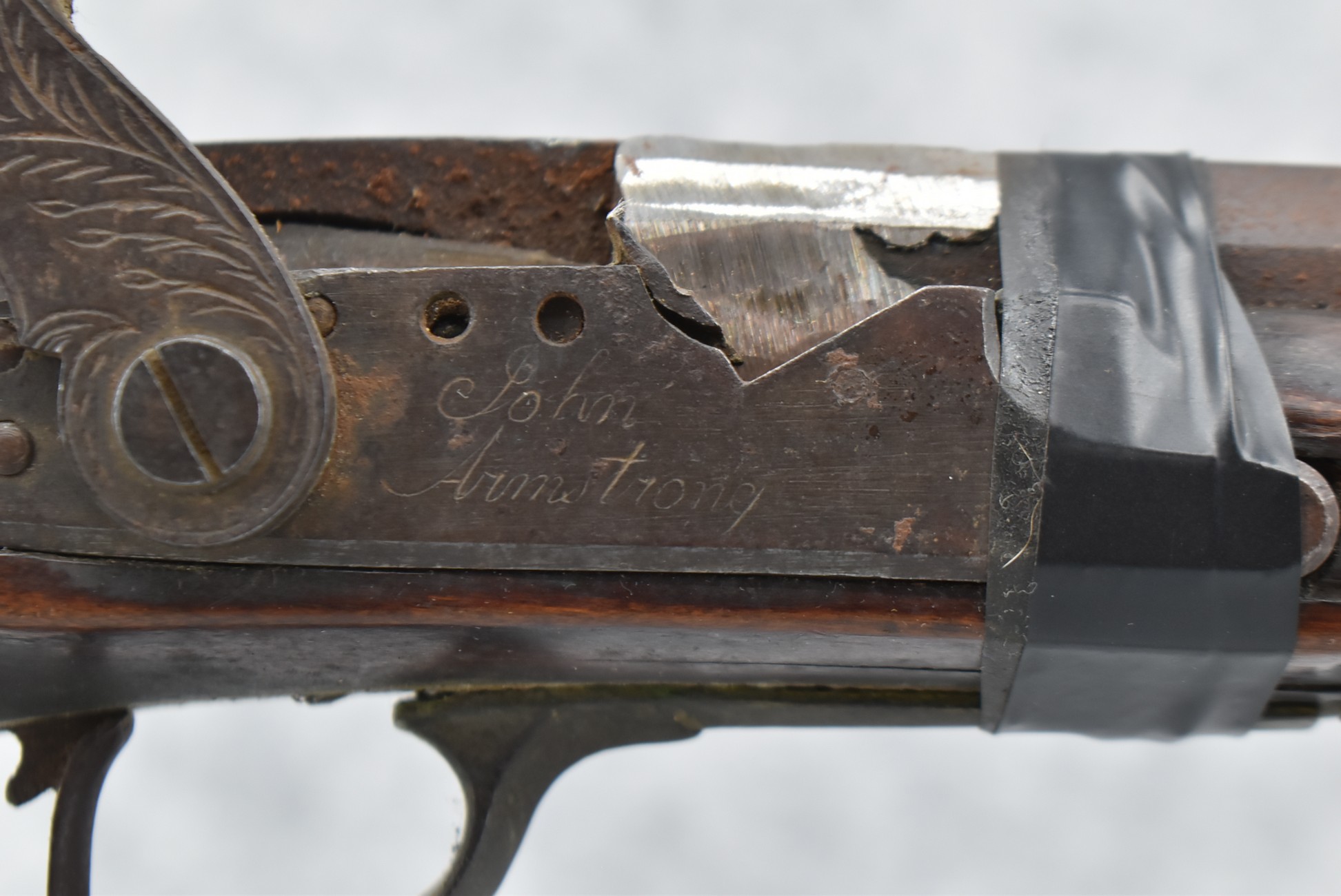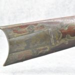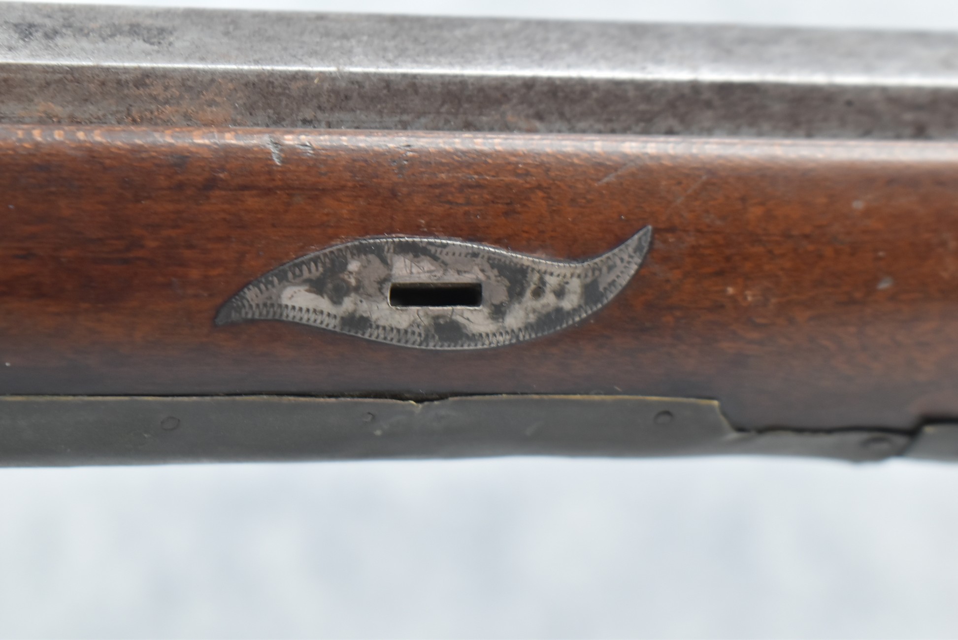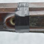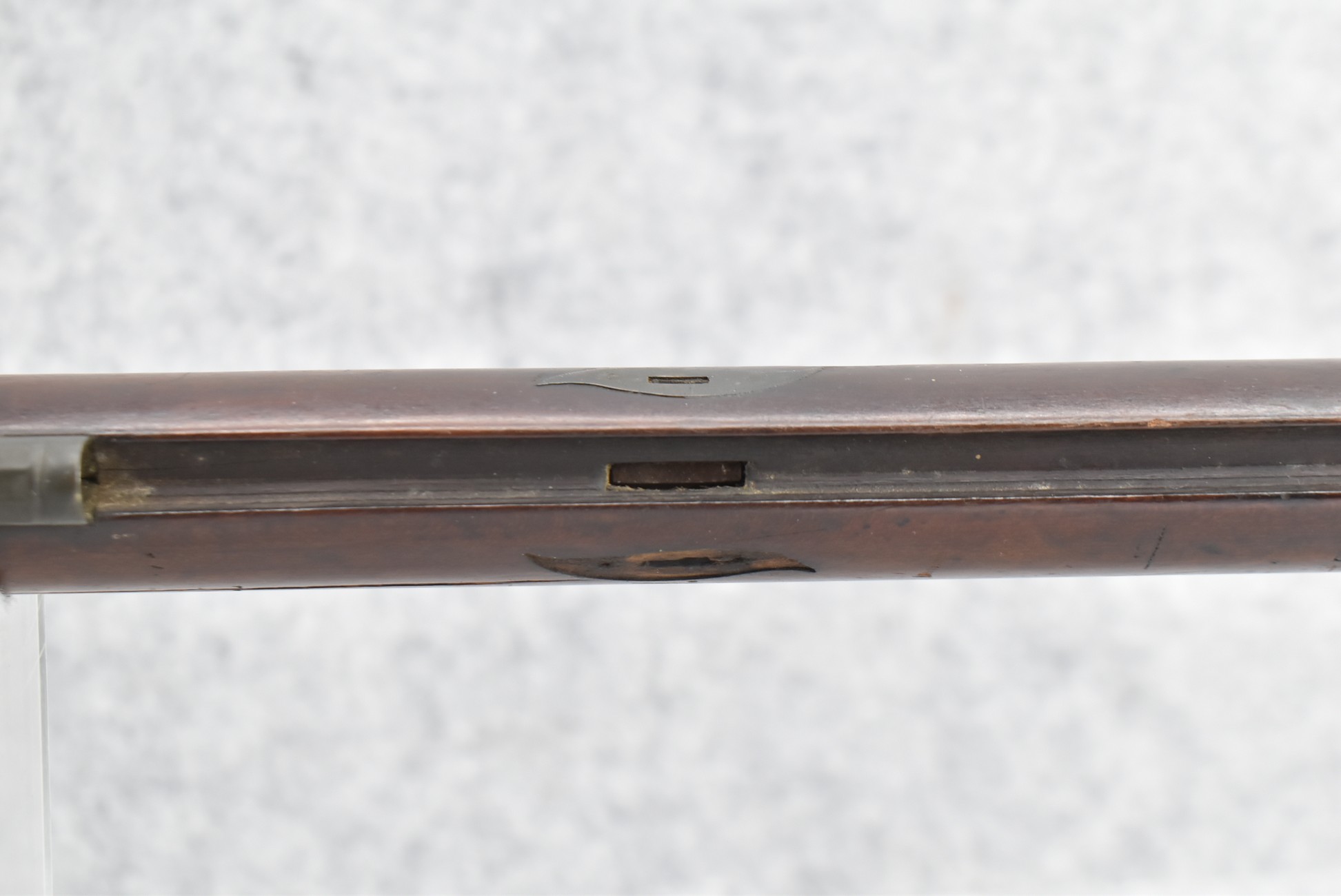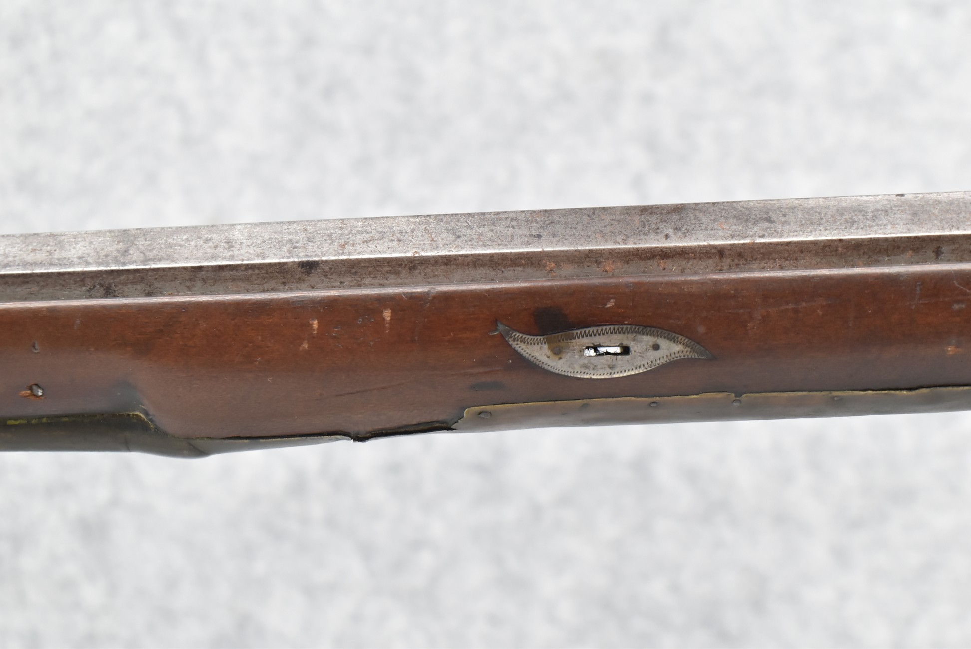 112. Signed John Armstrong of Emmitsburg, MD Barrel & Lock (in Need of Restoration) – Gun Has an Excellent Signed 45 Cal. 44” Barrel – w/Full Stock w/4pc. Patch Box – Stock Shows Cracks, Repairs & Things That Need Repaired – w/Strong Signed John Armstrong Percussion Lock – w/Push Button Release Patch Box Door – John Armstrong of Emmitsburg, Maryland Worked From 1790 to 1820 – Overall Length of 60” – Note the Unusual Checkering