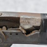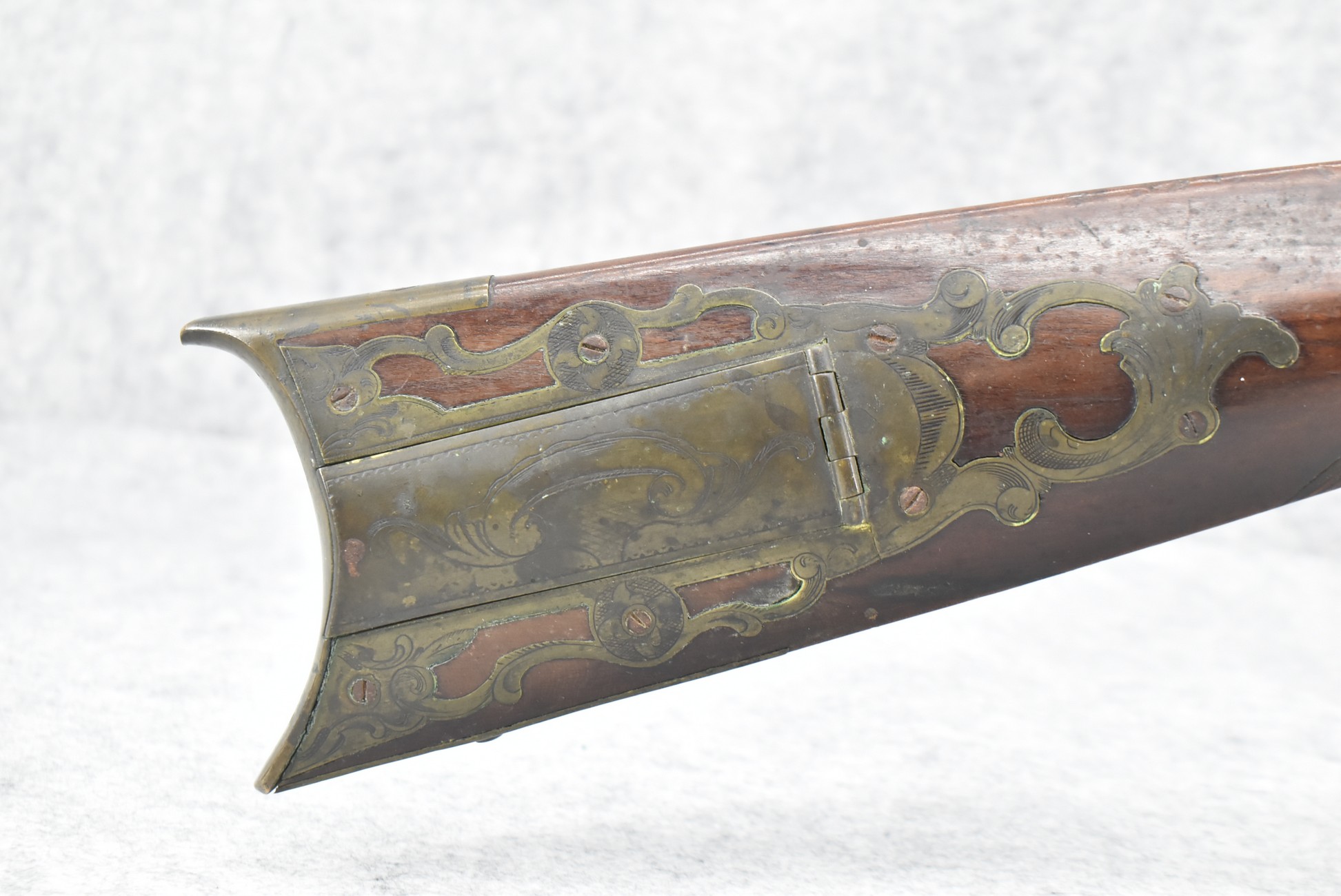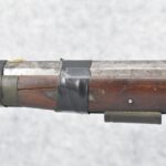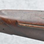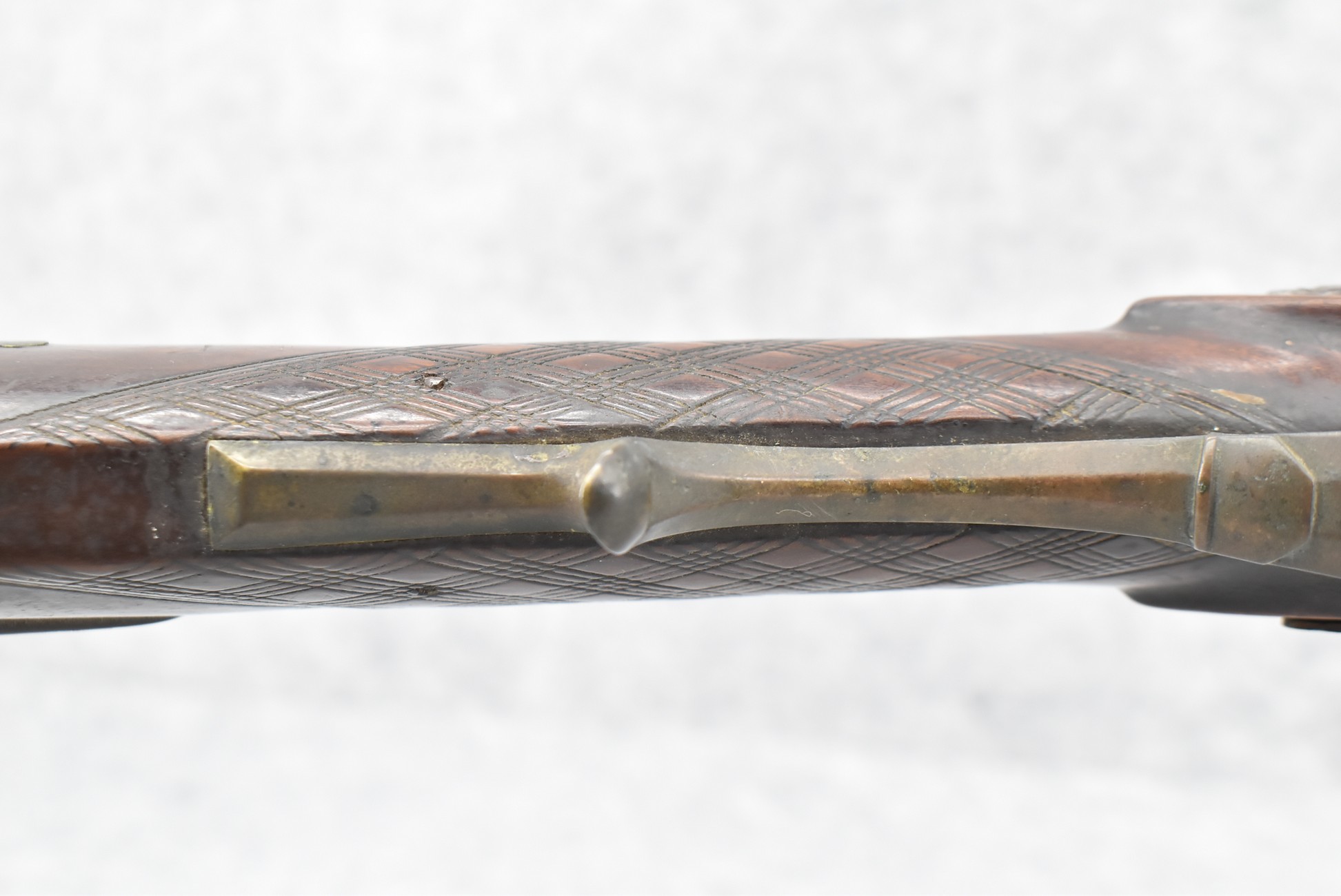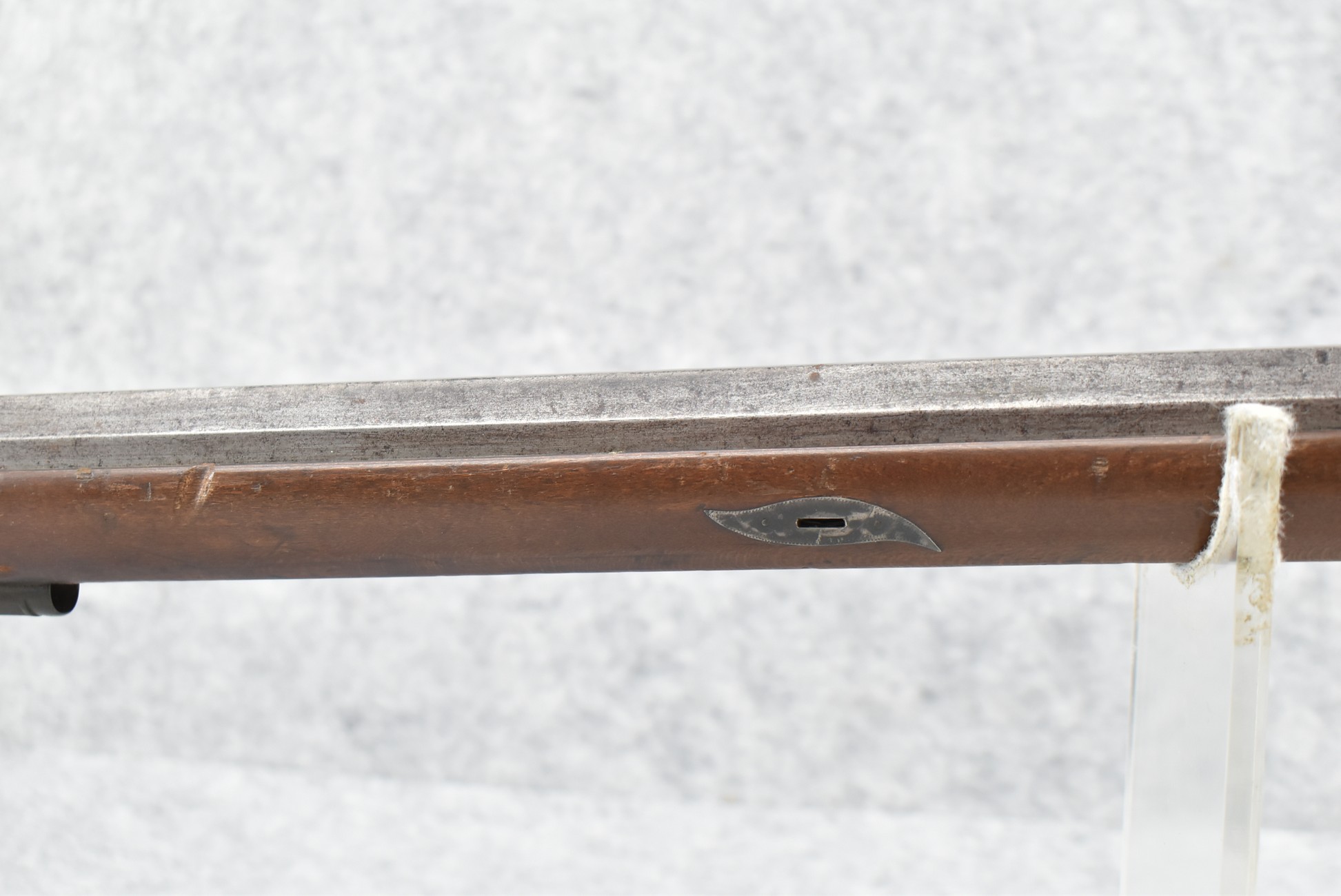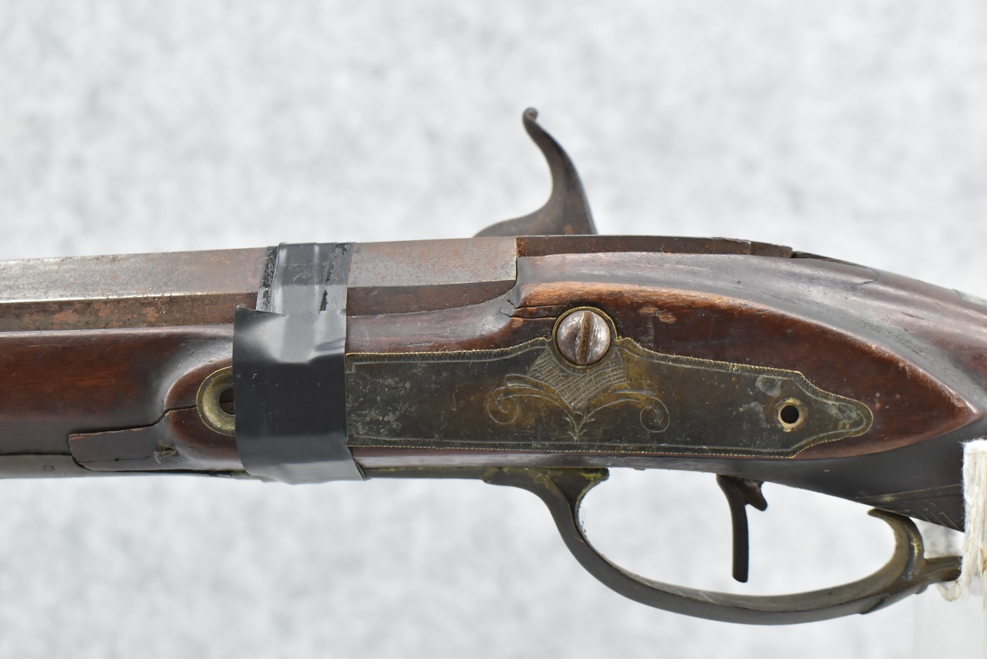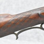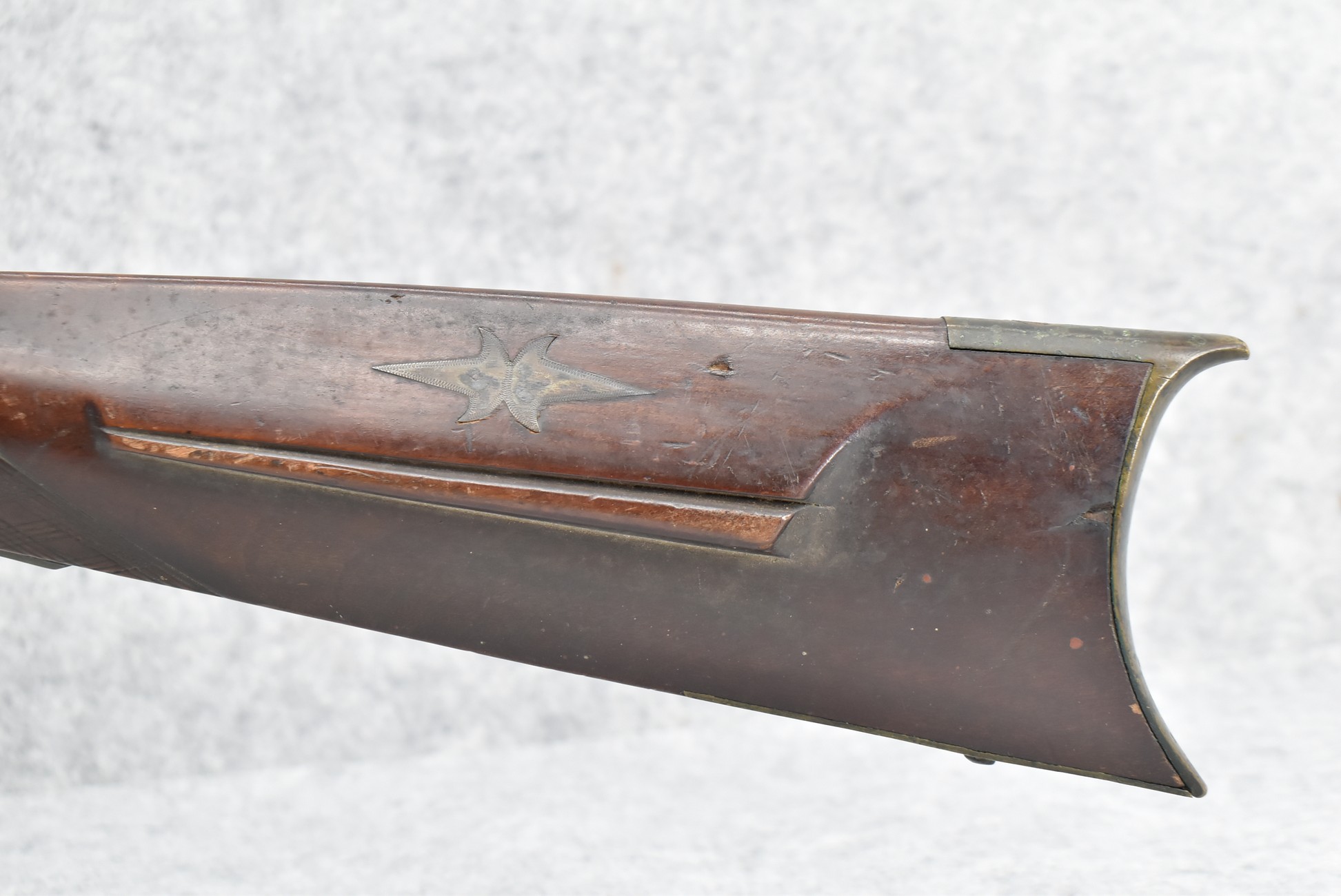 112. Signed John Armstrong of Emmitsburg, MD Barrel & Lock (in Need of Restoration) – Gun Has an Excellent Signed 45 Cal. 44” Barrel – w/Full Stock w/4pc. Patch Box – Stock Shows Cracks, Repairs & Things That Need Repaired – w/Strong Signed John Armstrong Percussion Lock – w/Push Button Release Patch Box Door – John Armstrong of Emmitsburg, Maryland Worked From 1790 to 1820 – Overall Length of 60” – Note the Unusual Checkering