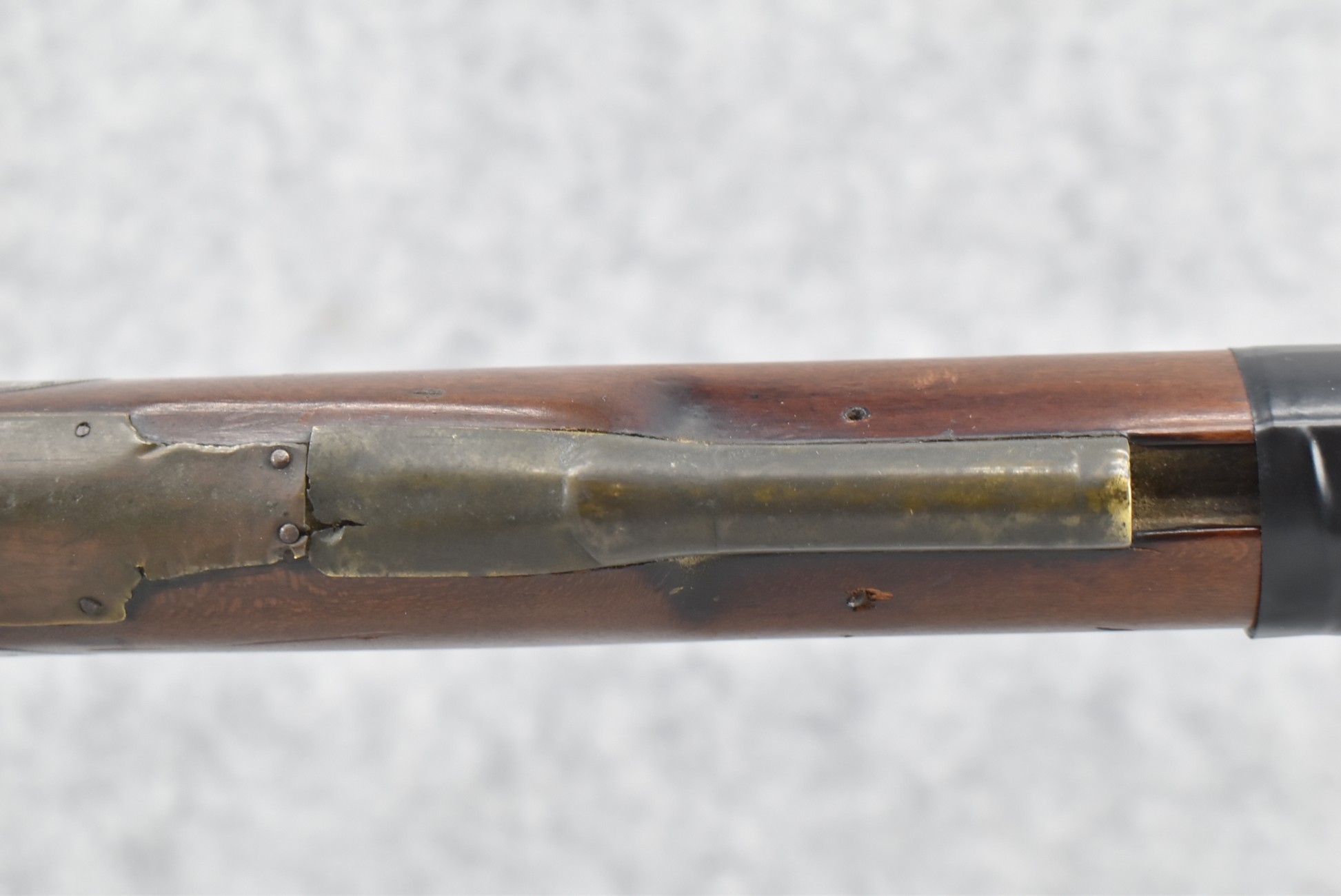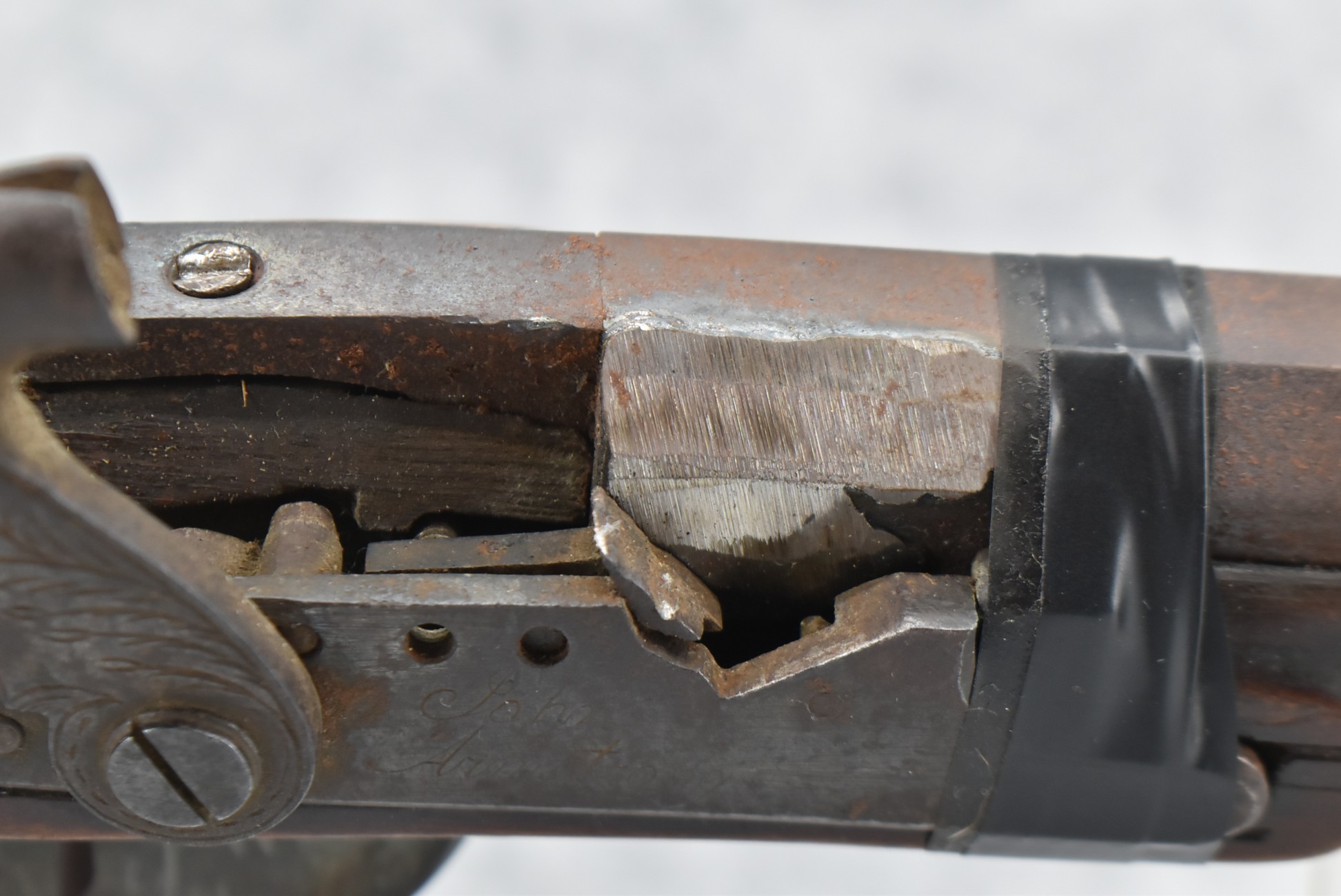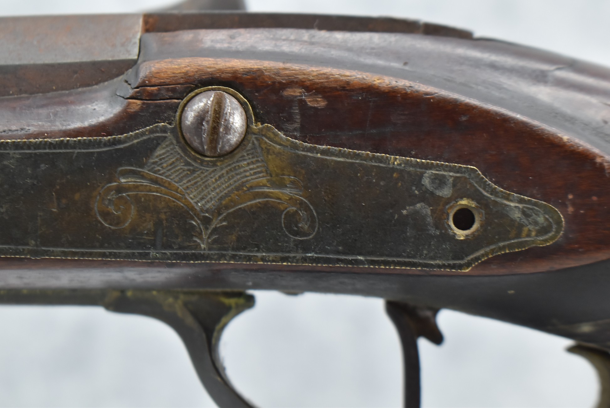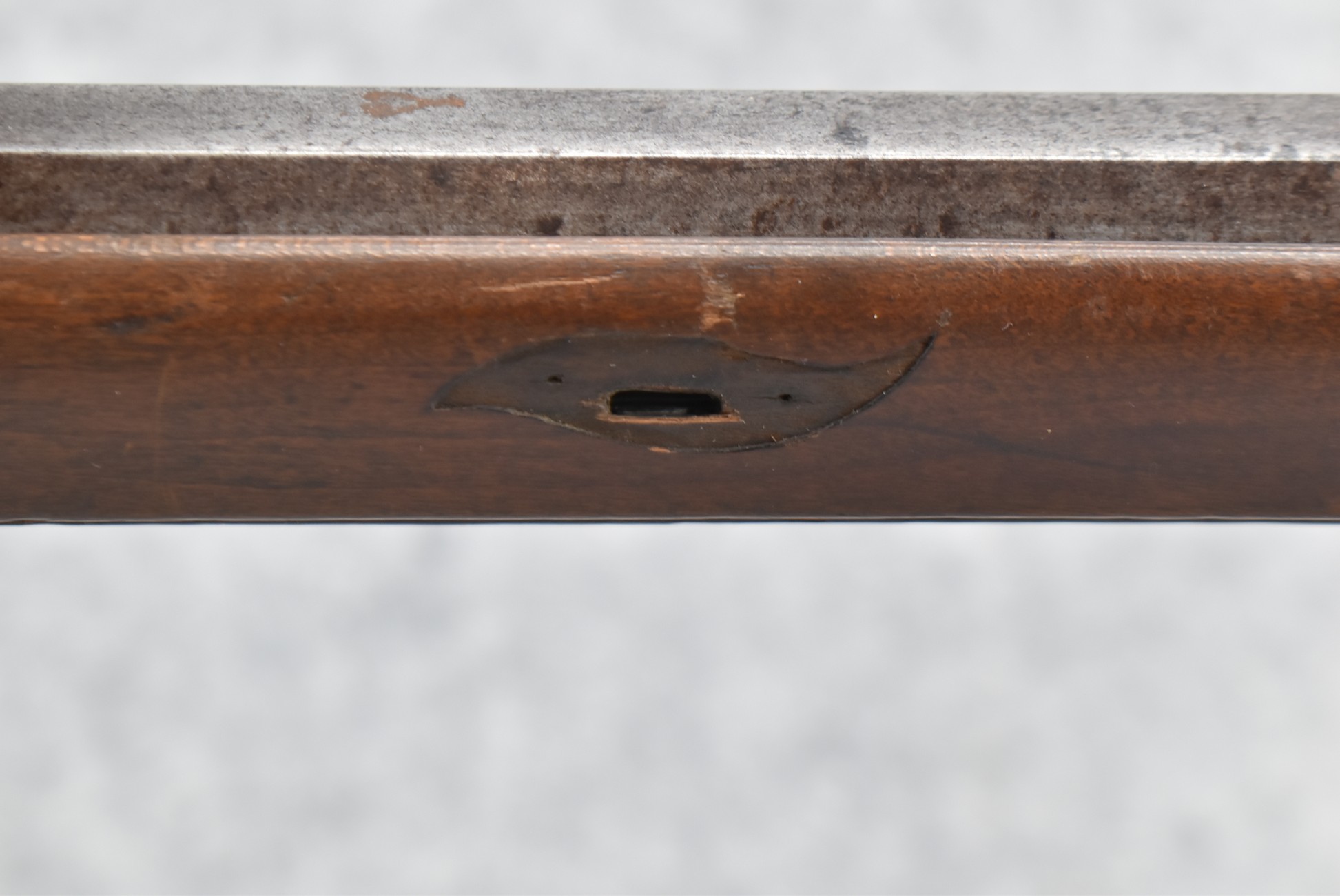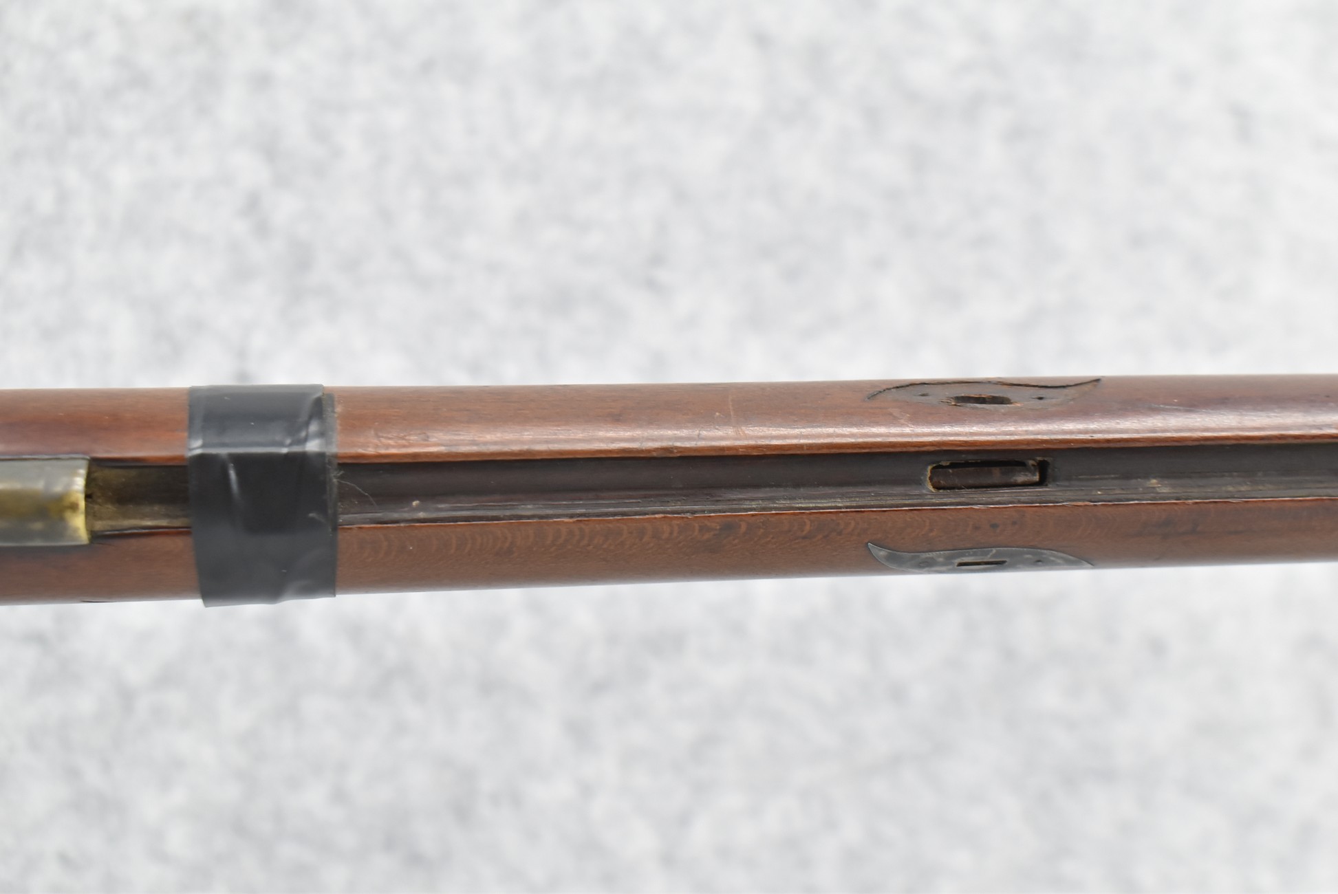 112. Signed John Armstrong of Emmitsburg, MD Barrel & Lock (in Need of Restoration) – Gun Has an Excellent Signed 45 Cal. 44” Barrel – w/Full Stock w/4pc. Patch Box – Stock Shows Cracks, Repairs & Things That Need Repaired – w/Strong Signed John Armstrong Percussion Lock – w/Push Button Release Patch Box Door – John Armstrong of Emmitsburg, Maryland Worked From 1790 to 1820 – Overall Length of 60” – Note the Unusual Checkering