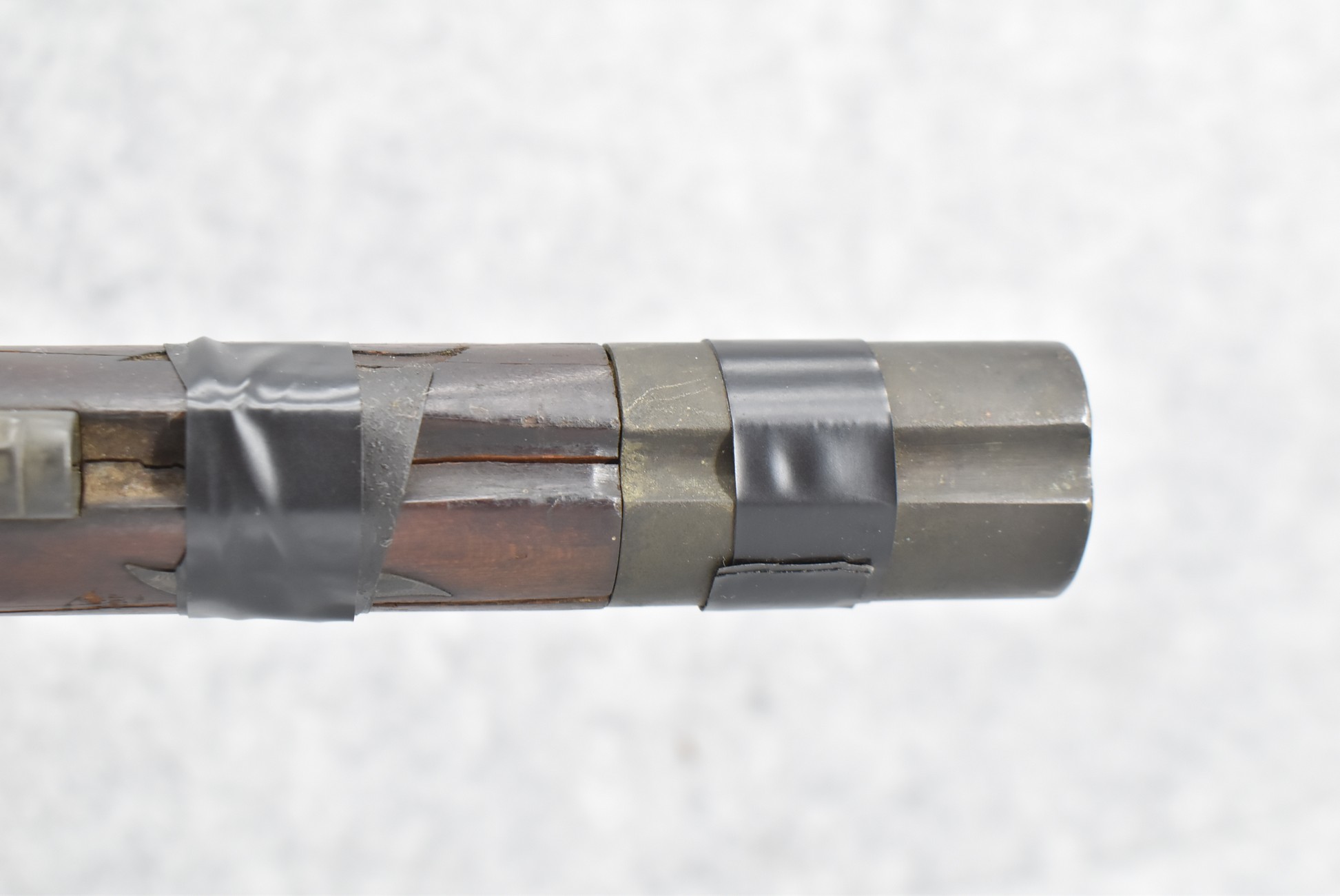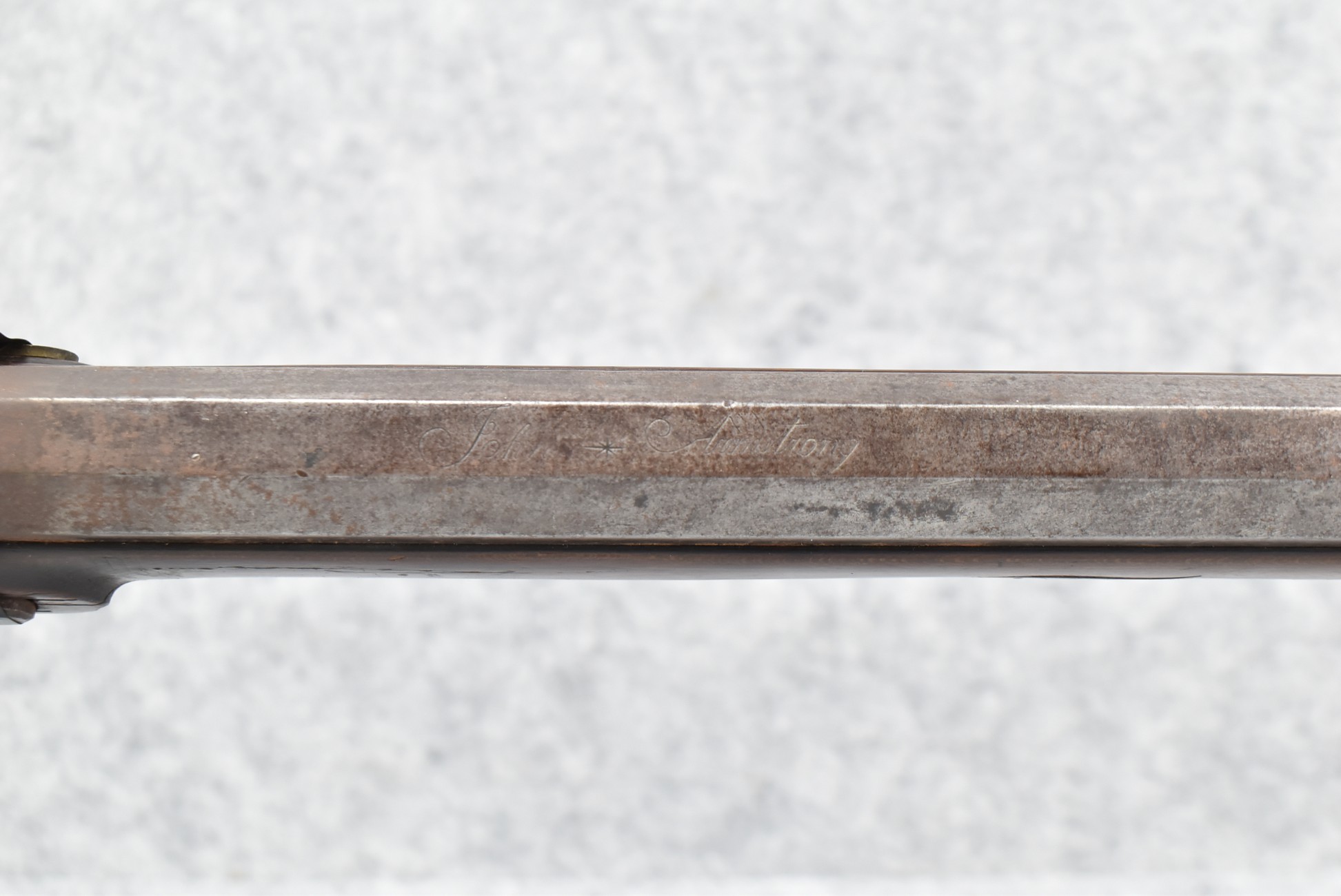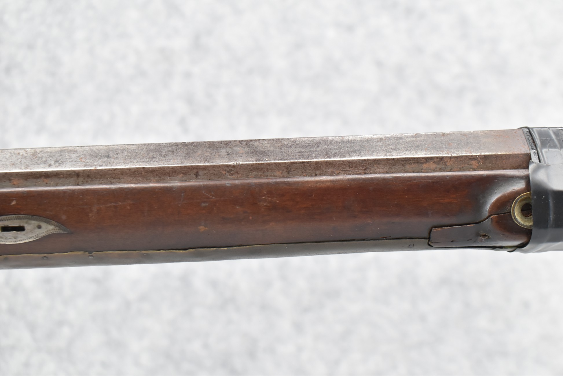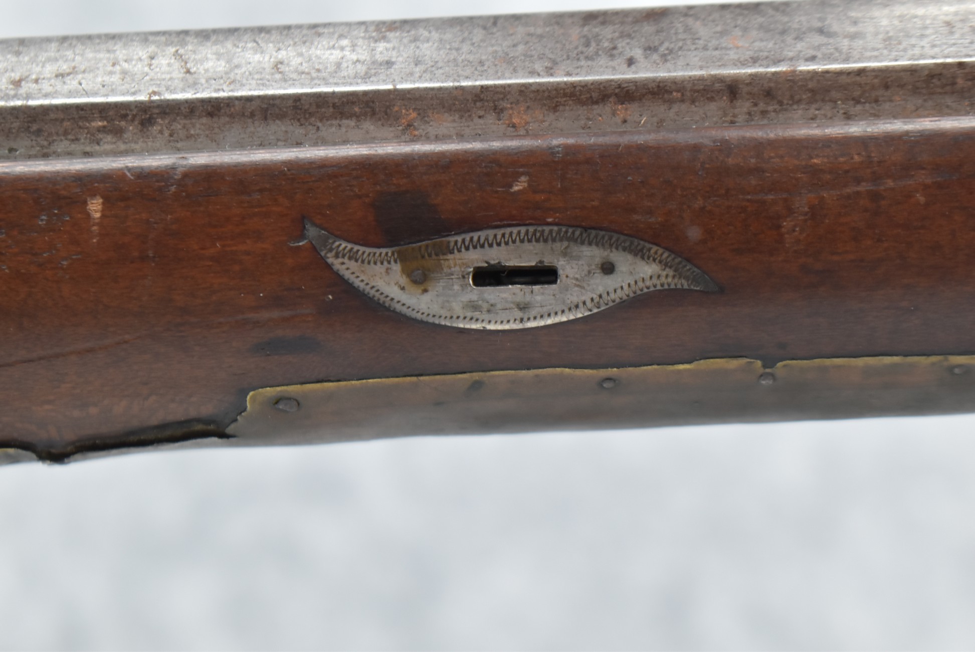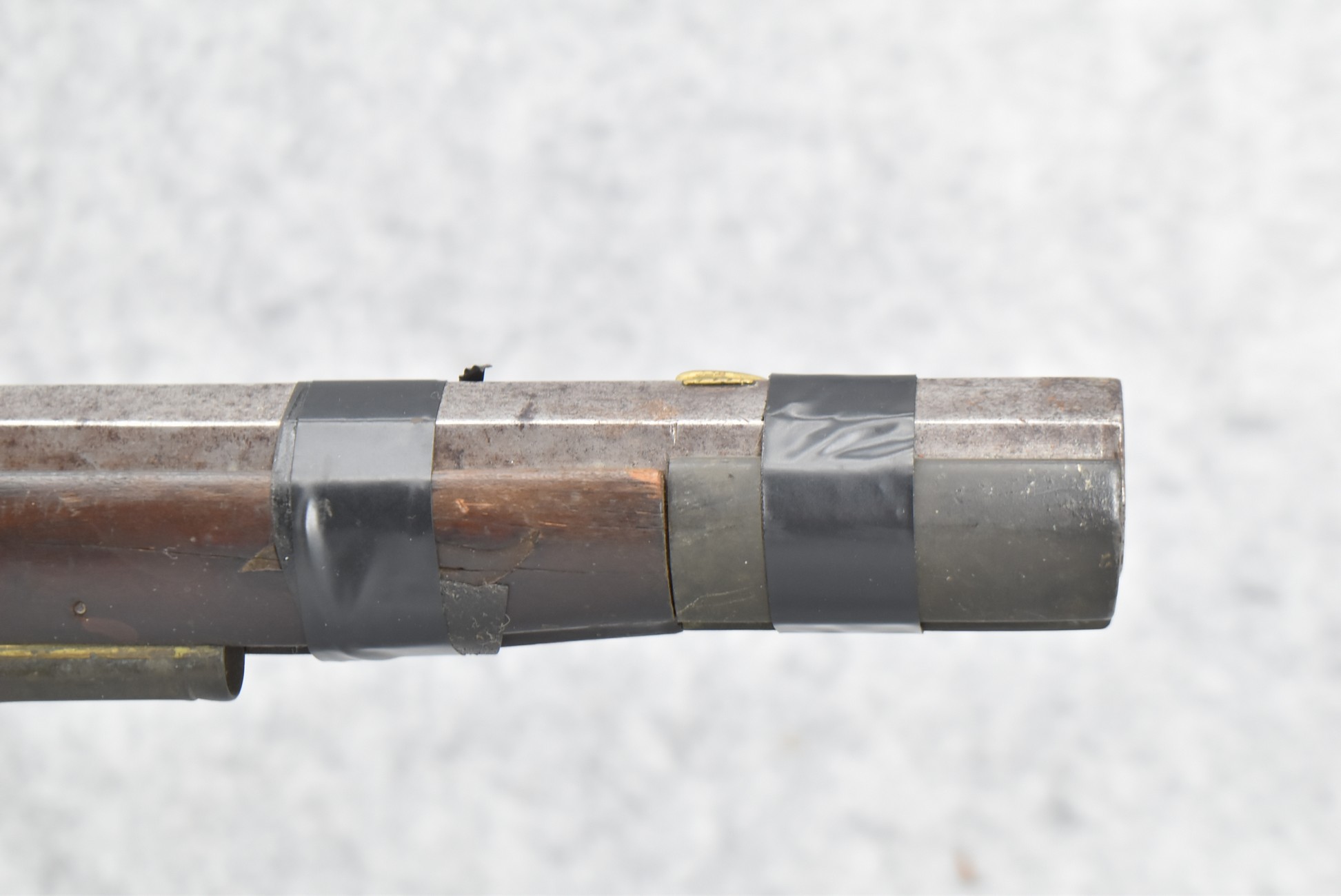 112. Signed John Armstrong of Emmitsburg, MD Barrel & Lock (in Need of Restoration) – Gun Has an Excellent Signed 45 Cal. 44” Barrel – w/Full Stock w/4pc. Patch Box – Stock Shows Cracks, Repairs & Things That Need Repaired – w/Strong Signed John Armstrong Percussion Lock – w/Push Button Release Patch Box Door – John Armstrong of Emmitsburg, Maryland Worked From 1790 to 1820 – Overall Length of 60” – Note the Unusual Checkering