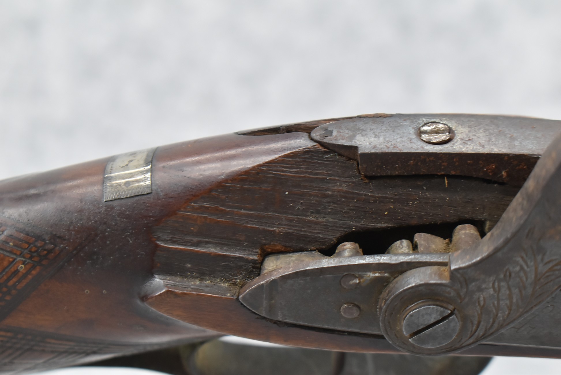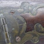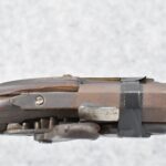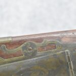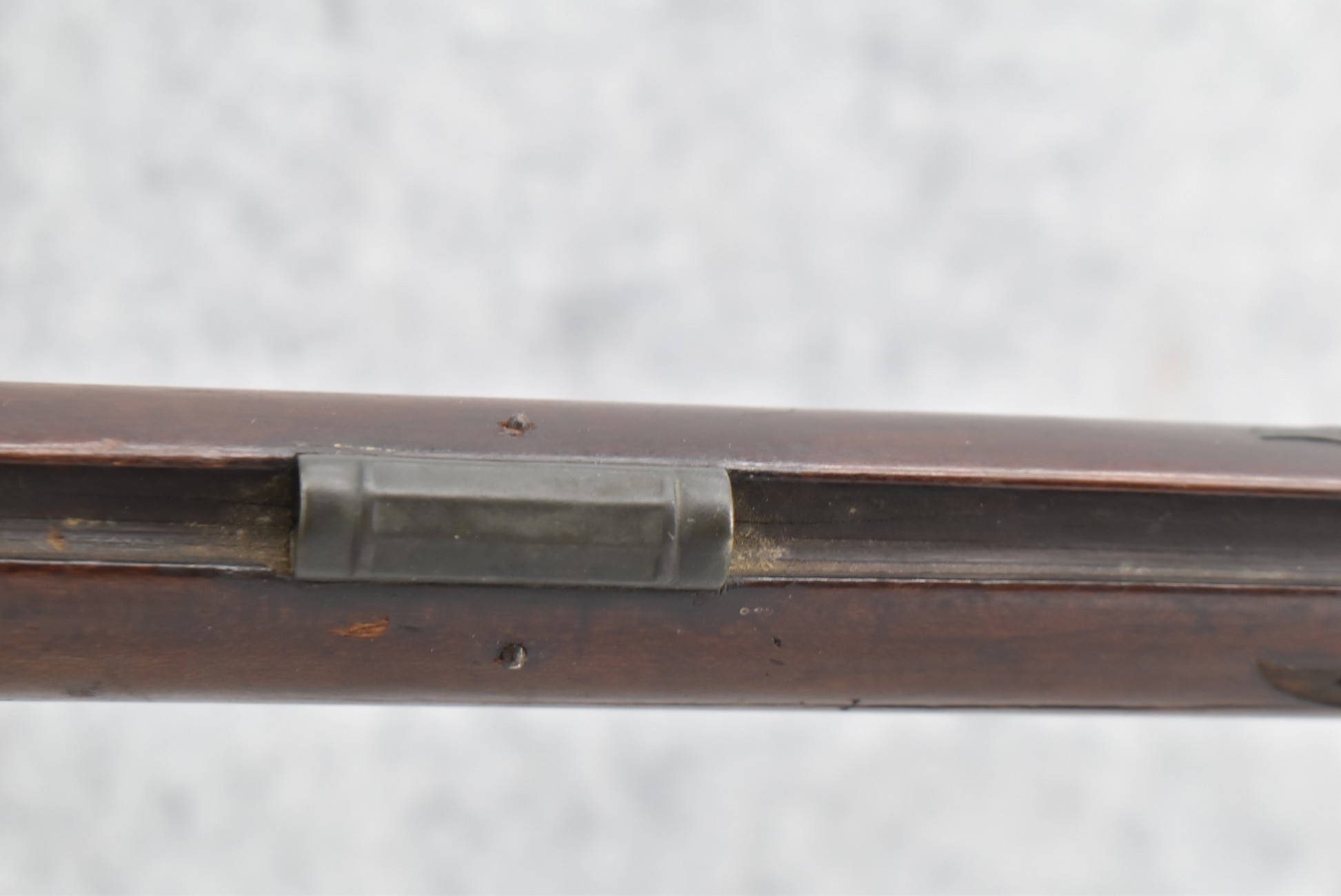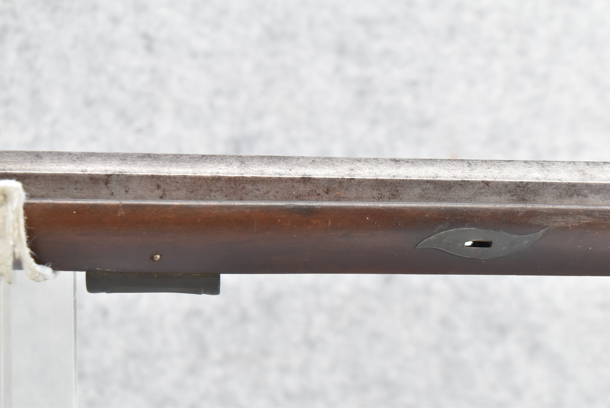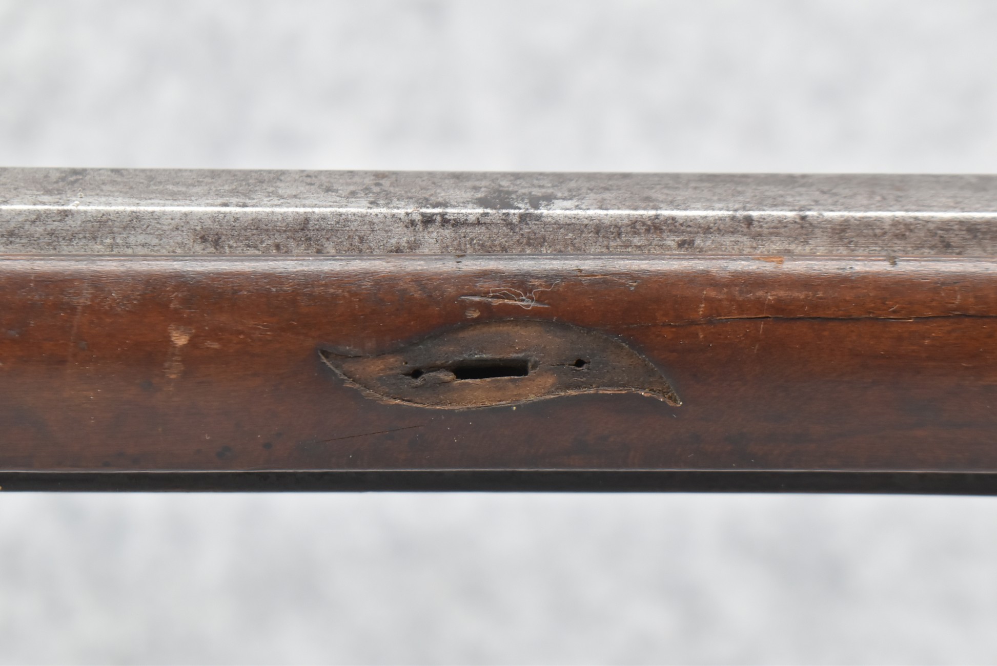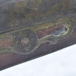 112. Signed John Armstrong of Emmitsburg, MD Barrel & Lock (in Need of Restoration) – Gun Has an Excellent Signed 45 Cal. 44” Barrel – w/Full Stock w/4pc. Patch Box – Stock Shows Cracks, Repairs & Things That Need Repaired – w/Strong Signed John Armstrong Percussion Lock – w/Push Button Release Patch Box Door – John Armstrong of Emmitsburg, Maryland Worked From 1790 to 1820 – Overall Length of 60” – Note the Unusual Checkering