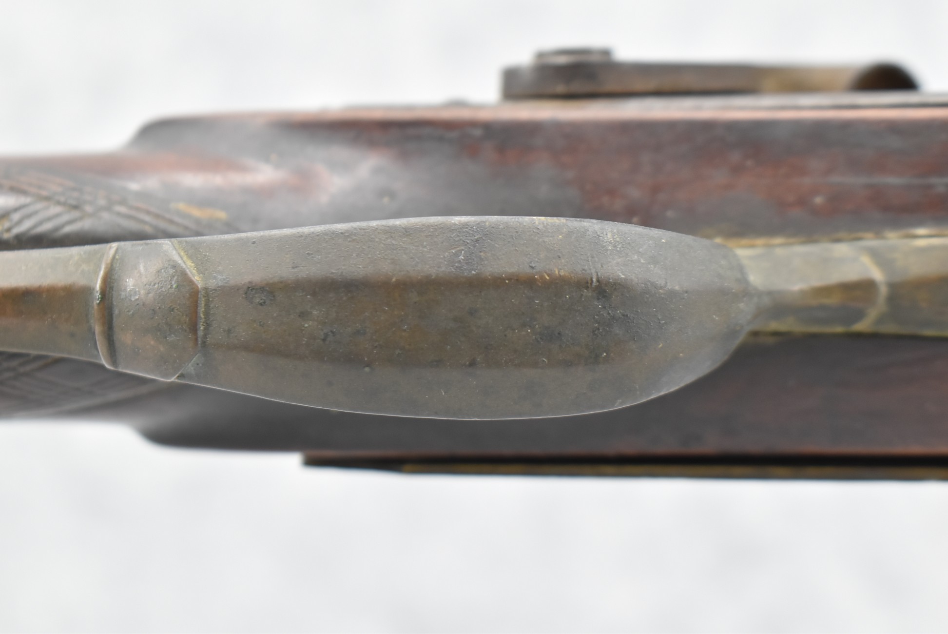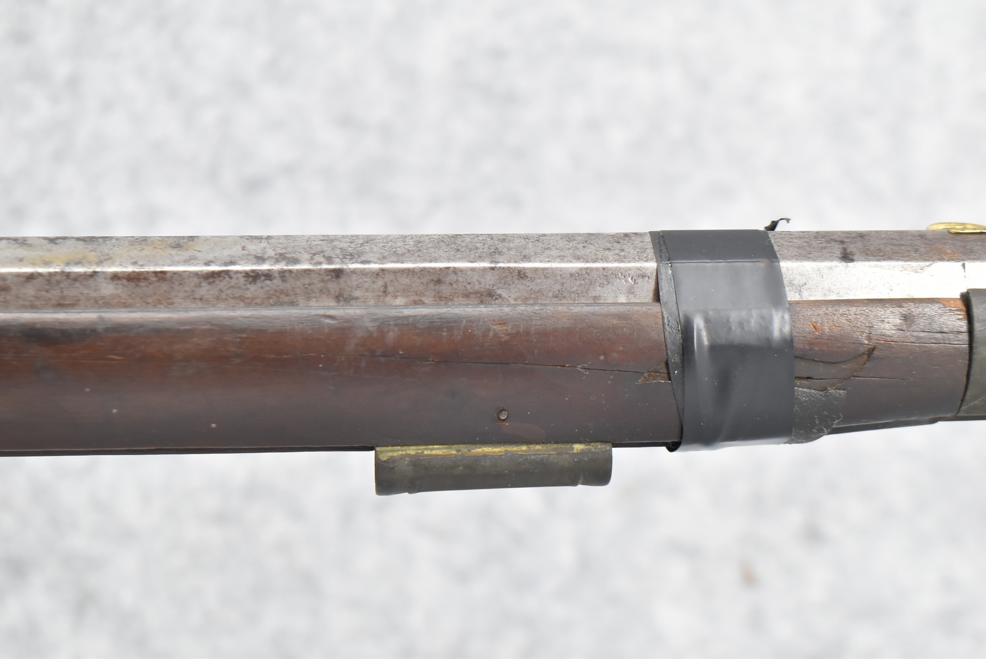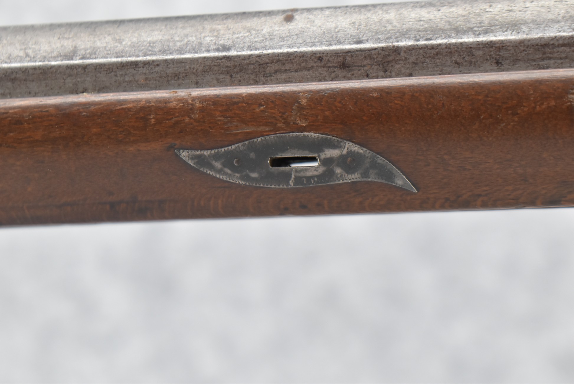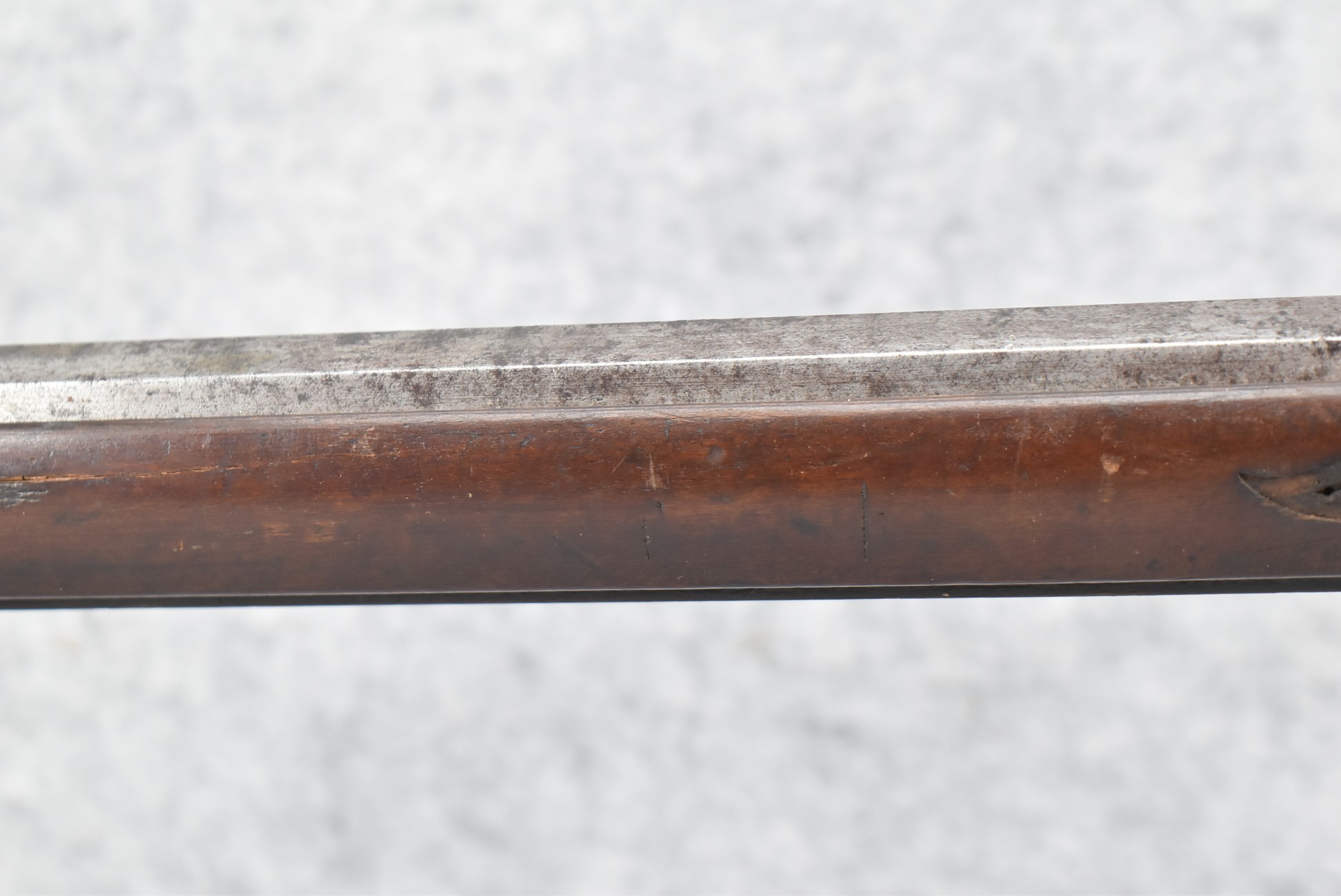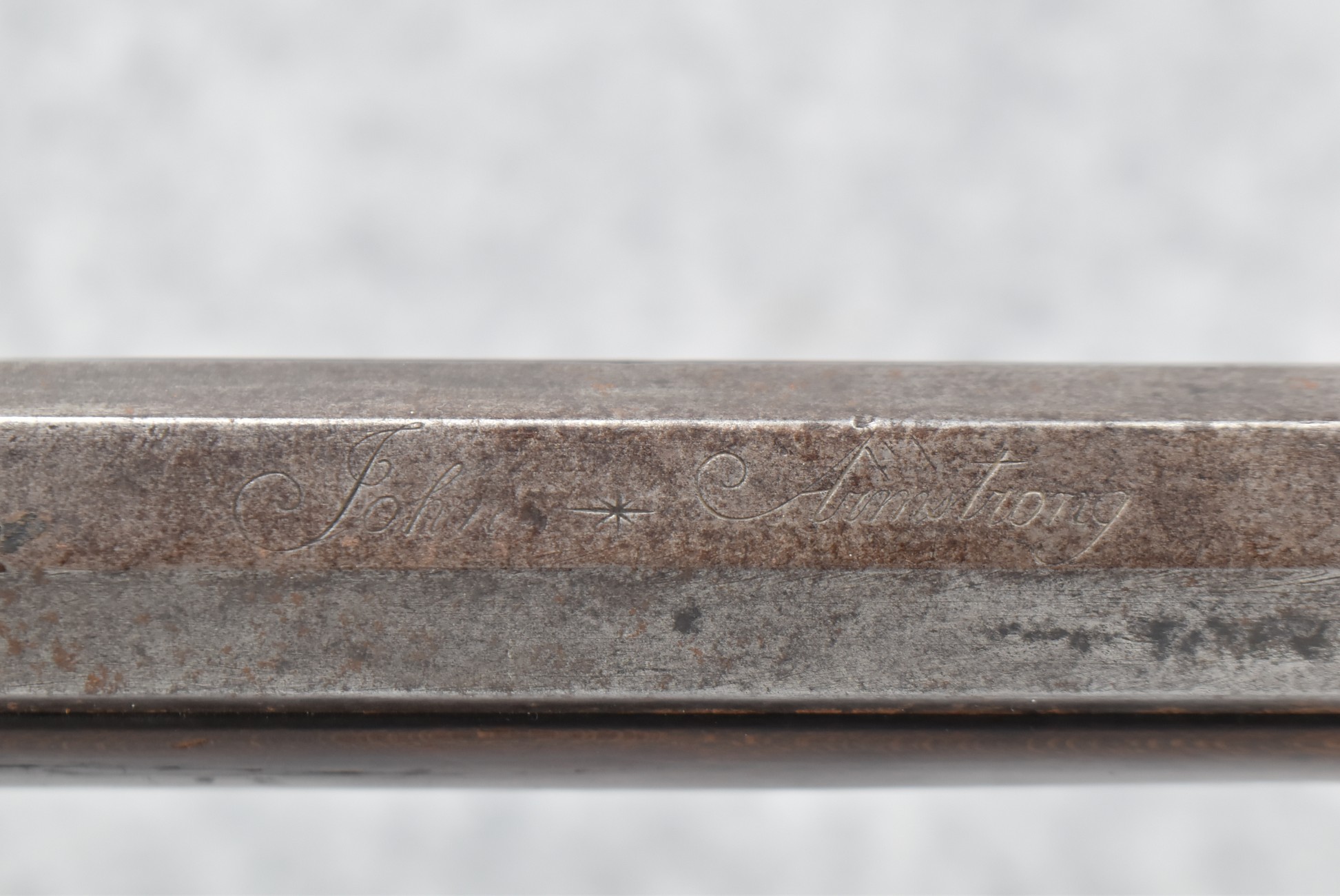 112. Signed John Armstrong of Emmitsburg, MD Barrel & Lock (in Need of Restoration) – Gun Has an Excellent Signed 45 Cal. 44” Barrel – w/Full Stock w/4pc. Patch Box – Stock Shows Cracks, Repairs & Things That Need Repaired – w/Strong Signed John Armstrong Percussion Lock – w/Push Button Release Patch Box Door – John Armstrong of Emmitsburg, Maryland Worked From 1790 to 1820 – Overall Length of 60” – Note the Unusual Checkering