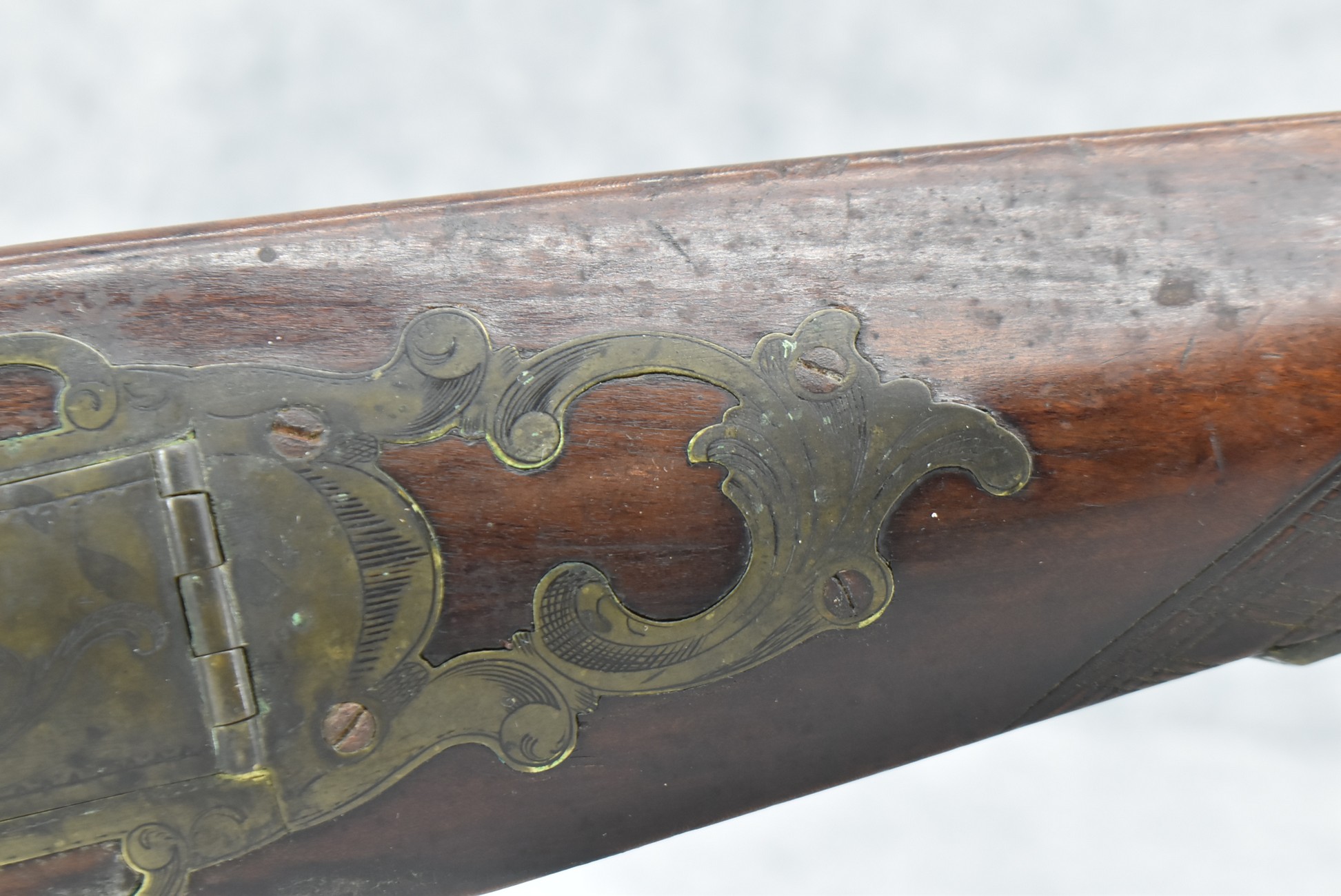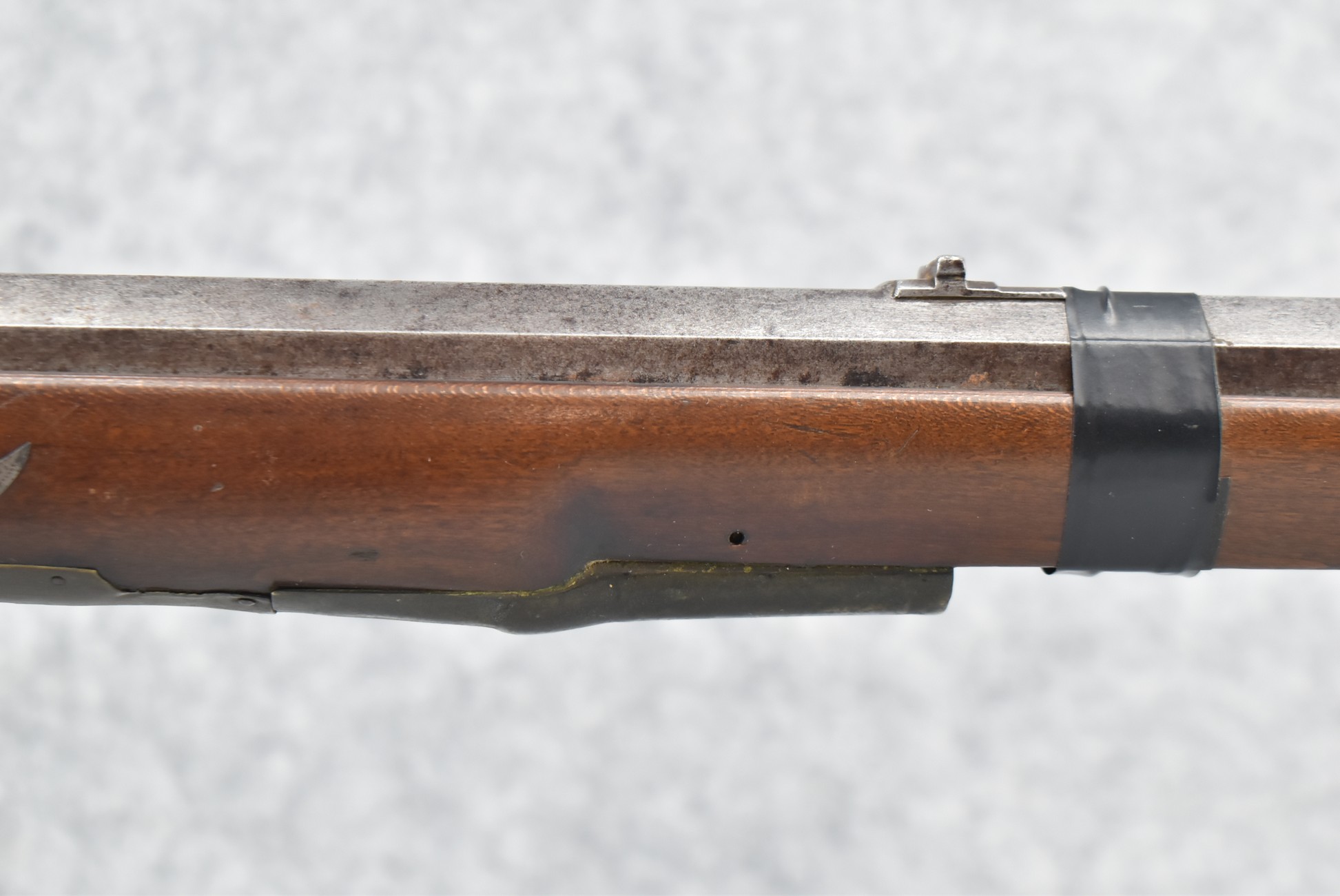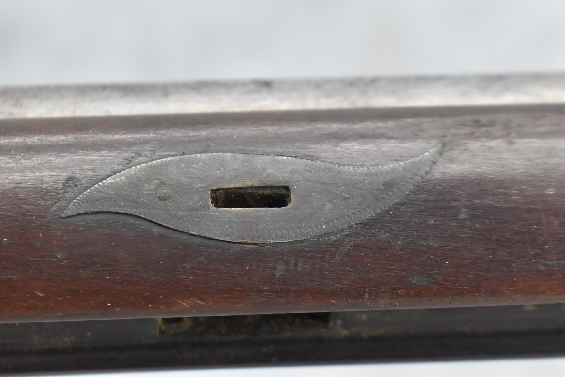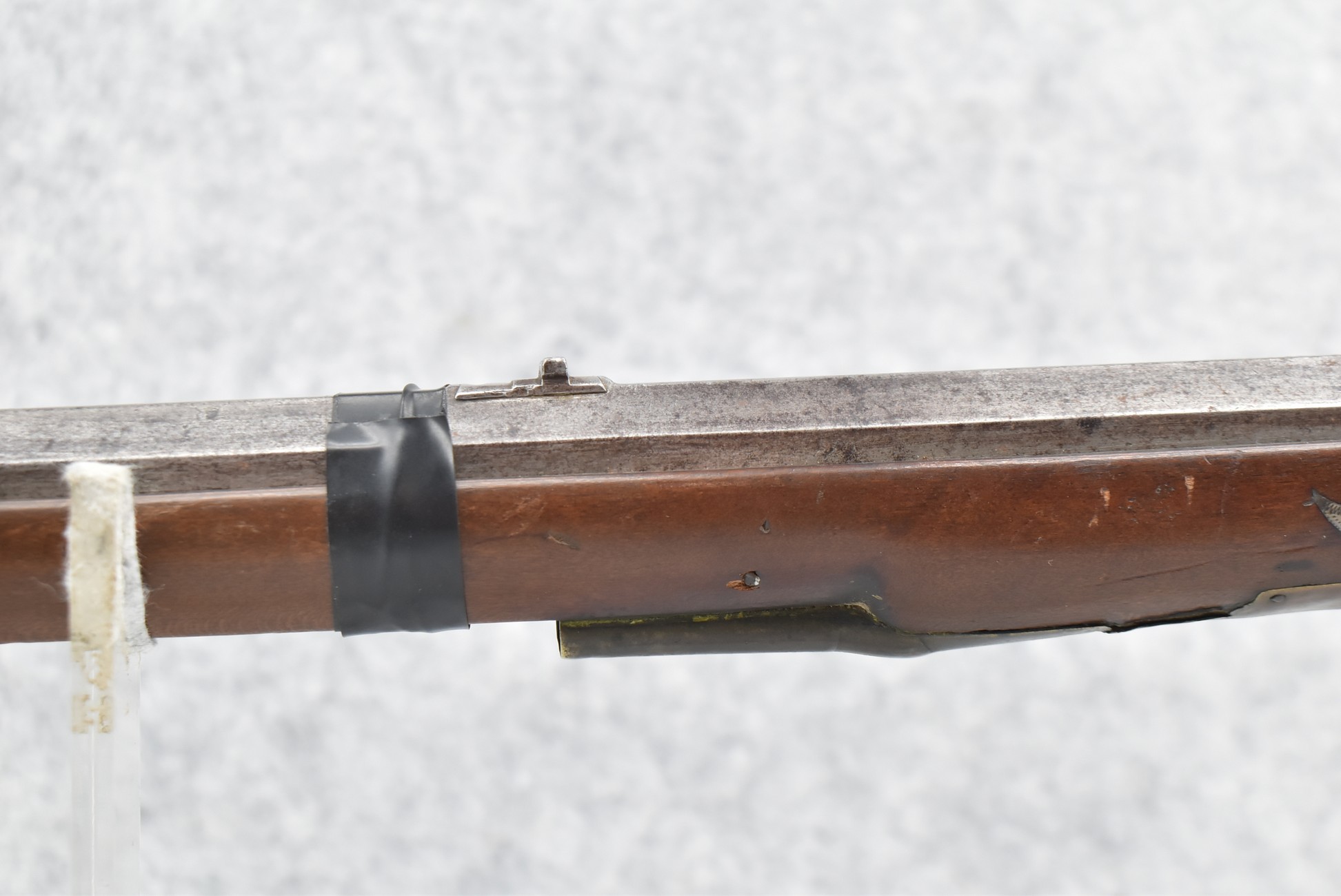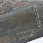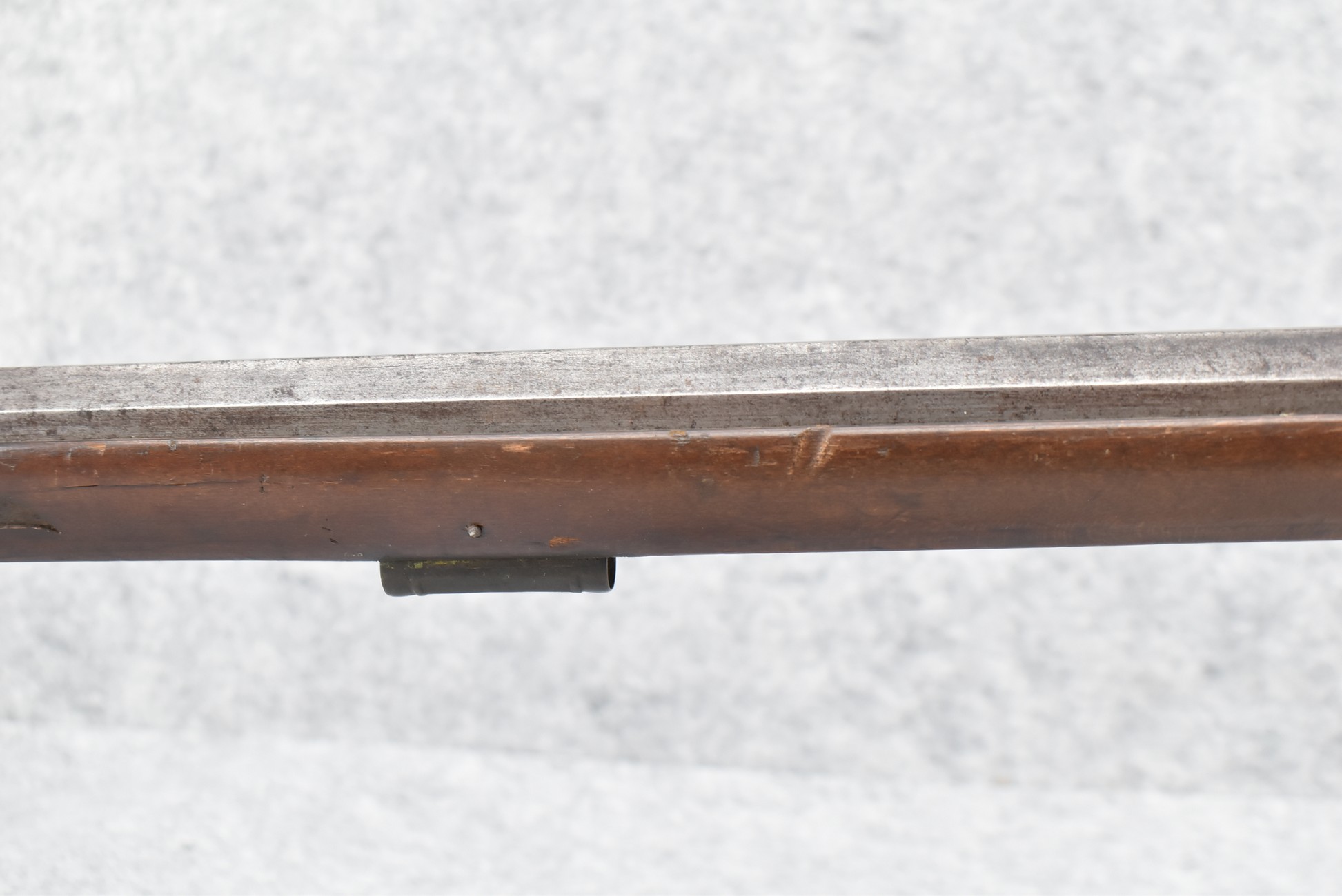 112. Signed John Armstrong of Emmitsburg, MD Barrel & Lock (in Need of Restoration) – Gun Has an Excellent Signed 45 Cal. 44” Barrel – w/Full Stock w/4pc. Patch Box – Stock Shows Cracks, Repairs & Things That Need Repaired – w/Strong Signed John Armstrong Percussion Lock – w/Push Button Release Patch Box Door – John Armstrong of Emmitsburg, Maryland Worked From 1790 to 1820 – Overall Length of 60” – Note the Unusual Checkering