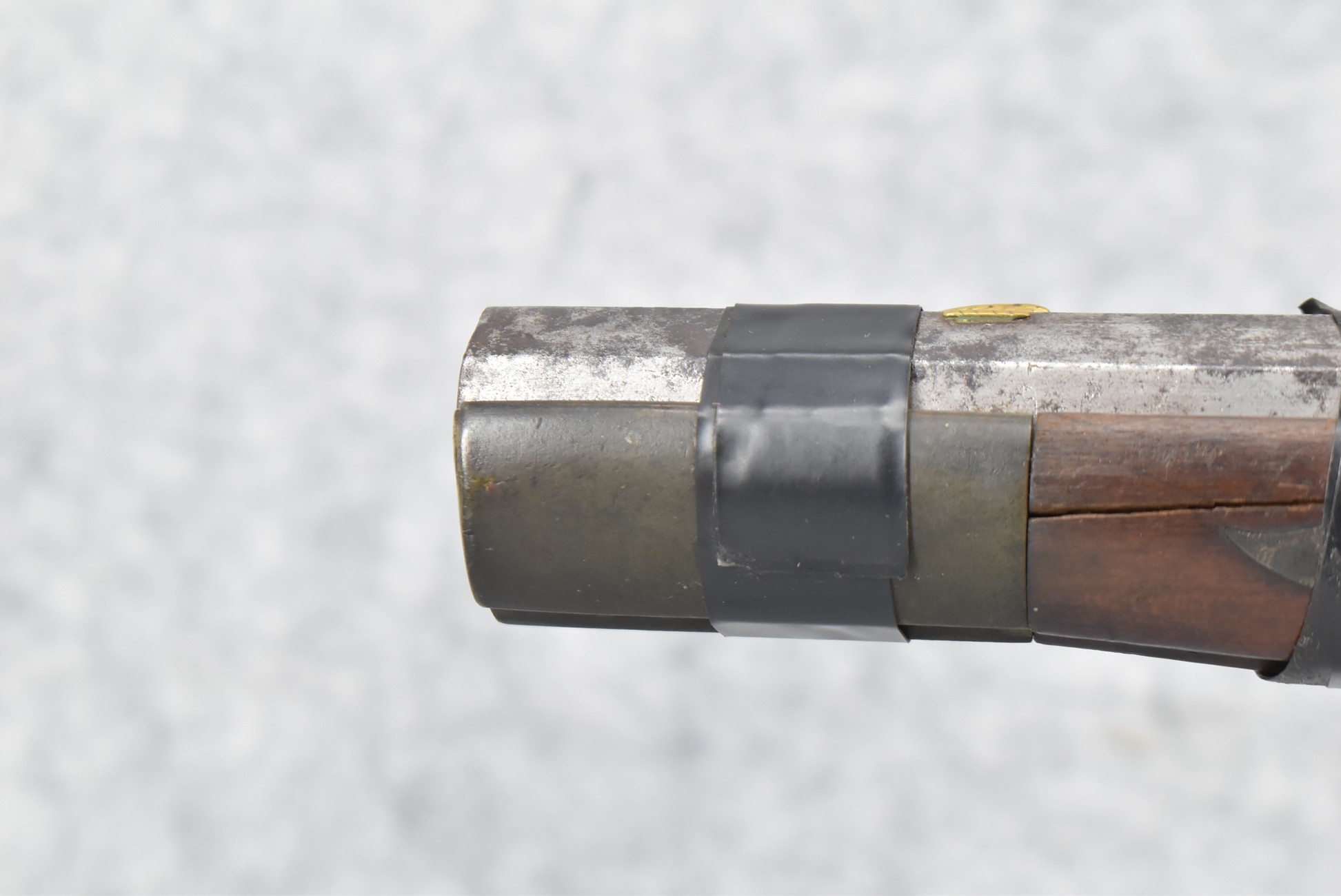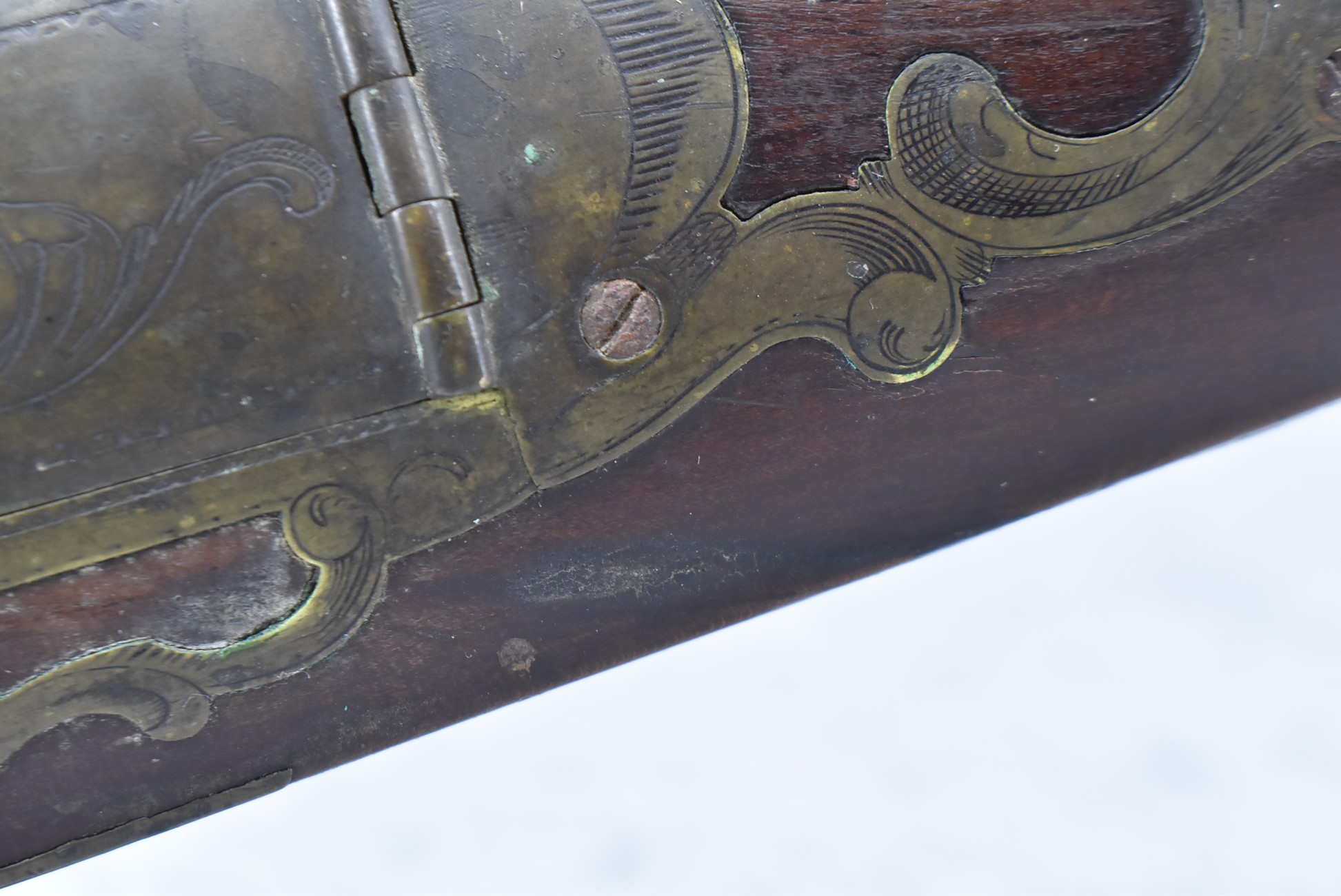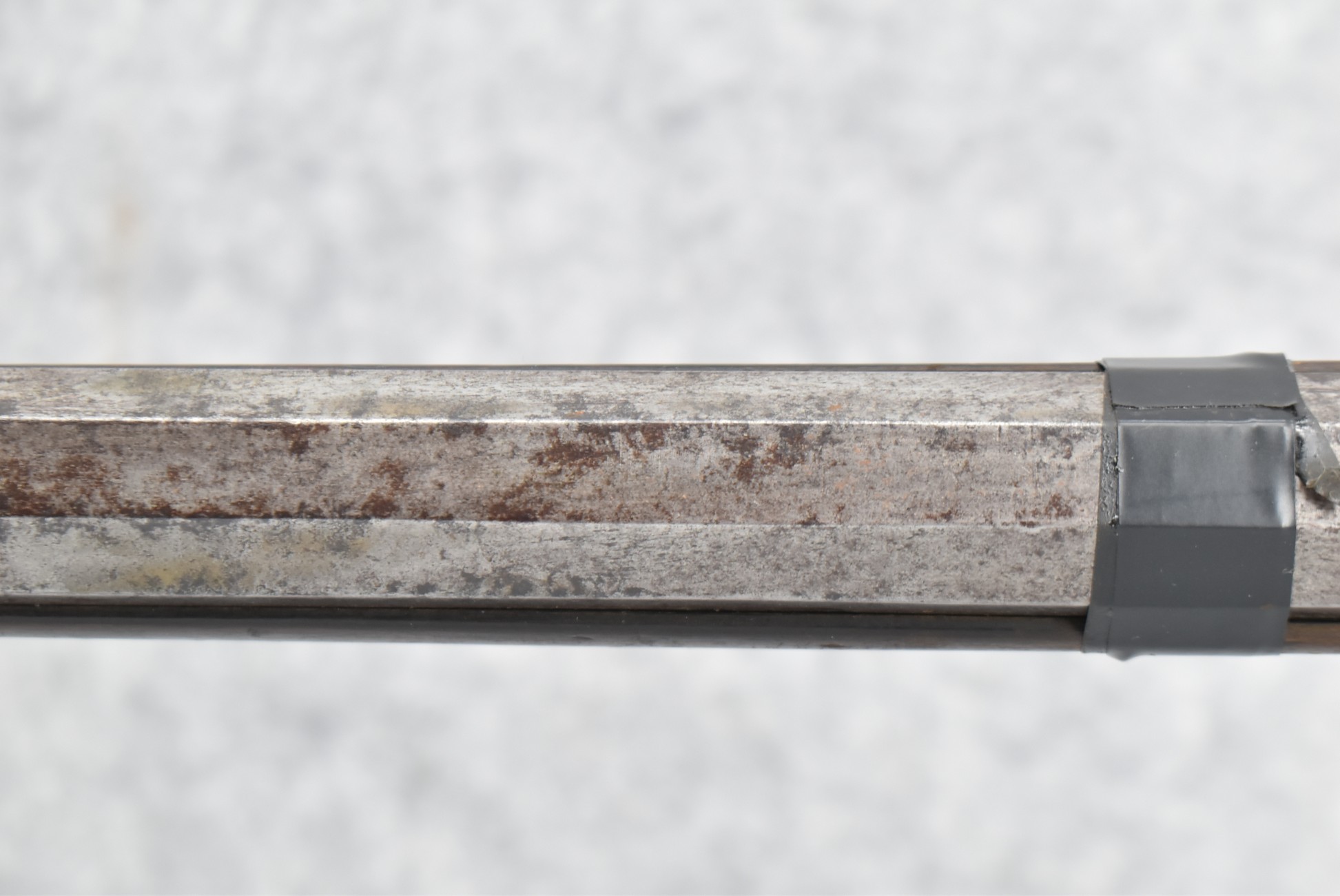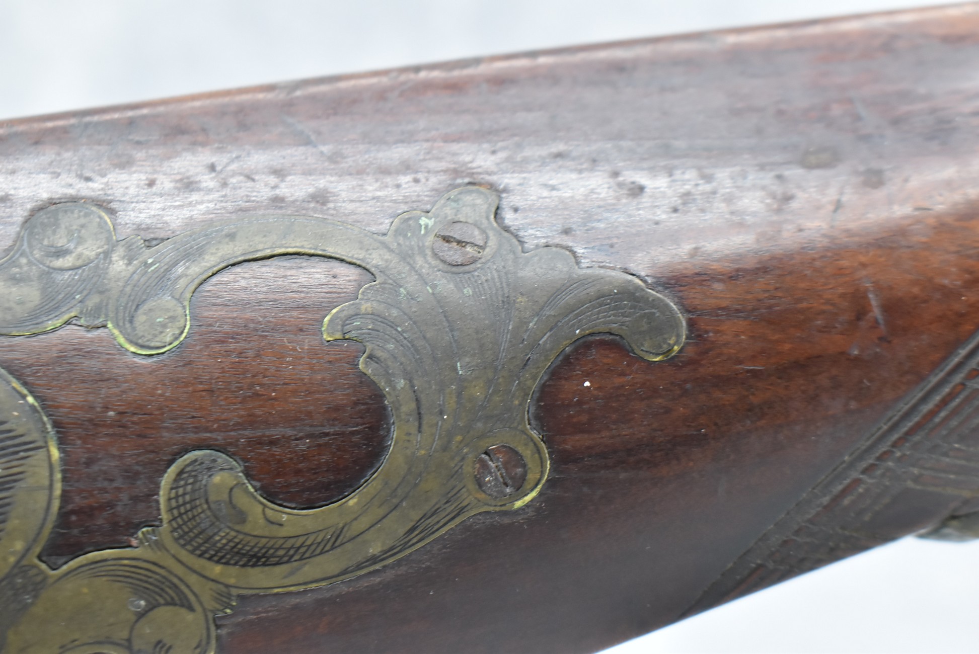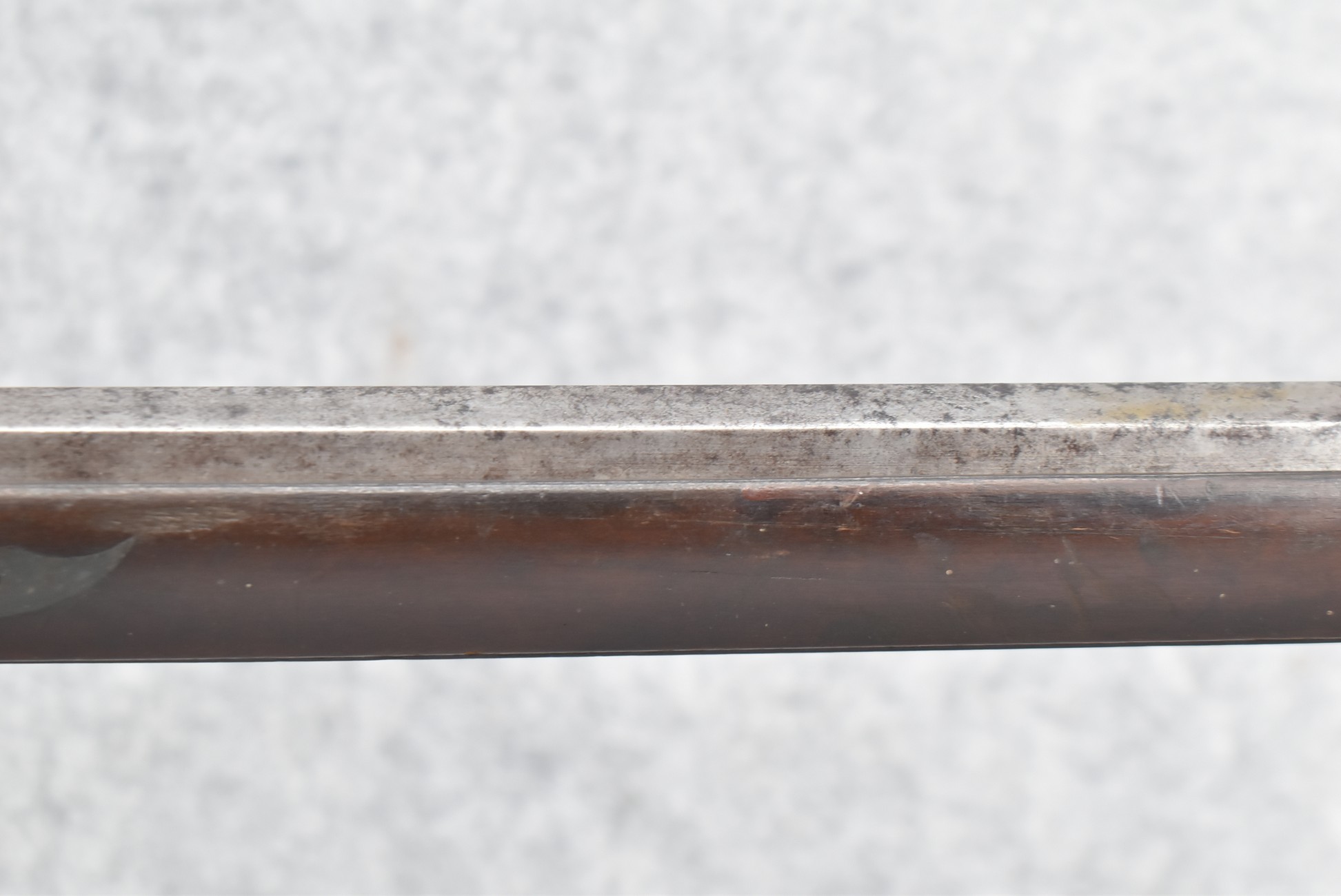 112. Signed John Armstrong of Emmitsburg, MD Barrel & Lock (in Need of Restoration) – Gun Has an Excellent Signed 45 Cal. 44” Barrel – w/Full Stock w/4pc. Patch Box – Stock Shows Cracks, Repairs & Things That Need Repaired – w/Strong Signed John Armstrong Percussion Lock – w/Push Button Release Patch Box Door – John Armstrong of Emmitsburg, Maryland Worked From 1790 to 1820 – Overall Length of 60” – Note the Unusual Checkering