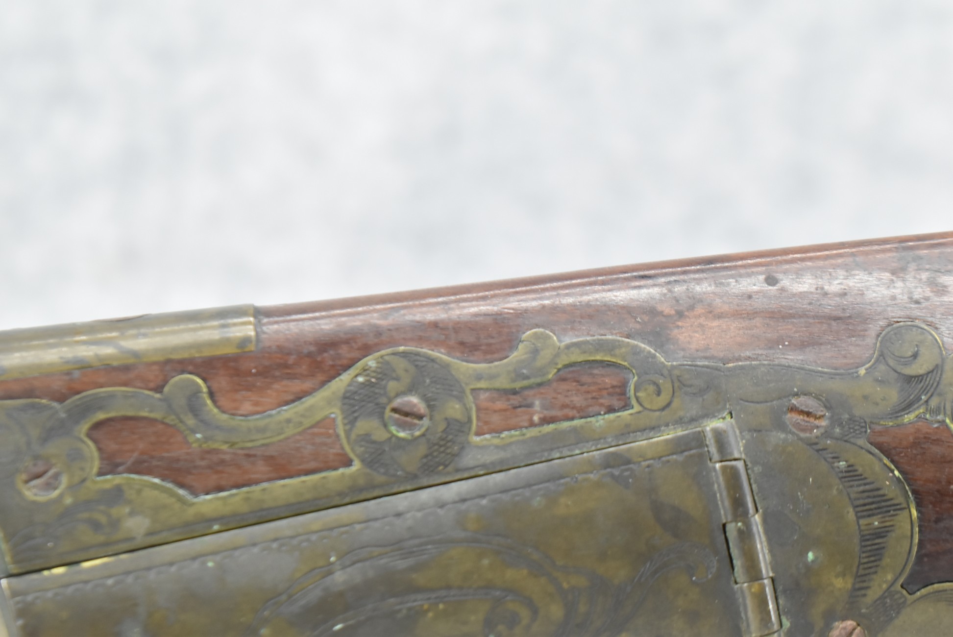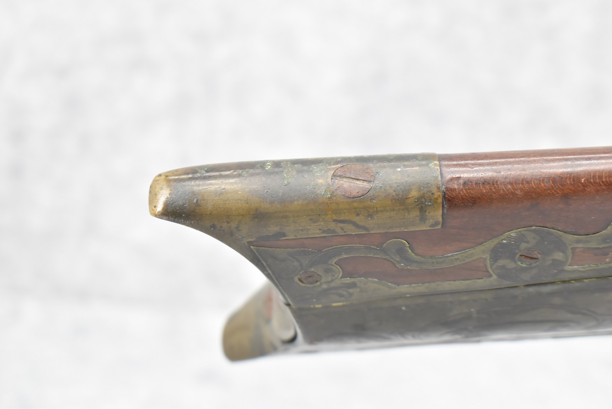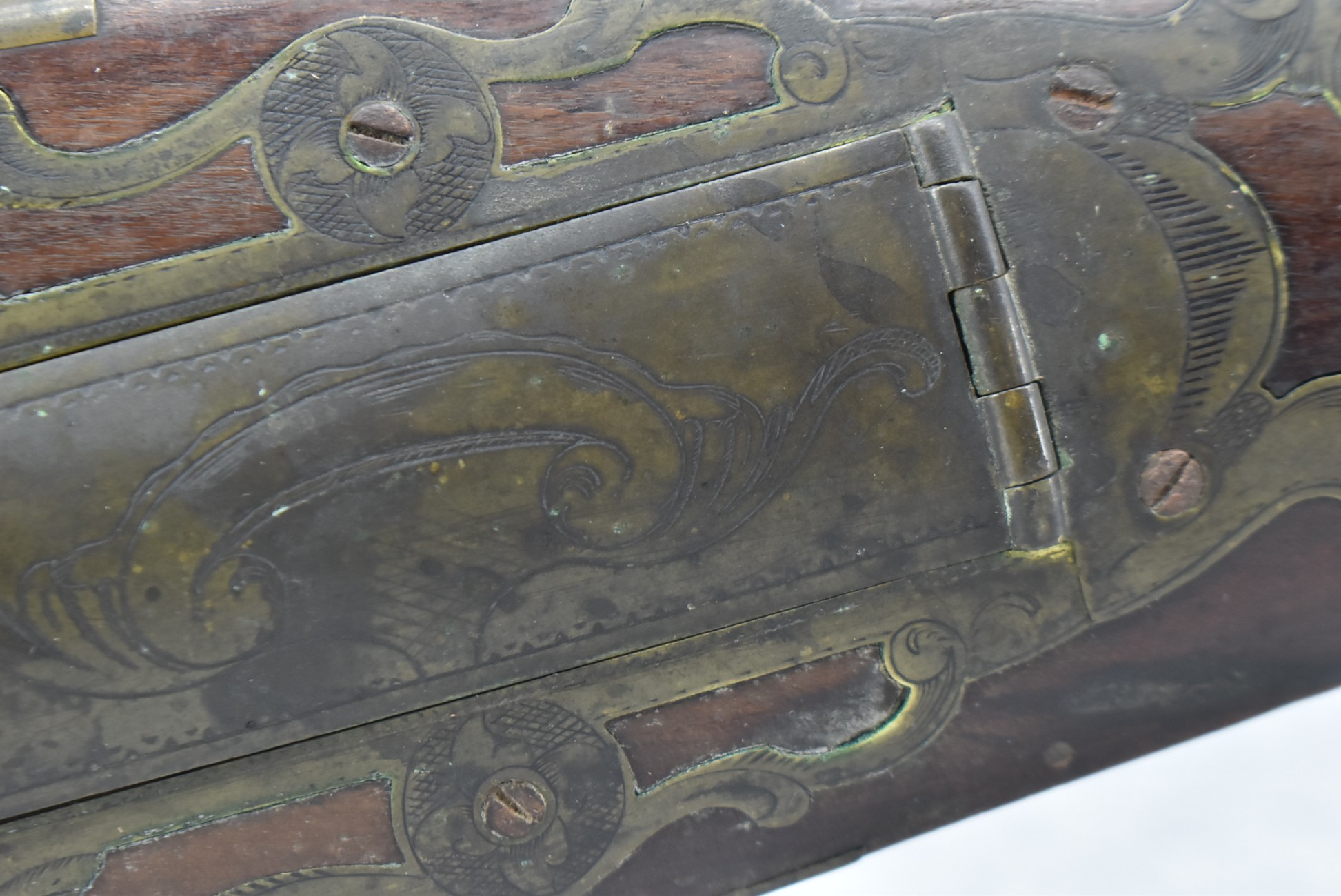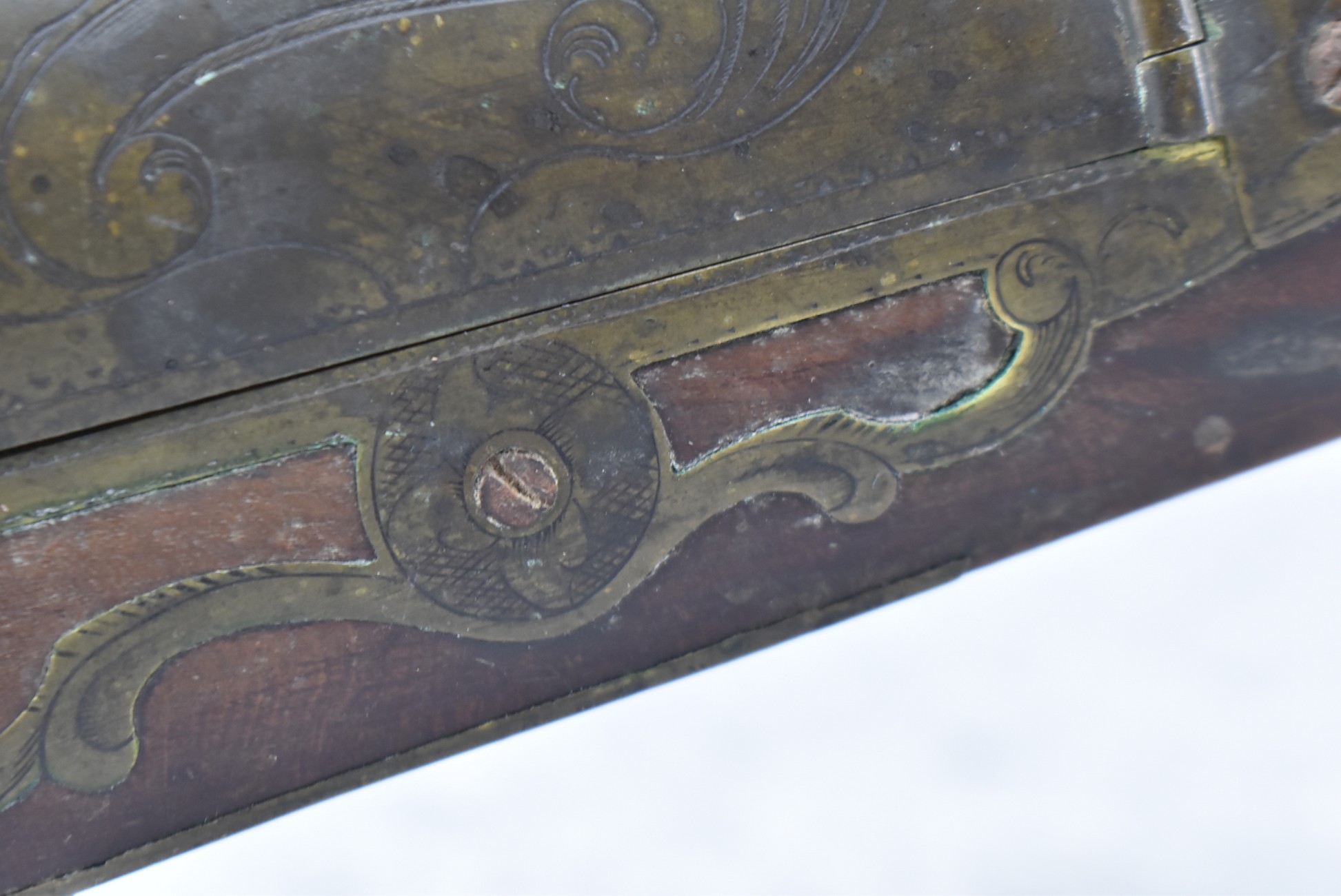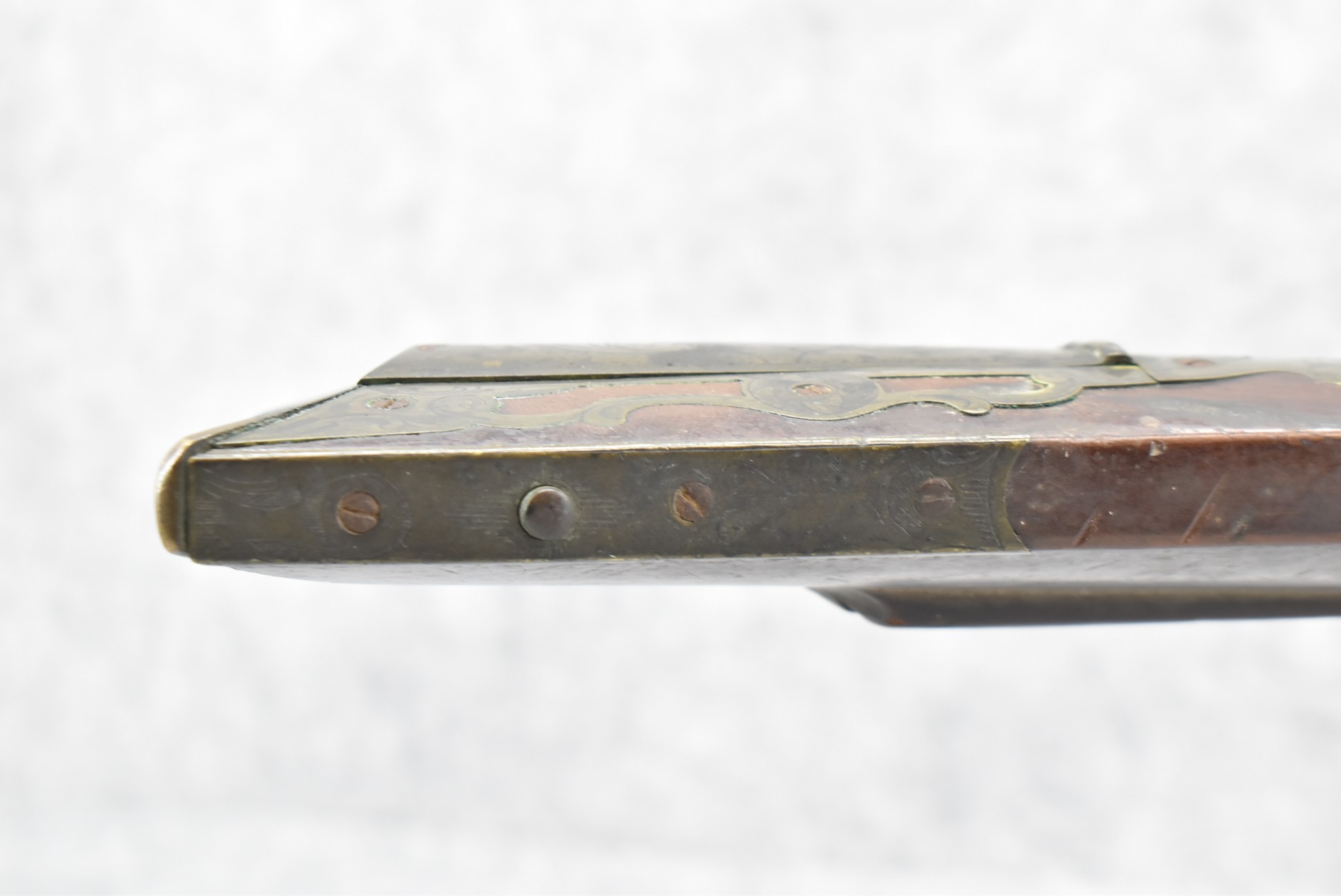 112. Signed John Armstrong of Emmitsburg, MD Barrel & Lock (in Need of Restoration) – Gun Has an Excellent Signed 45 Cal. 44” Barrel – w/Full Stock w/4pc. Patch Box – Stock Shows Cracks, Repairs & Things That Need Repaired – w/Strong Signed John Armstrong Percussion Lock – w/Push Button Release Patch Box Door – John Armstrong of Emmitsburg, Maryland Worked From 1790 to 1820 – Overall Length of 60” – Note the Unusual Checkering