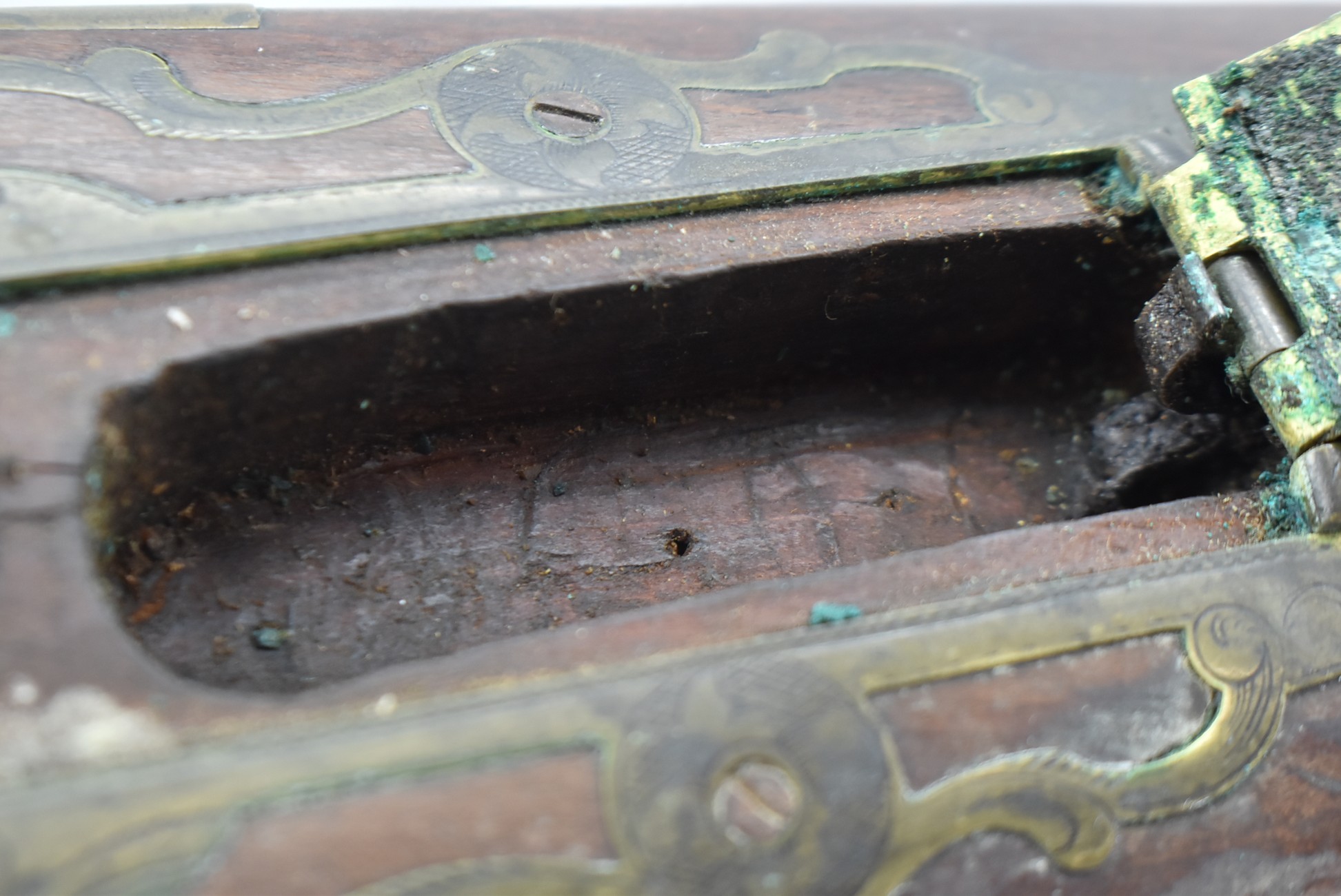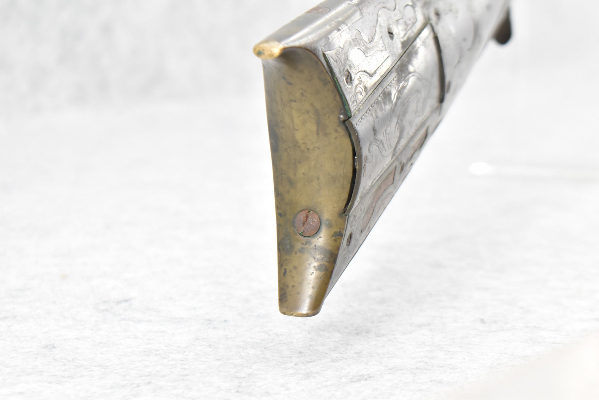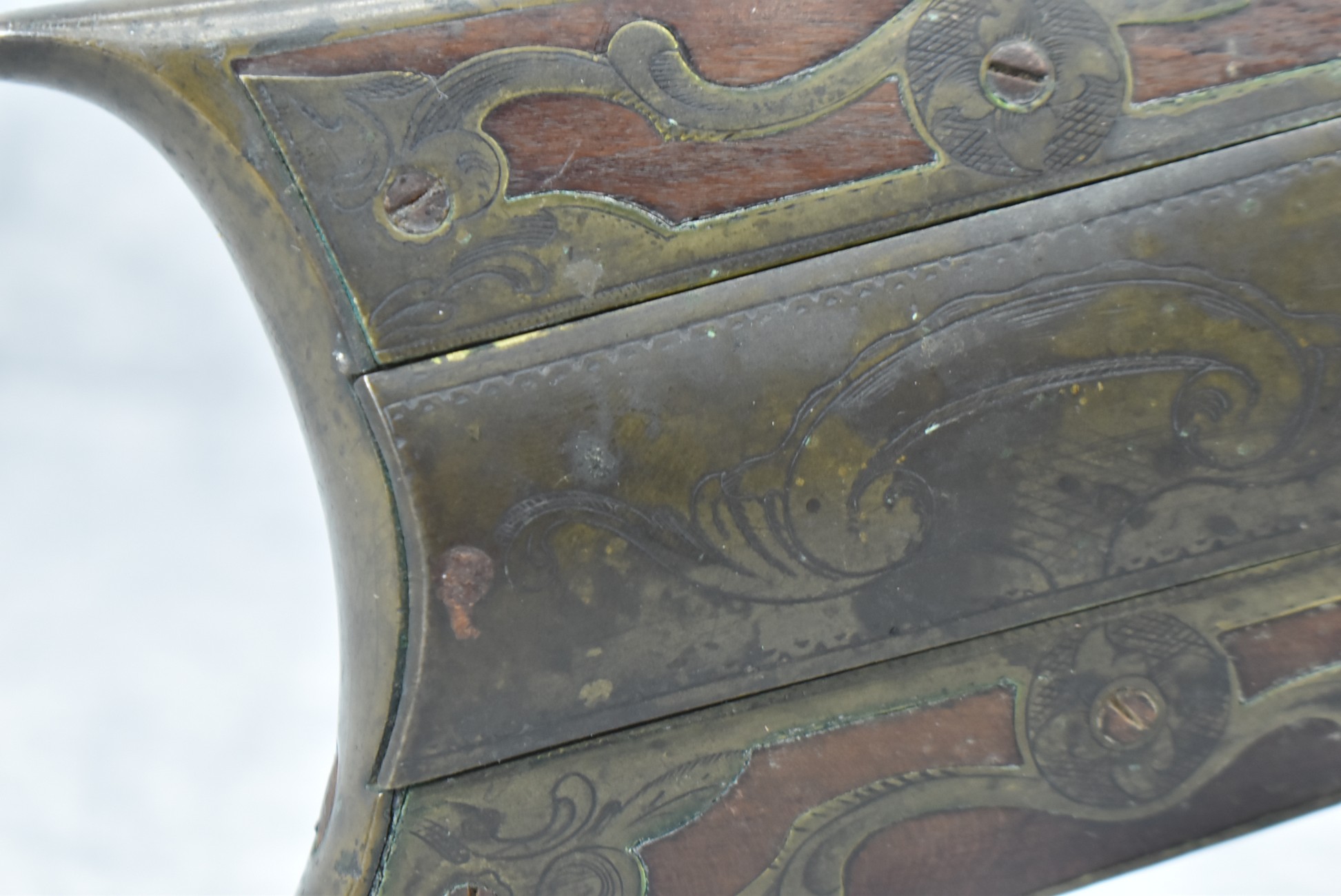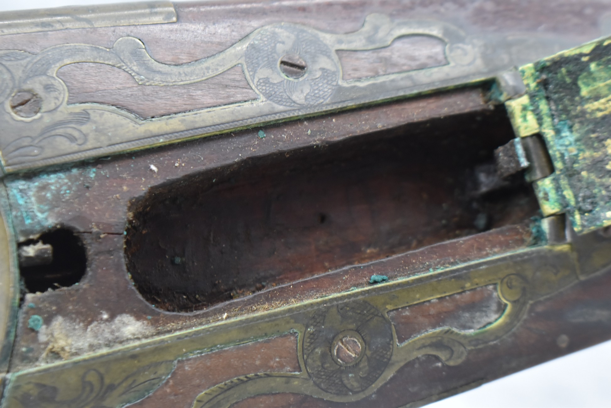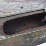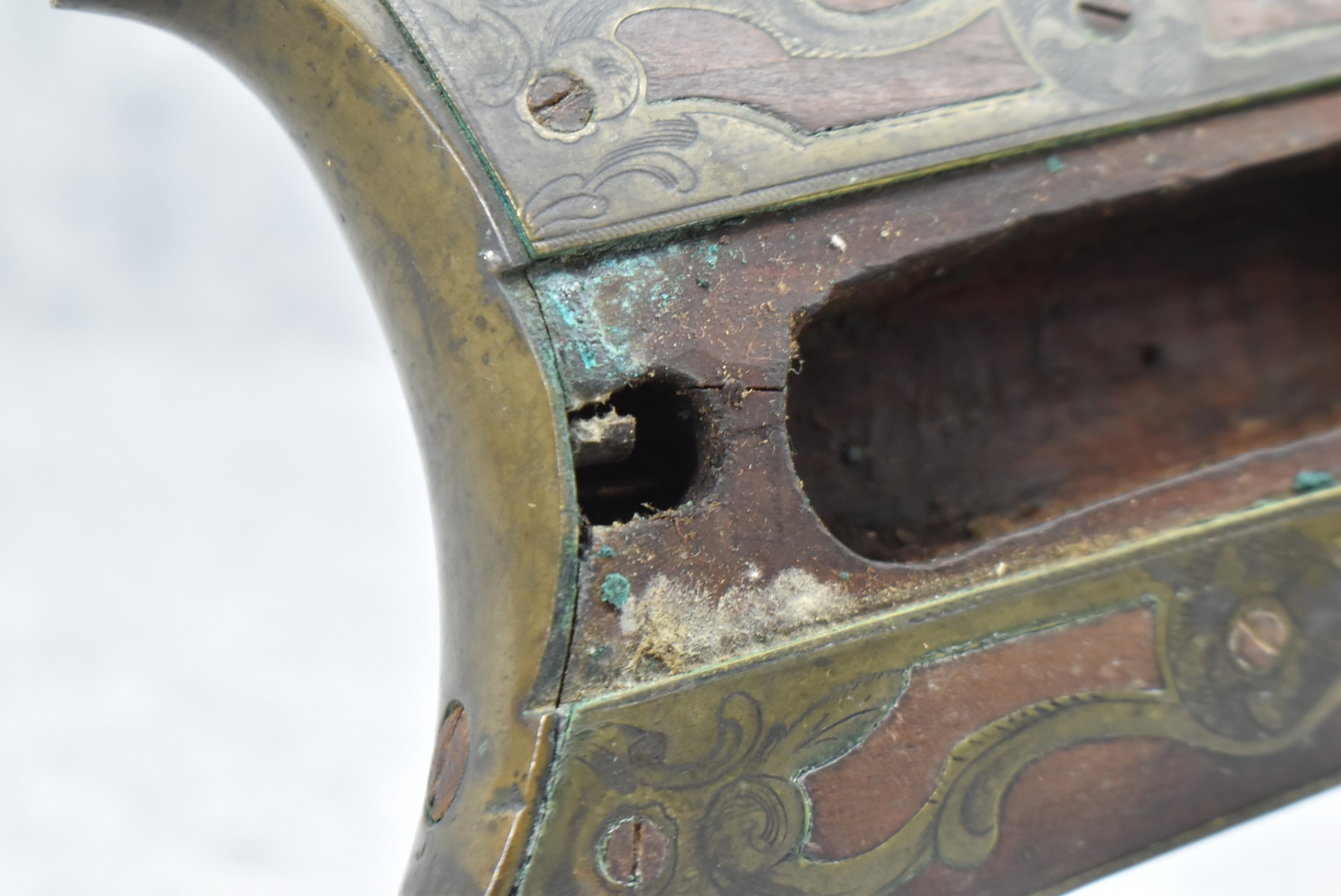 112. Signed John Armstrong of Emmitsburg, MD Barrel & Lock (in Need of Restoration) – Gun Has an Excellent Signed 45 Cal. 44” Barrel – w/Full Stock w/4pc. Patch Box – Stock Shows Cracks, Repairs & Things That Need Repaired – w/Strong Signed John Armstrong Percussion Lock – w/Push Button Release Patch Box Door – John Armstrong of Emmitsburg, Maryland Worked From 1790 to 1820 – Overall Length of 60” – Note the Unusual Checkering
