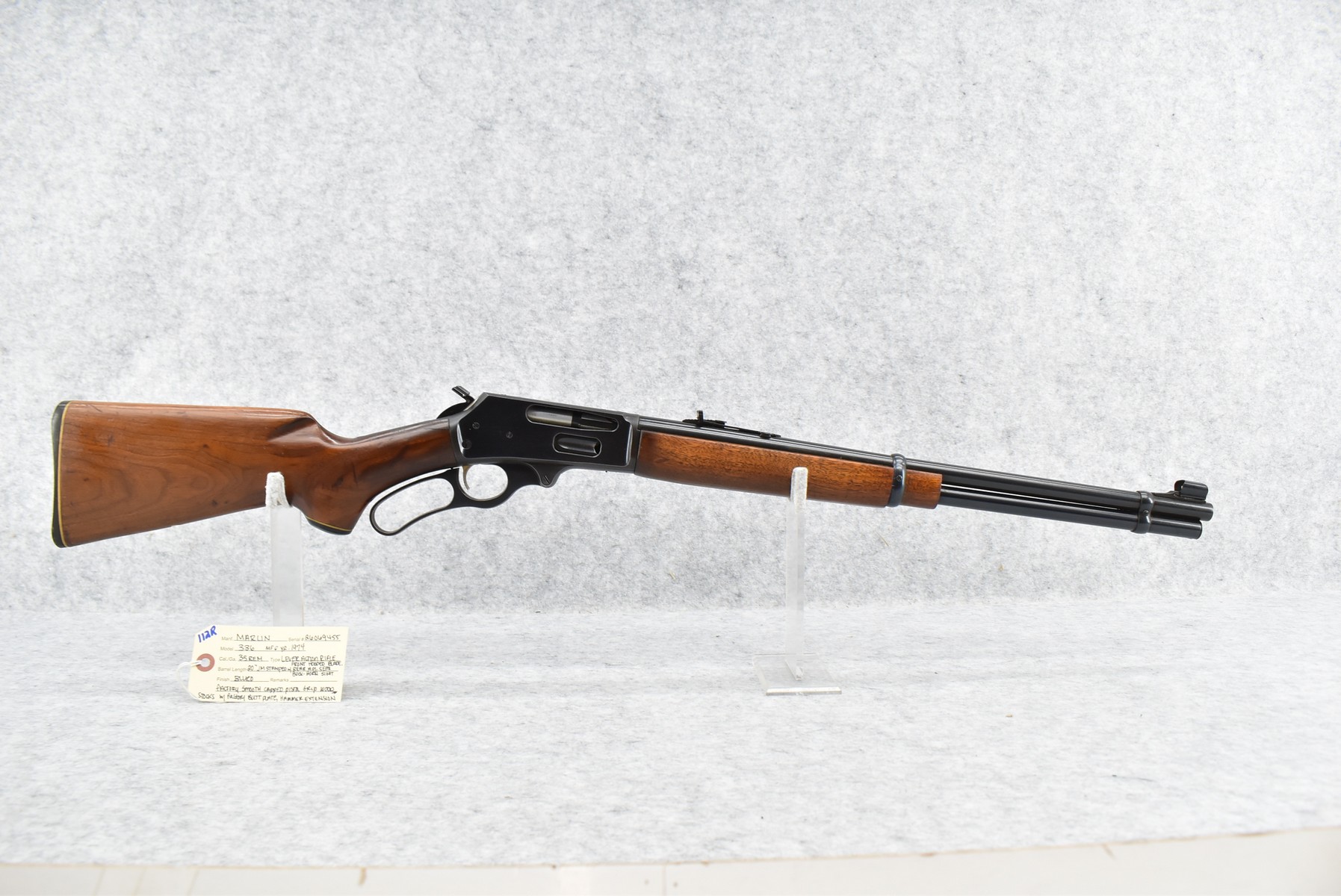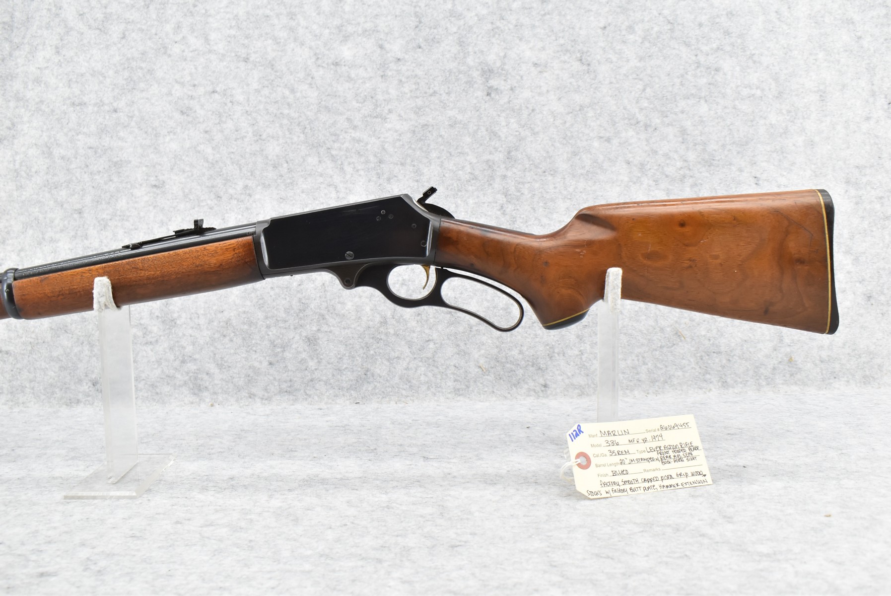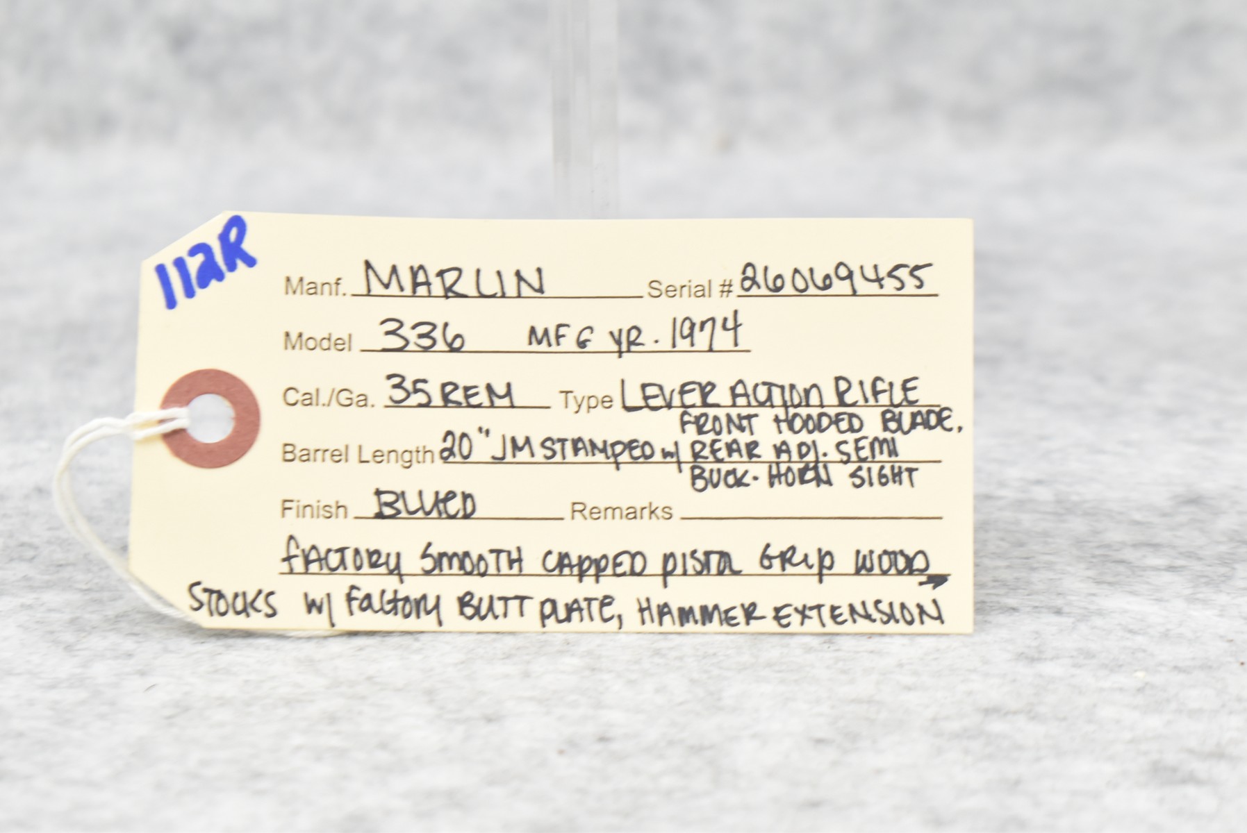 112R. Marlin – Mod. 336 – 35 Rem. Cal. Lever Action Rifle – w/20” JM Stamped Barrel w/Front Hooded Blade & Rear Adj. Semi-Buckhorn Sights w/Full Length Tubular Mag – Blued Finish – w/Factory Smooth Capped Pistol Grip Wood Stocks w/Factory Butt Plate – w/Hammer Extension