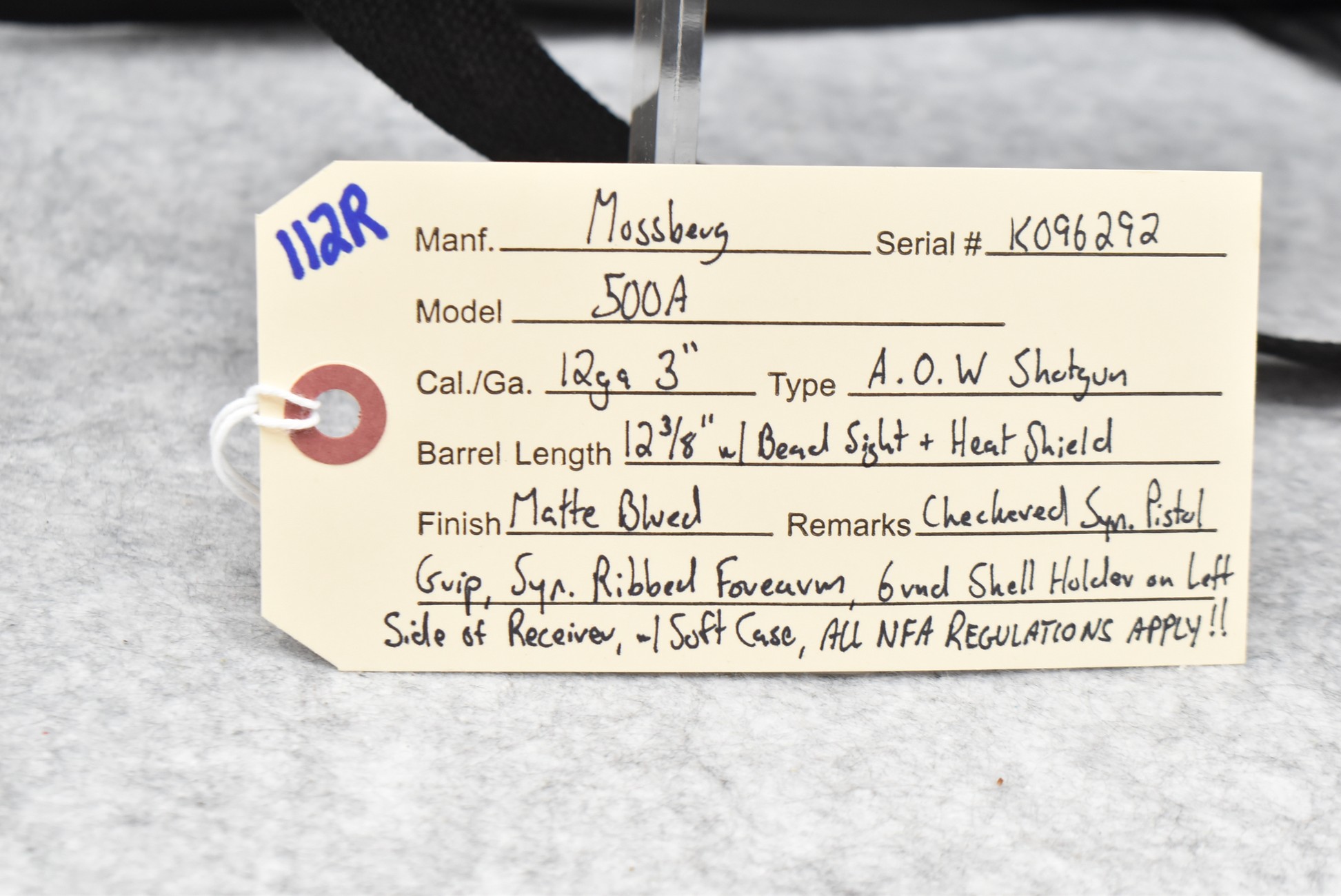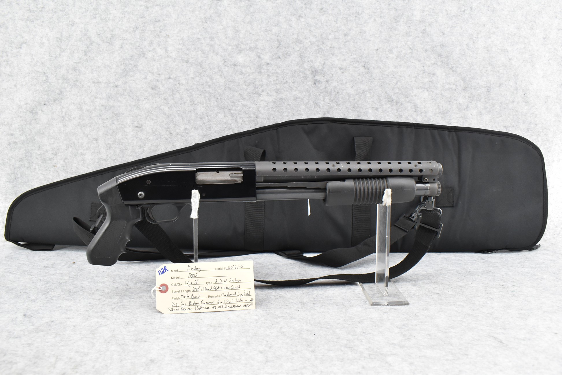 112R. Mossberg – Mod. 500A – 12ga. 3” A.O.W. Shotgun – w/12 3/8” Barrel w/Bead Sight & Heat Shield – Matte Blued Finish – w/Checkered Synthetic Pistol Grip & Synthetic Ribbed Forearm – w/6Rd Shell Holder on Left Side of Receiver – w/Soft Case – Gun is on RAS Inc. NFA Book E-File Form 3 & Form 4 – Fully Transferable Please Check Your State & Local Laws For Legality Before Attempting to Purchase This Firearm!