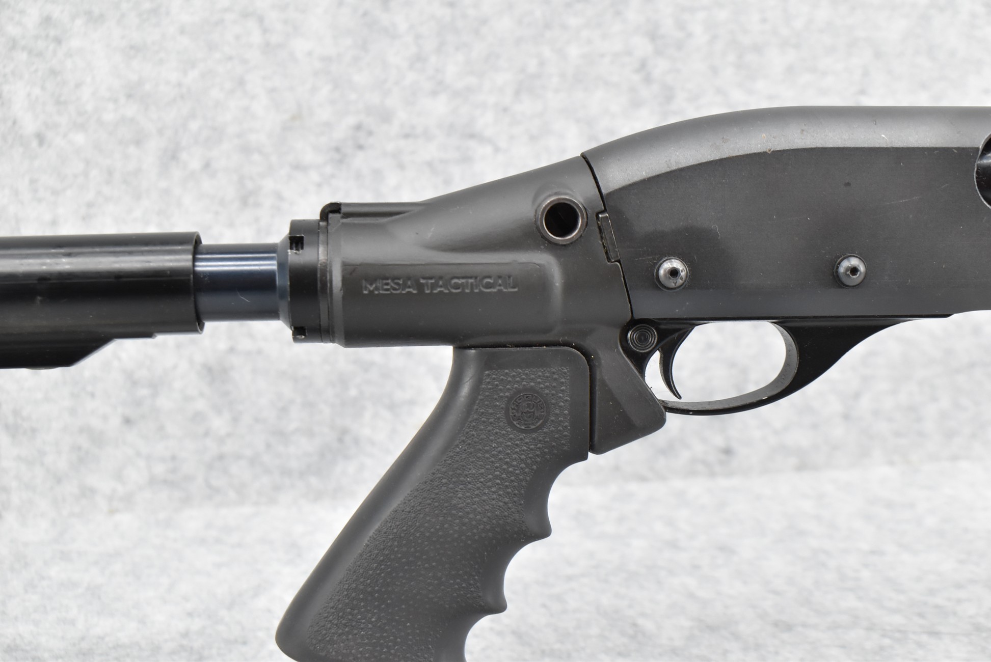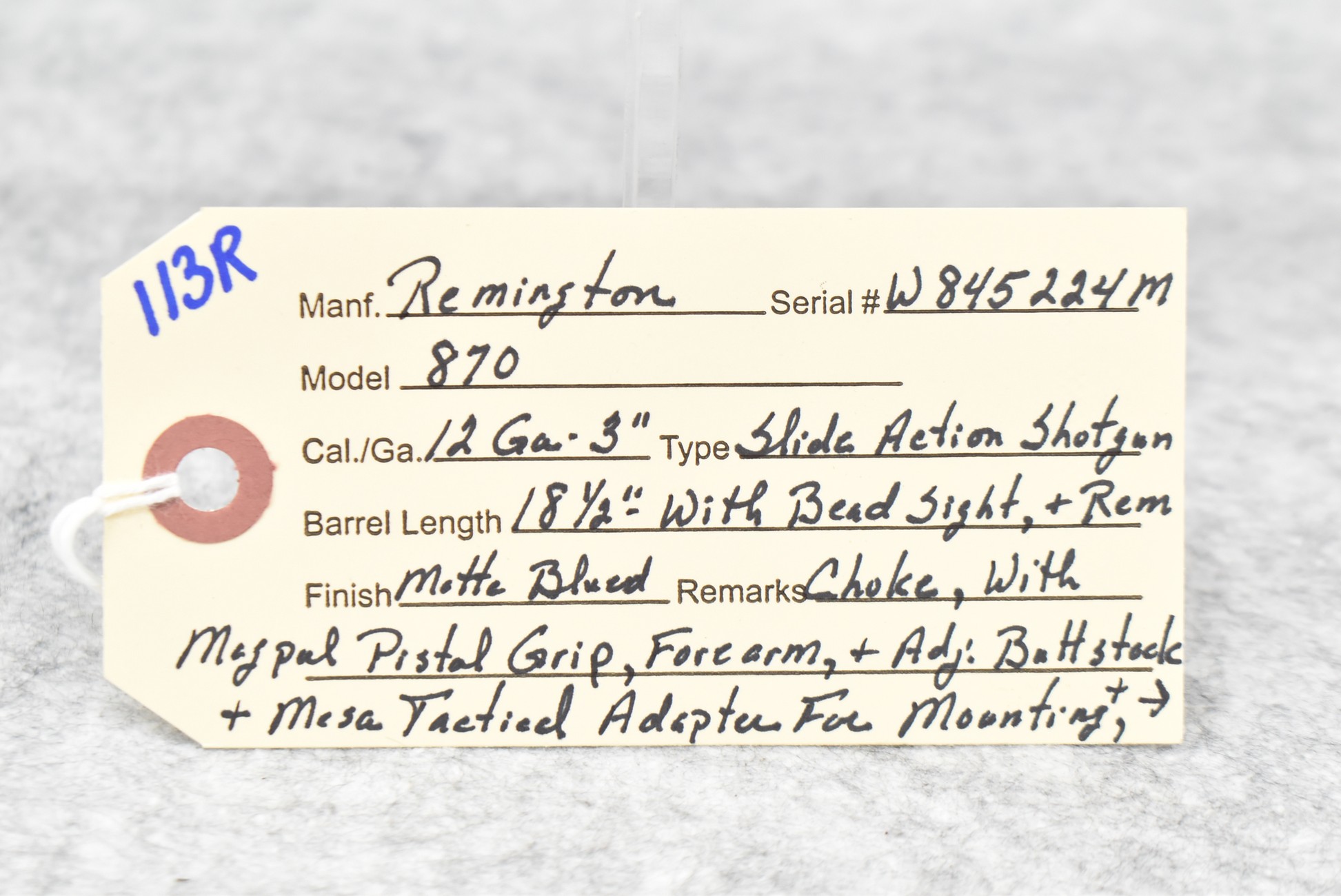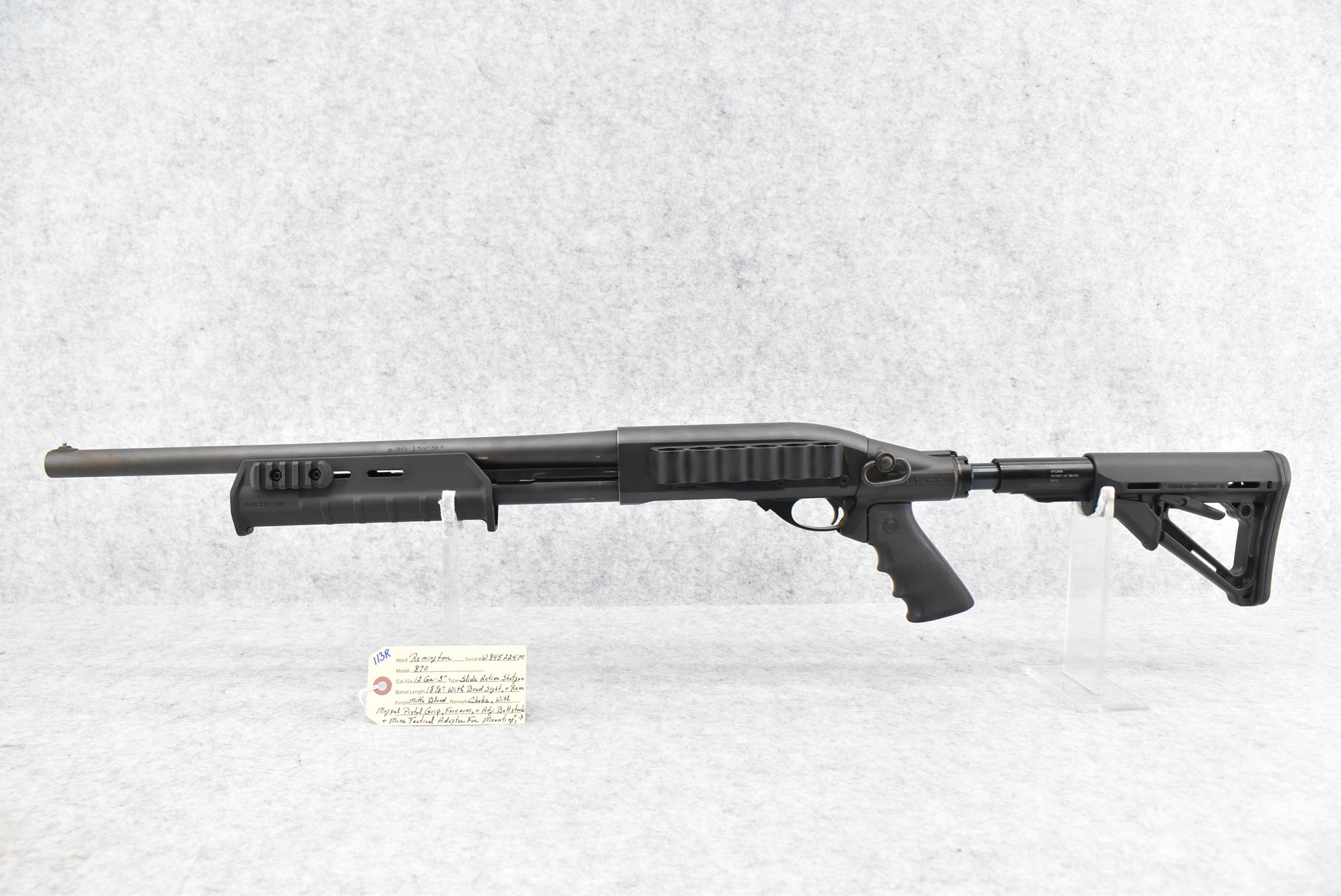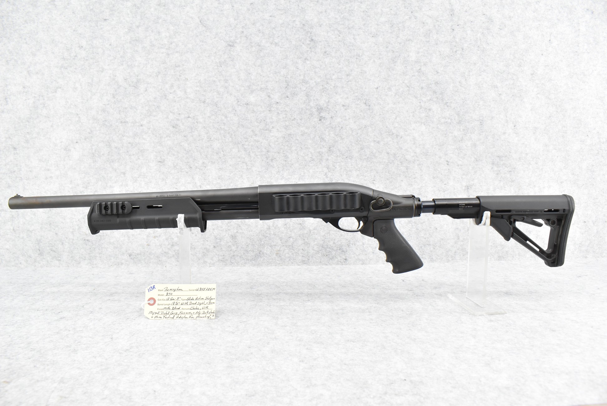 113R. Remington – Mod. 870 – 12ga. 3” Pump Action Shotgun – w/18 ½” Rem. Choke Barrel w/Bead Sight – Matte Blued Finish – w/MagPul Pistol Grip, Forearm & Adj. Butt Stock – w/Mesa Tactical Cartridges Holder