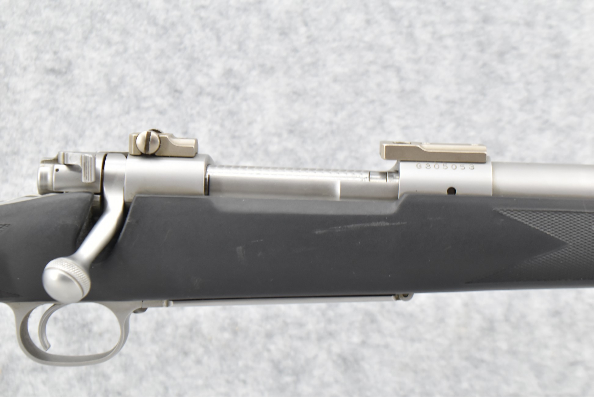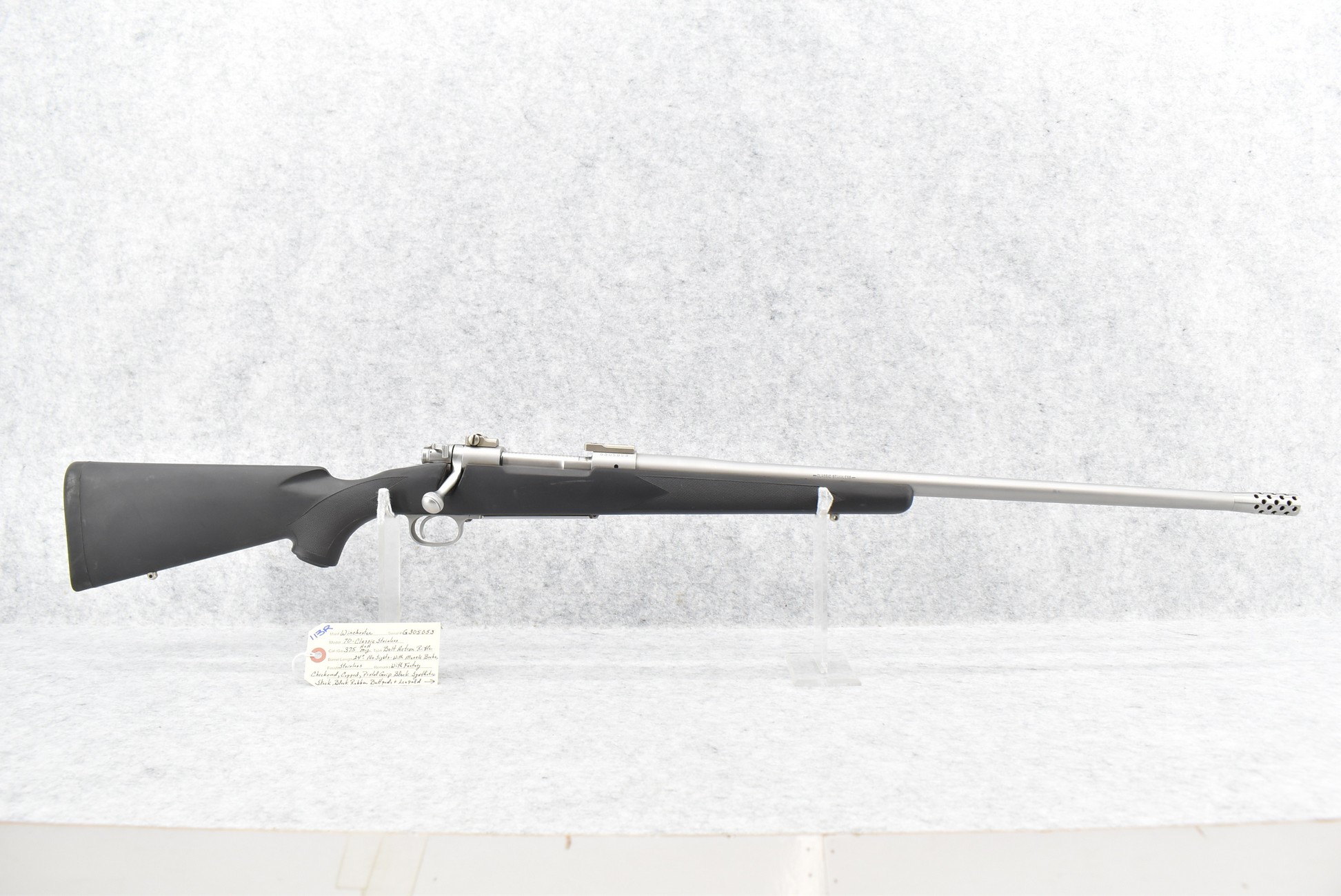 113R.     Winchester – Mod. 70 Classic Stainless – 375 H&H Mag. Cal. Bolt Action Rifle – w/24” Barrel w/Muzzle Break and No Sights – Stainless Finish – w/Factory Checkered Capped Pistol Grip Black Synthetic Stock w/Black Rubber Butt Pad – w/Leupold Stainless Mounting Bases for Optics – 375 H&H Mfg. 2001-2002 Only