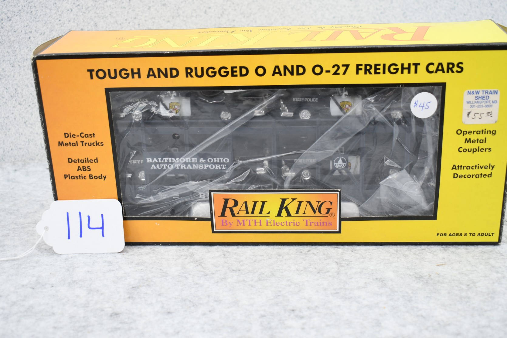 114. MTH O gauge train car, 30-76067 Baltimore & Ohio auto carrier w/4 MD police cars. NIB