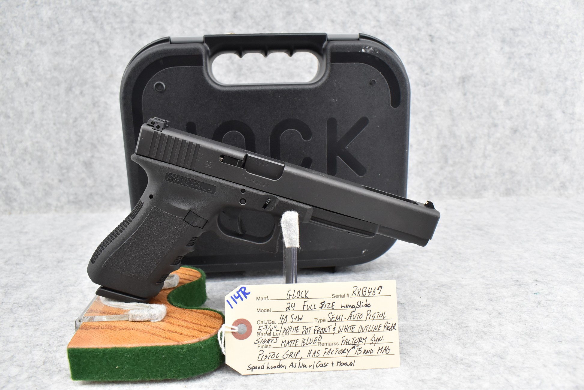 114R. Glock – Mod. 24 (Full Size, Long Slide) – 40 S&W Cal. Semi-Auto Pistol – w/5 ¾” Barrel w/White Dot Front & White Outlined Rear Sights – Matte Blued Finish – w/2 Factory 15Rd Mags – As New w/Case, Manual & Speed Loader