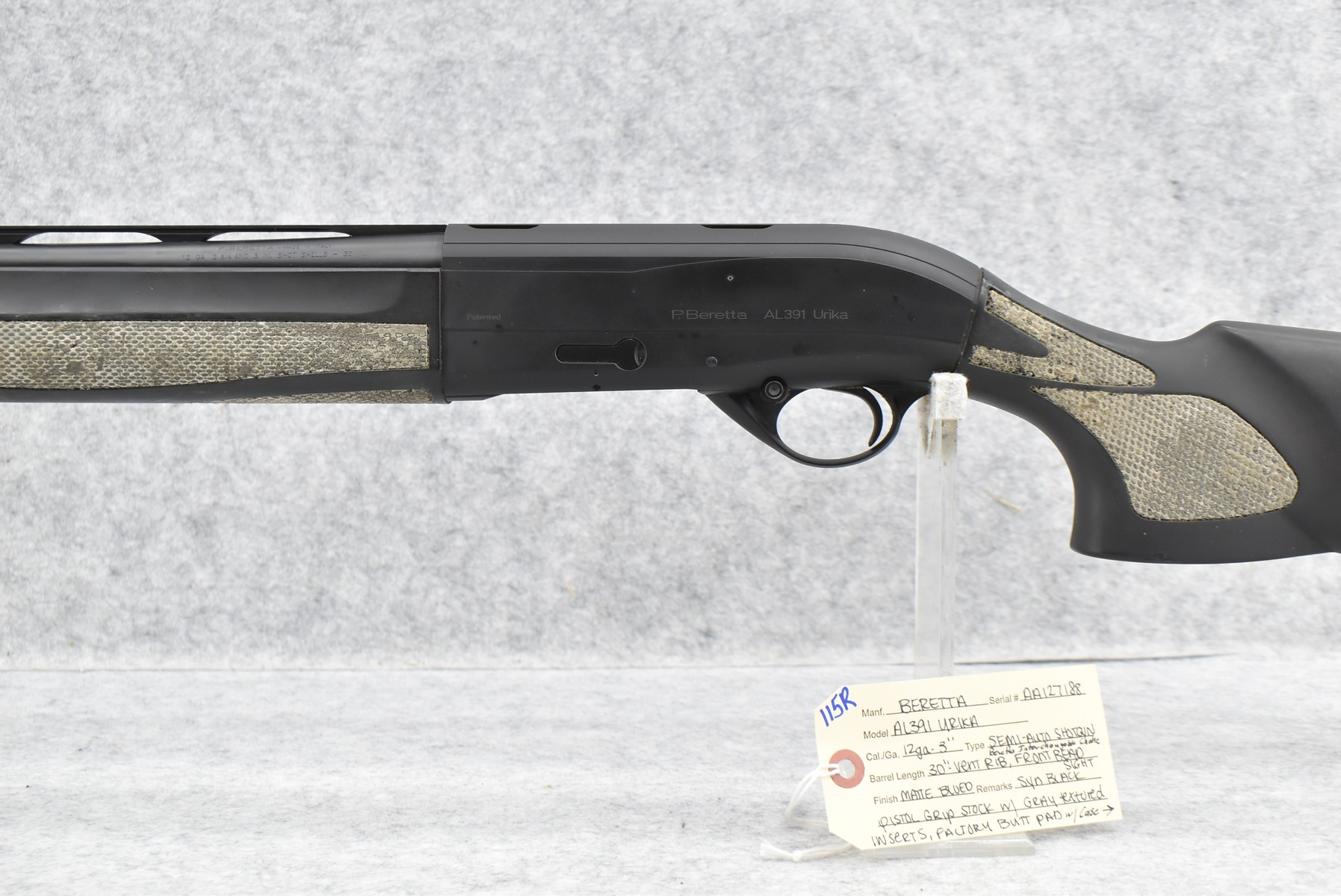 115R. Beretta – Mod. AL391 Urika – 12ga. 3” Semi-Auto Shotgun – w/30” Beretta Interchangeable Choke, Vent-Rib Barrel w/Front Bead Sight – Matte Blued Finish – w/Synthetic Black Pistol Grip Stock w/Gray Textured Inserts w/Factory Butt Pad – w/Case, Chokes & Wrench – w/Manuals