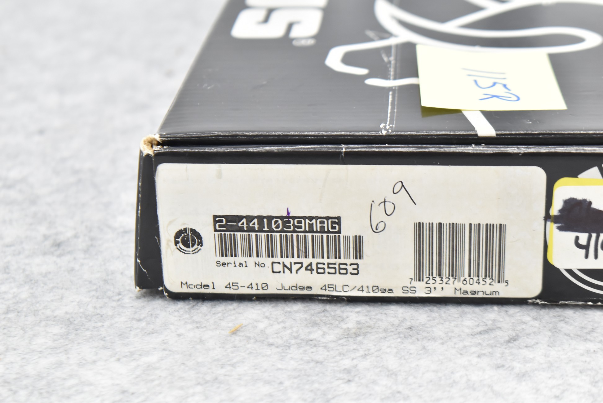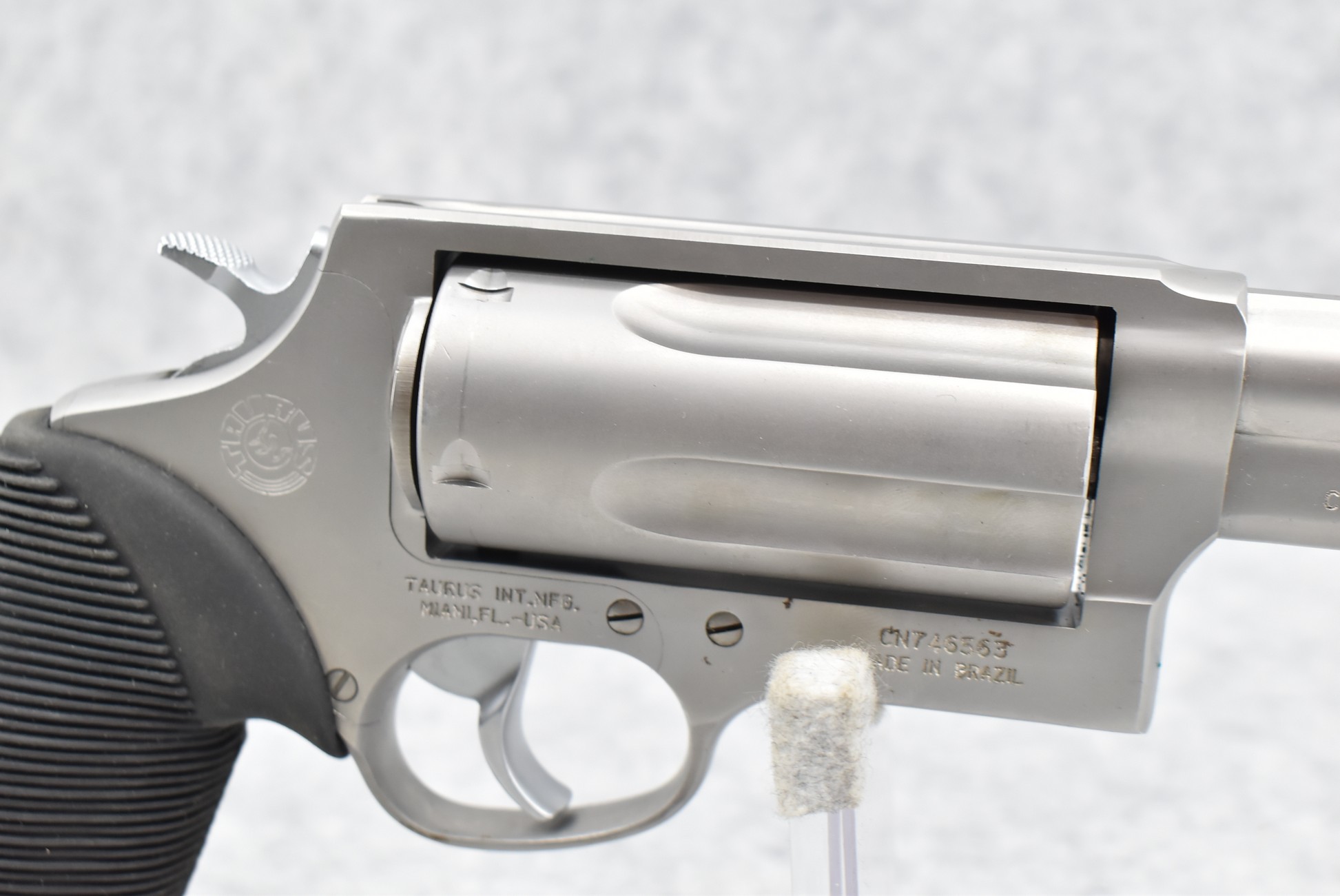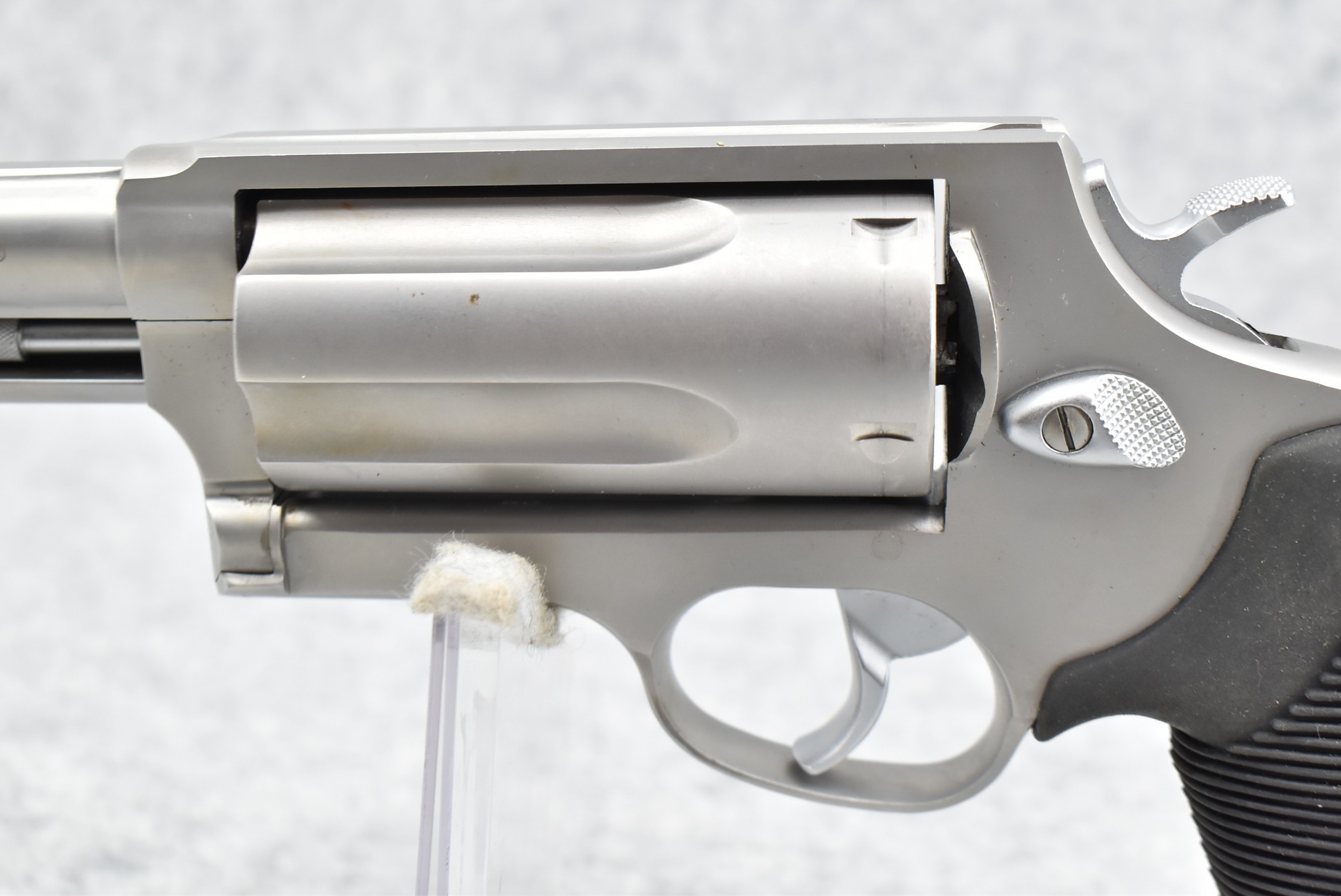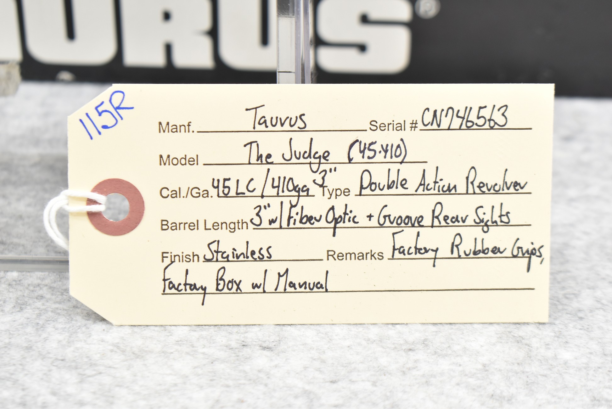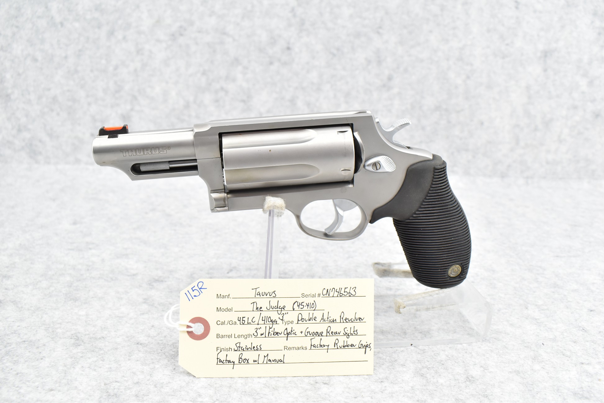 115R. Taurus – Mod. The Judge (45-410) – 45LC Cal./410ga. 3” Double Action Revolver – w/3” Barrel w/Fiber Optic Front & Groove Rear Sights – Stainless Finish – w/Factory Rubber Grips – w/Factory Box & Manual