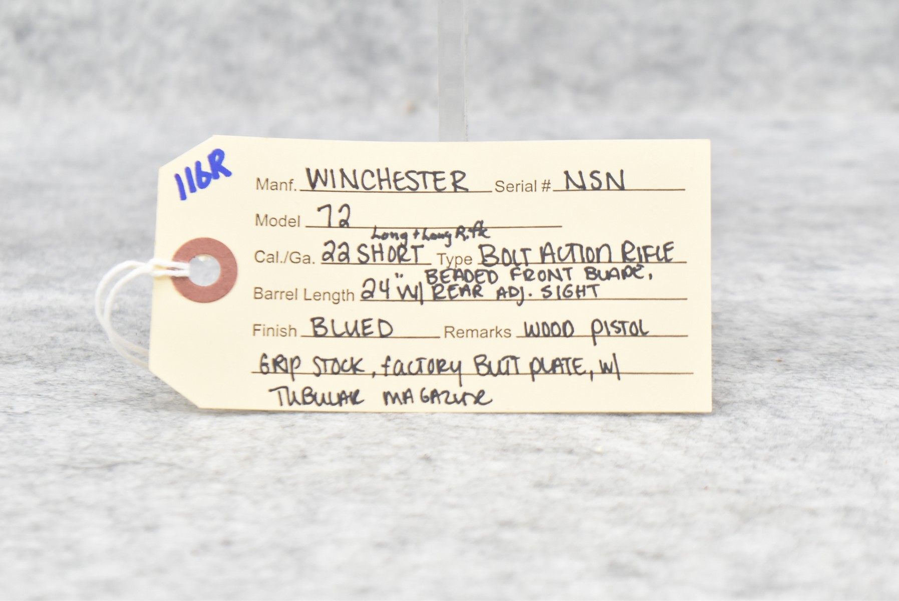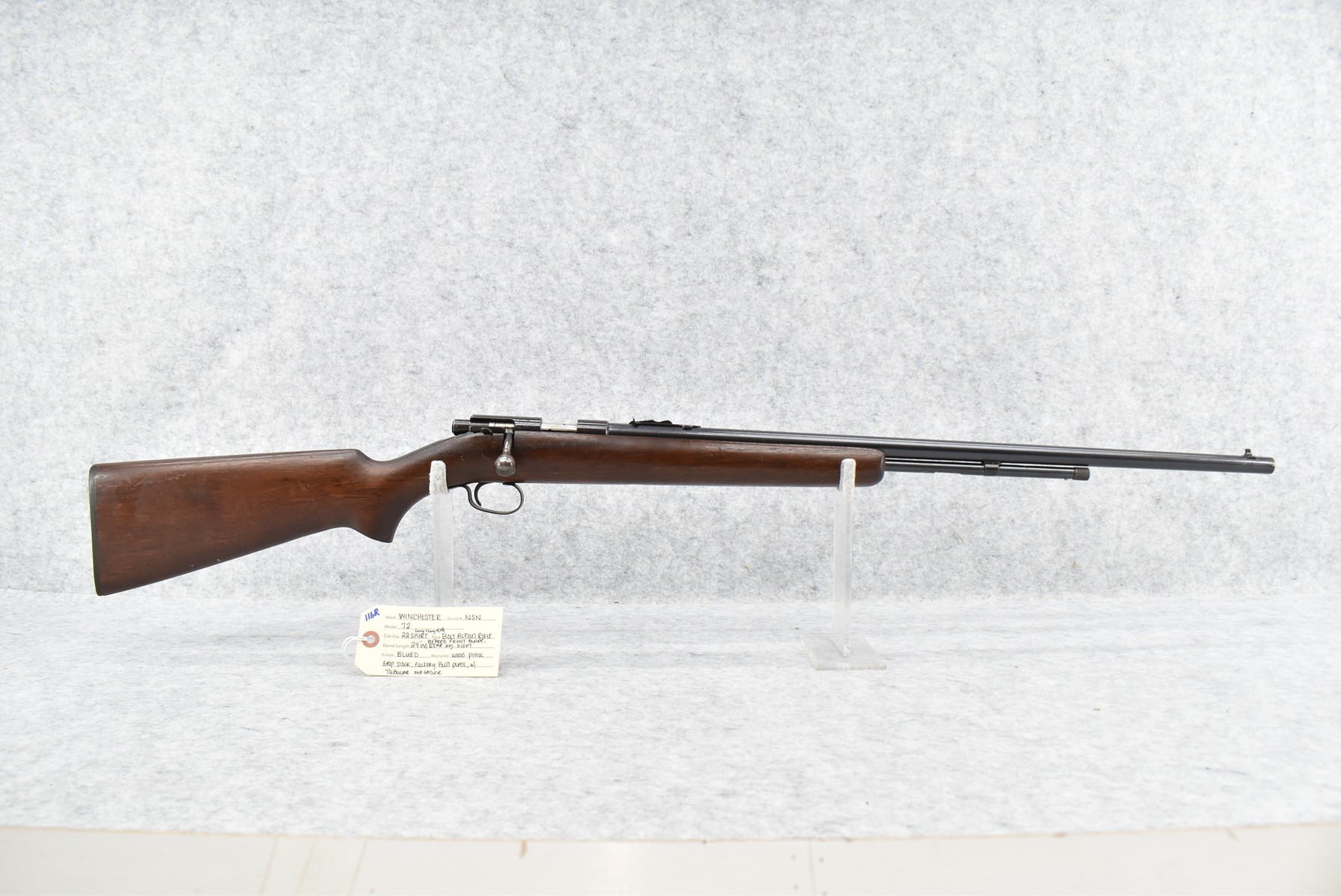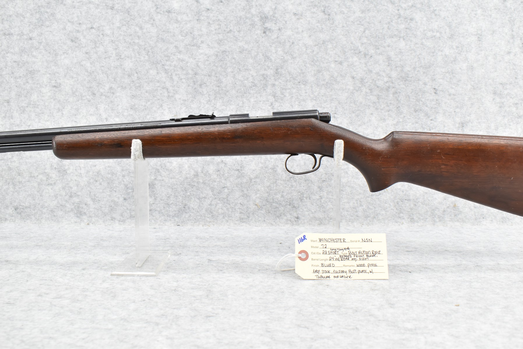 116R. Winchester – Mod. 72 – 22 Cal. Bolt Action Rifle – w/24” Barrel w/Beaded Front Blade & Rear Adj. Sights w/Tubular Magazine – Blued Finish – w/Pistol Grip Wood Stock w/Factory Butt Plate