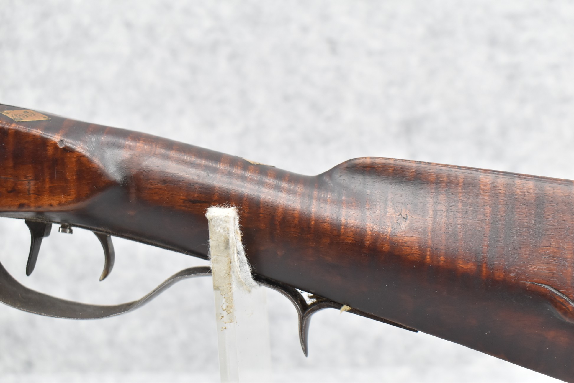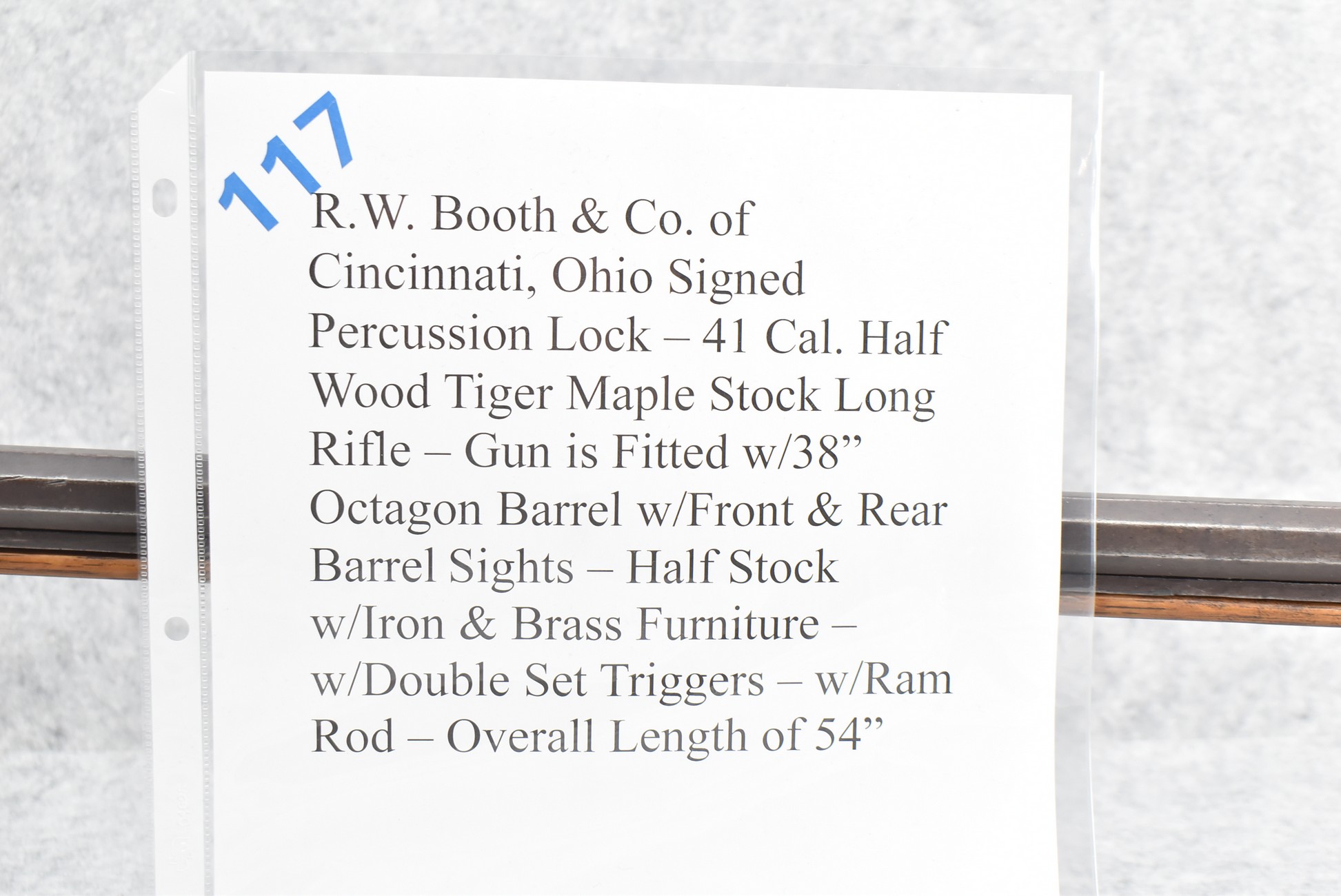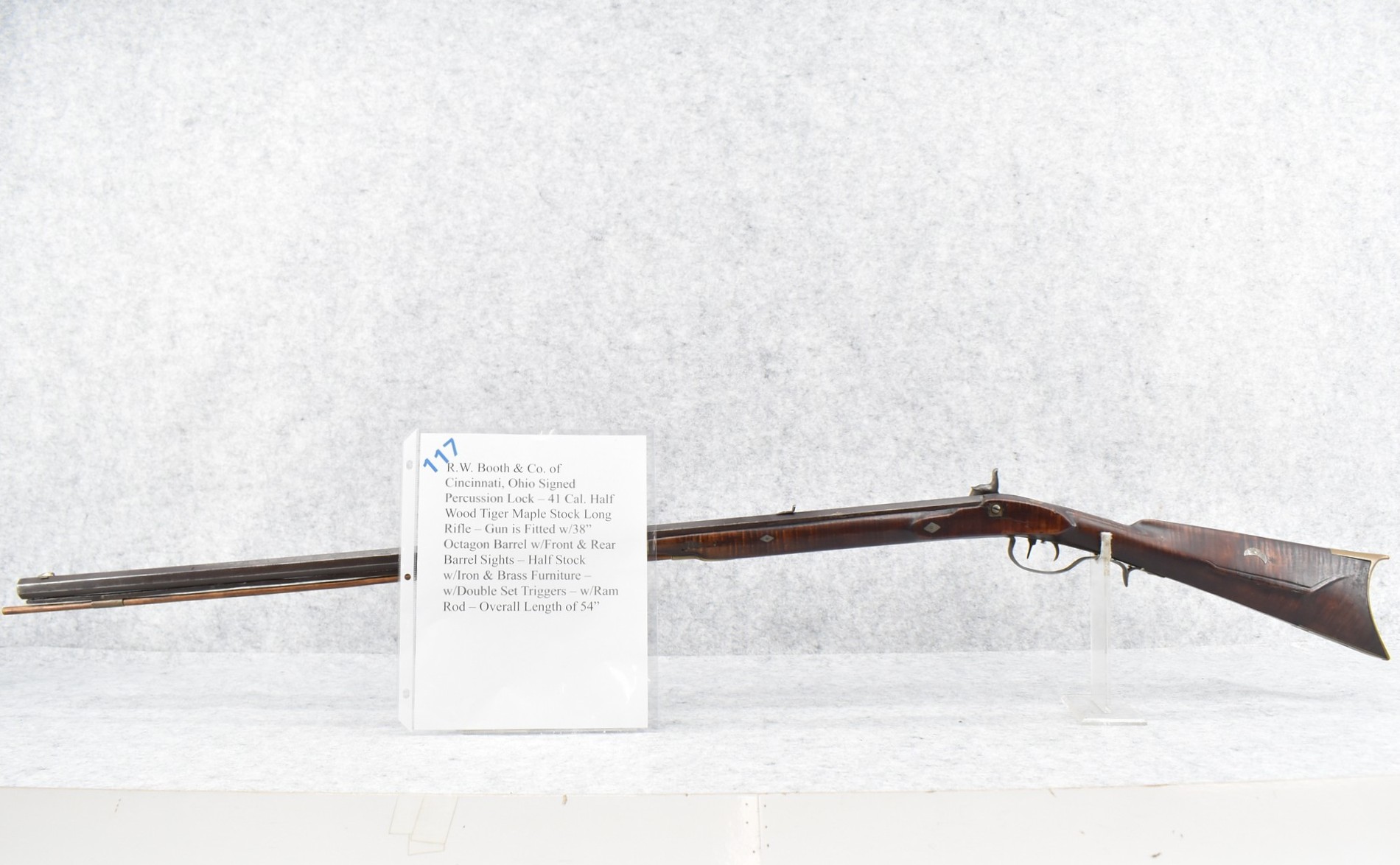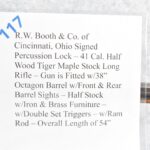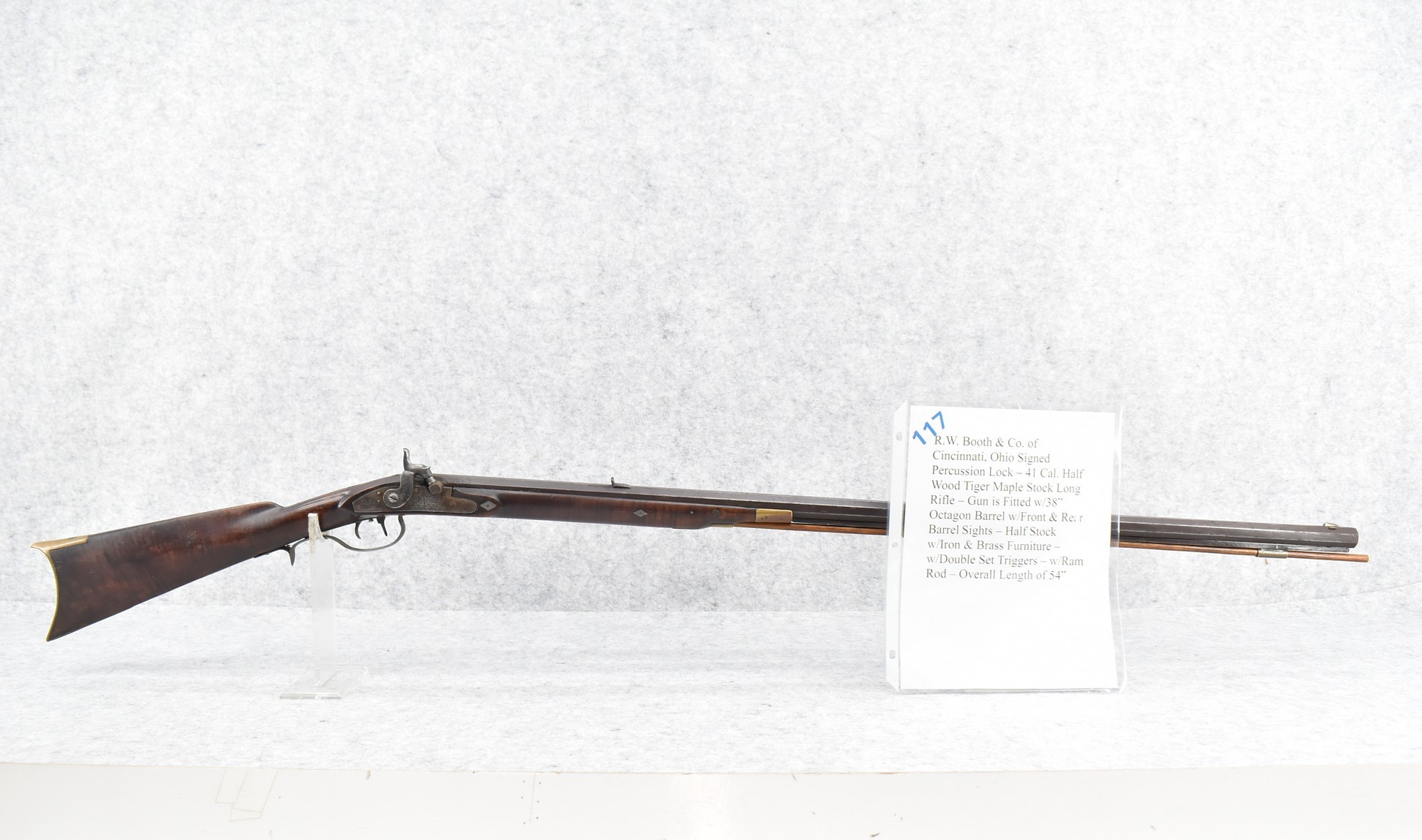 117. R.W. Booth & Co. of Cincinnati, Ohio Signed Percussion Lock – 41 Cal. Half Wood Tiger Maple Stock Long Rifle – Gun is Fitted w/38” Octagon Barrel w/Front & Rear Barrel Sights – Half Stock w/Iron & Brass Furniture – w/Double Set Triggers – w/Ram Rod – Overall Length of 54”