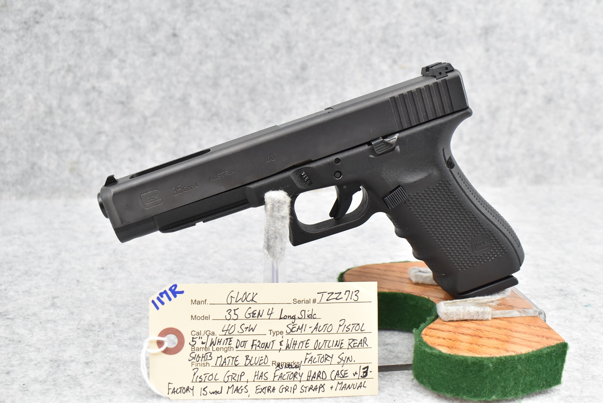 117R. Glock – Mod. 35 Gen. 4 (Long Slide) – 40 S&W Cal. Semi-Auto Pistol – w/5” Barrel w/White Dot Front & White Outline Rear Sights – Matte Blued Finish – w/Factory Synthetic Pistol Grip – w/Factory Hard Case, 3 Factory 15Rd Mags, Extra Grip Straps & Manual