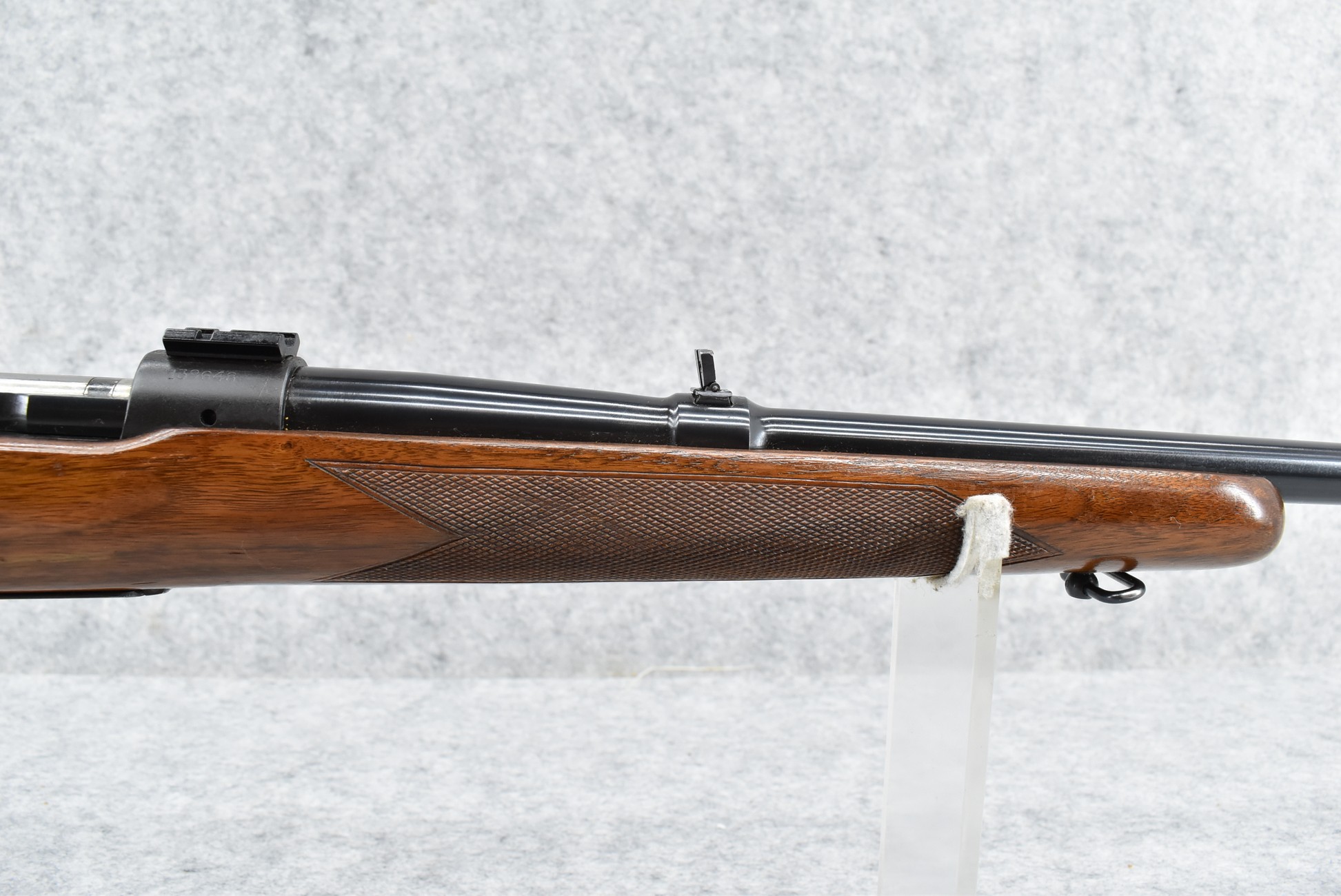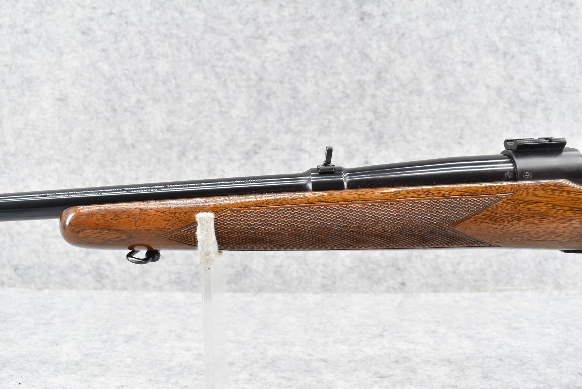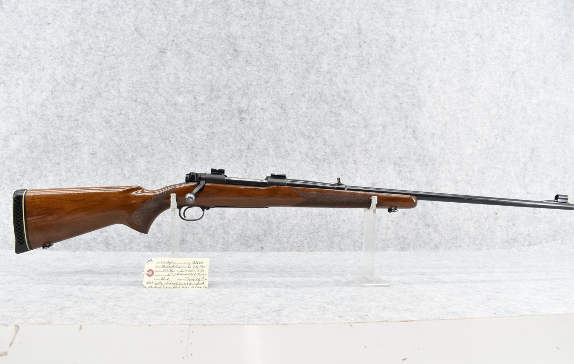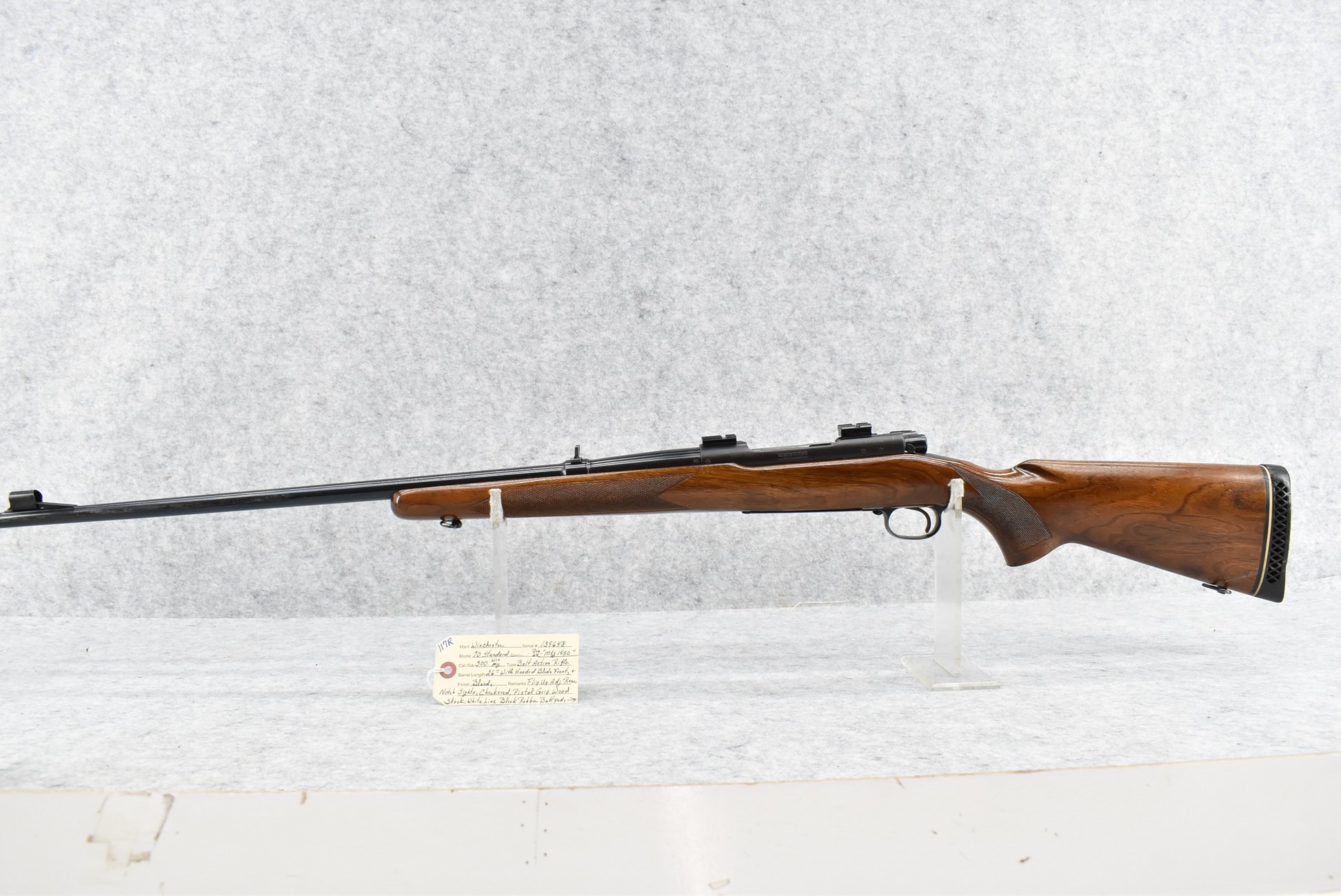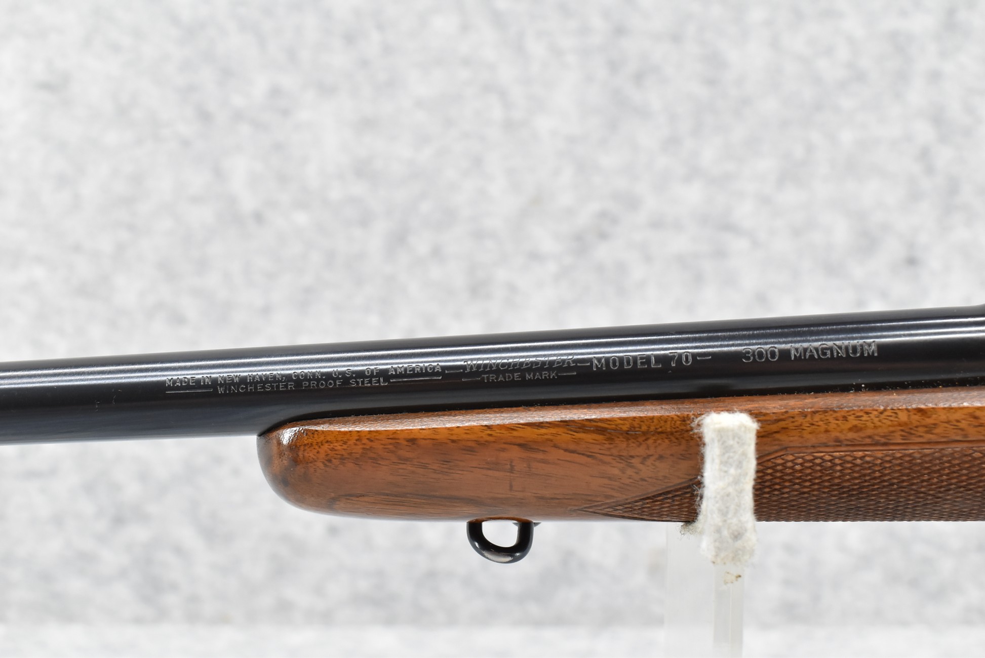 117R. Winchester – Mod. 70 Standard (Pre-64) – 300 Win. Mag. Cal. Bolt Action Rifle – w/26” Barrel w/Hooded Blade Front & Flip Up Adj. Rear Notch Sights – Blued Finish – w/Checkered Pistol Grip Wood Stock w/White Line Butt Pad – w/Sling Loops – w/2pc. Bases – Mfg. 1950