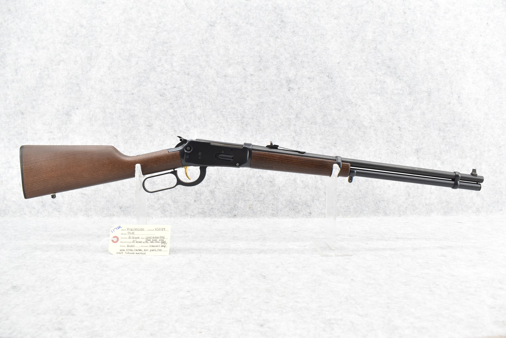 117R. Winchester – Mod. 94AE – 30-30 Win. Cal. Lever Action Rifle – w/20” Round Barrel w/Blade Front and Adjustable Rear Semi-Buckhorn Sights – Blued Finish – w/Straight Grip Wood Stocks w/Factory Butt Plate – w/Full Length Tubular Magazine – w/Box & Manual